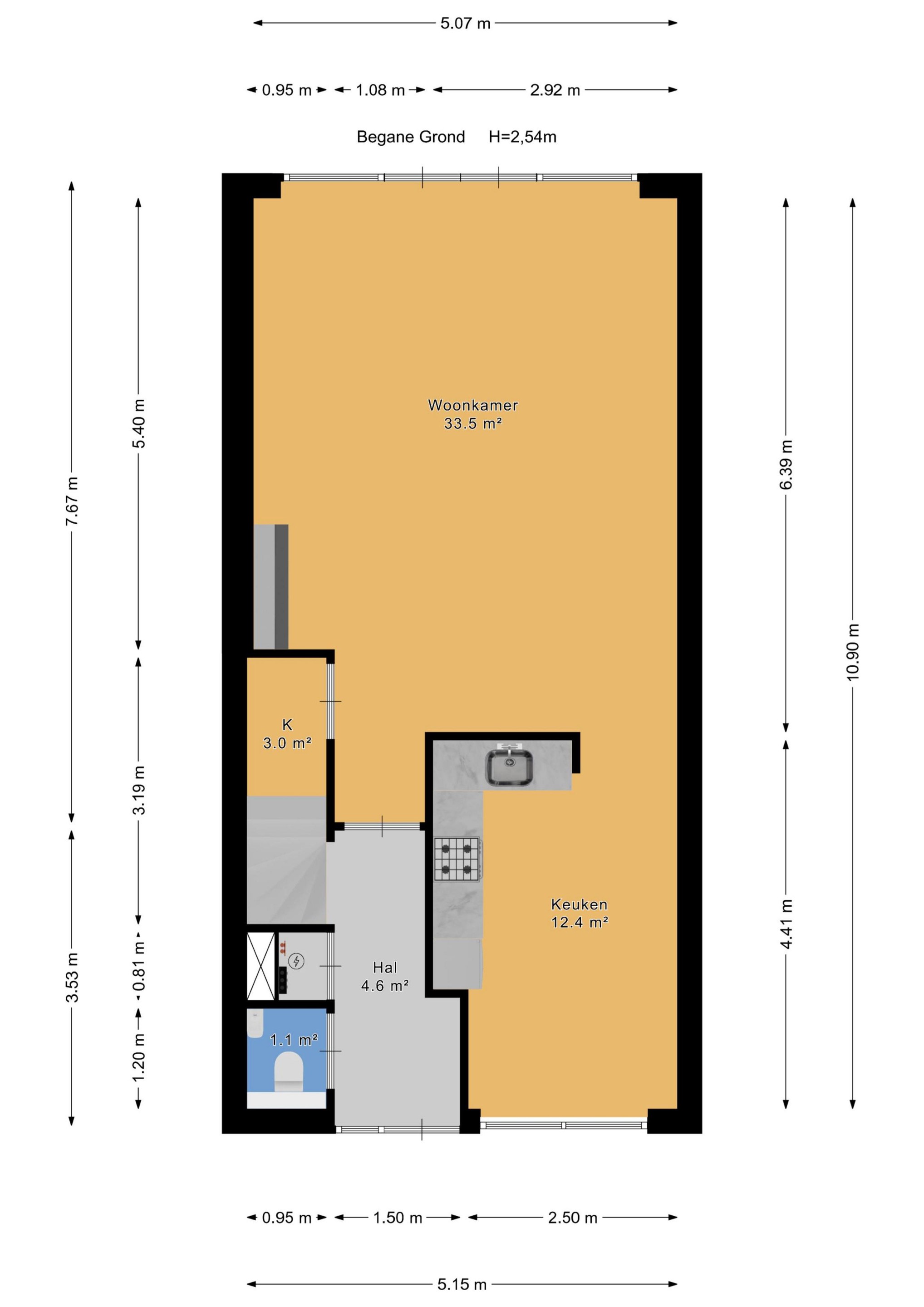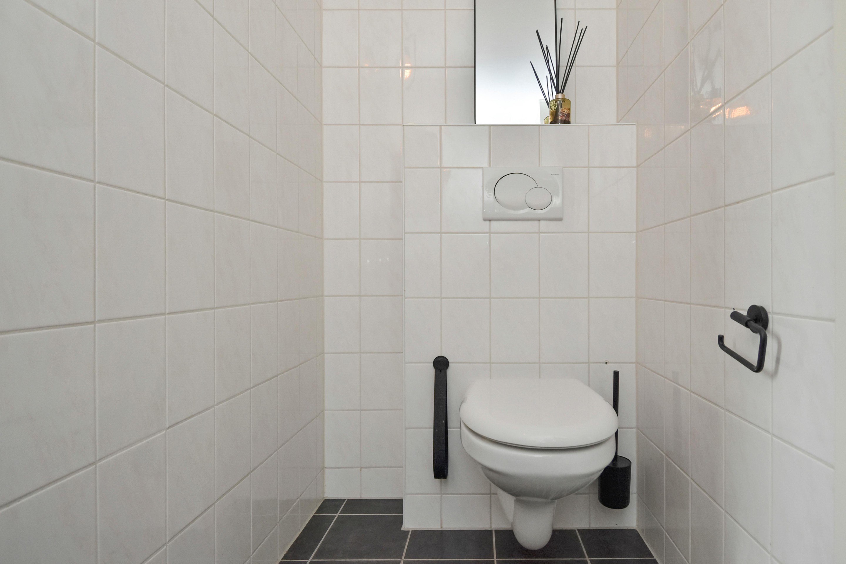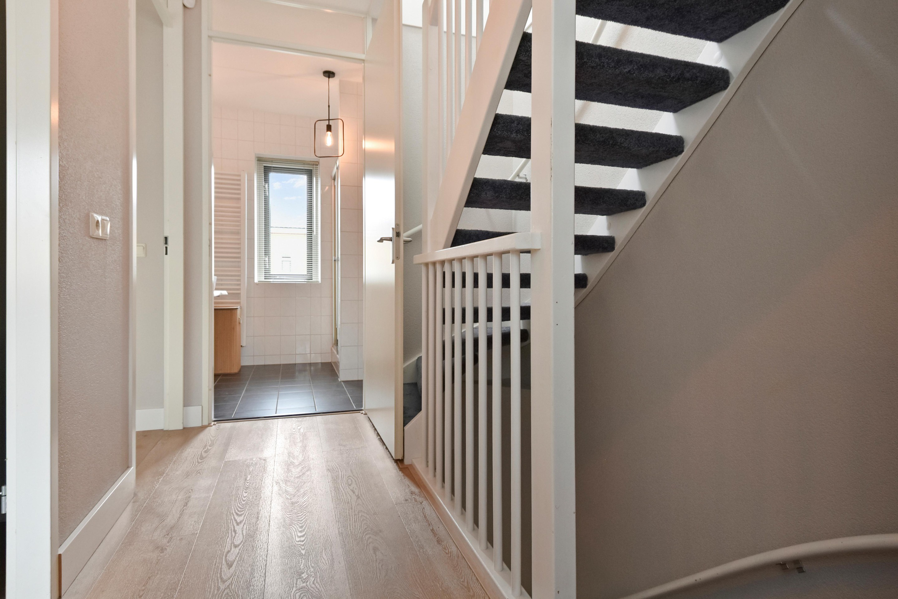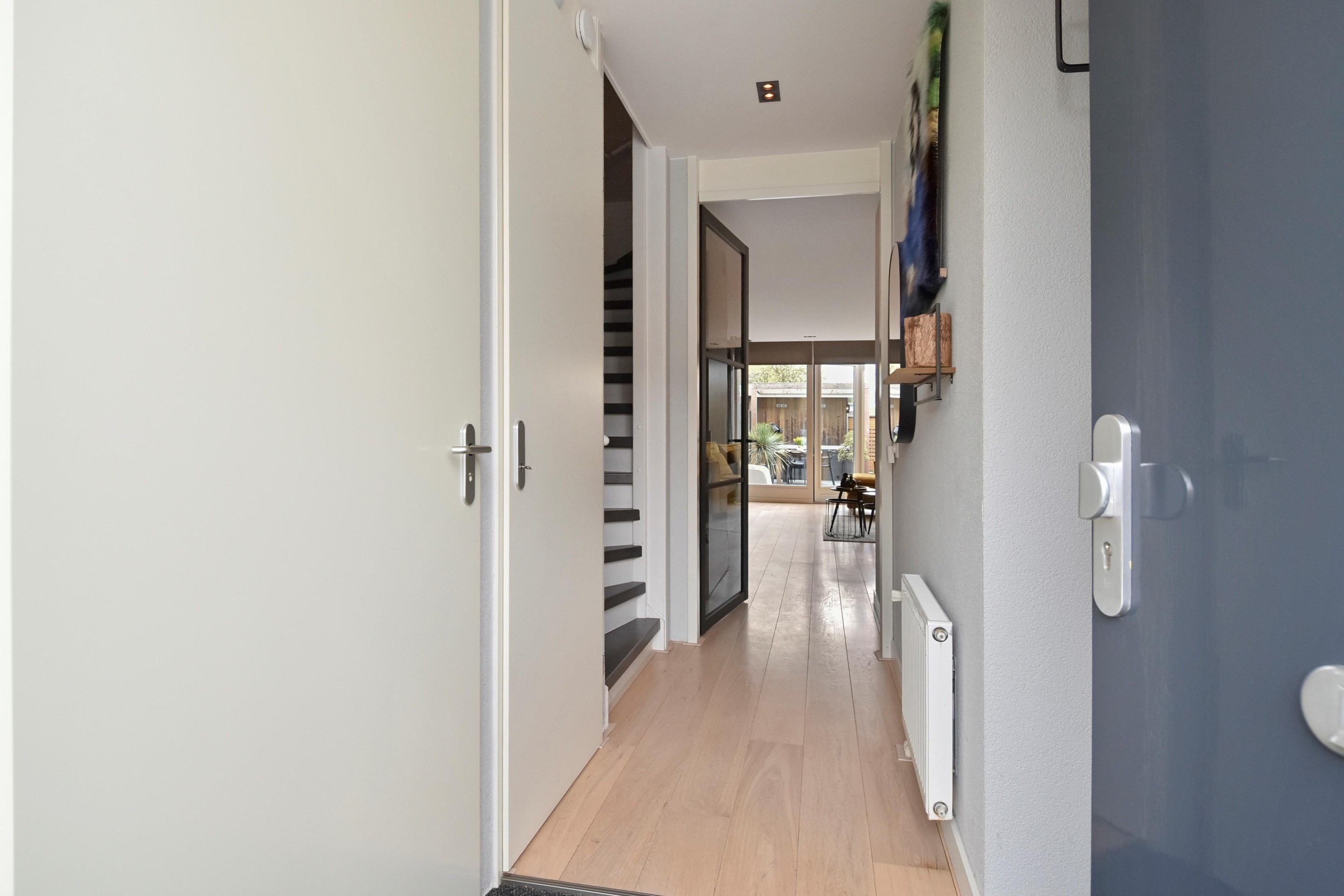 Via de verzorgde voortuin bereikt u de overdekte entree. De hal is voorzien van een meterkast, garderobe, modern betegeld toilet met wandcloset en fonteintje, trapopgang en toegang tot de woonkamer.