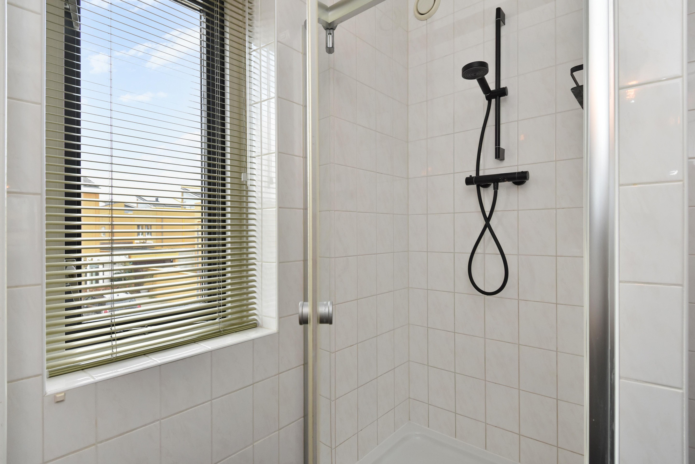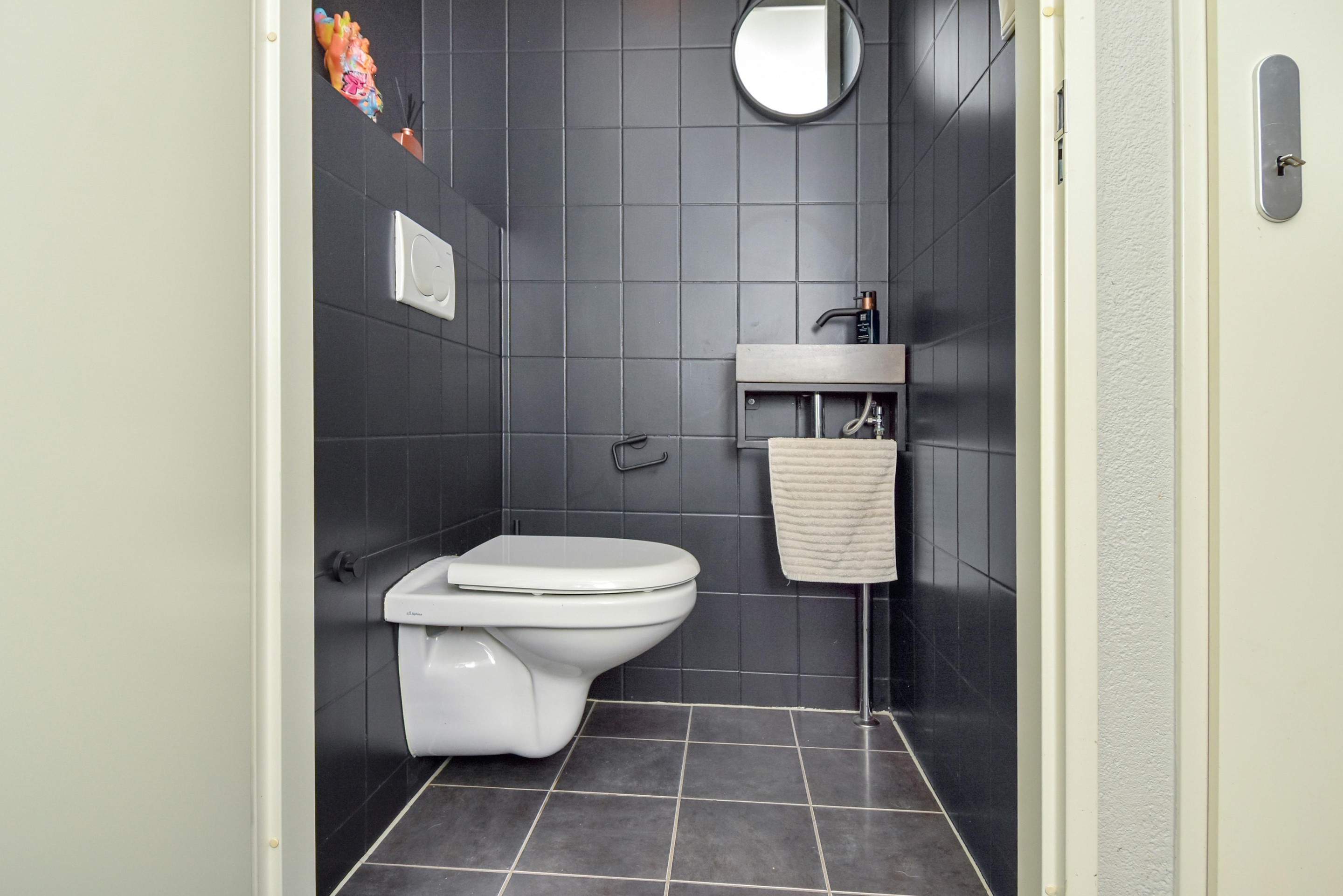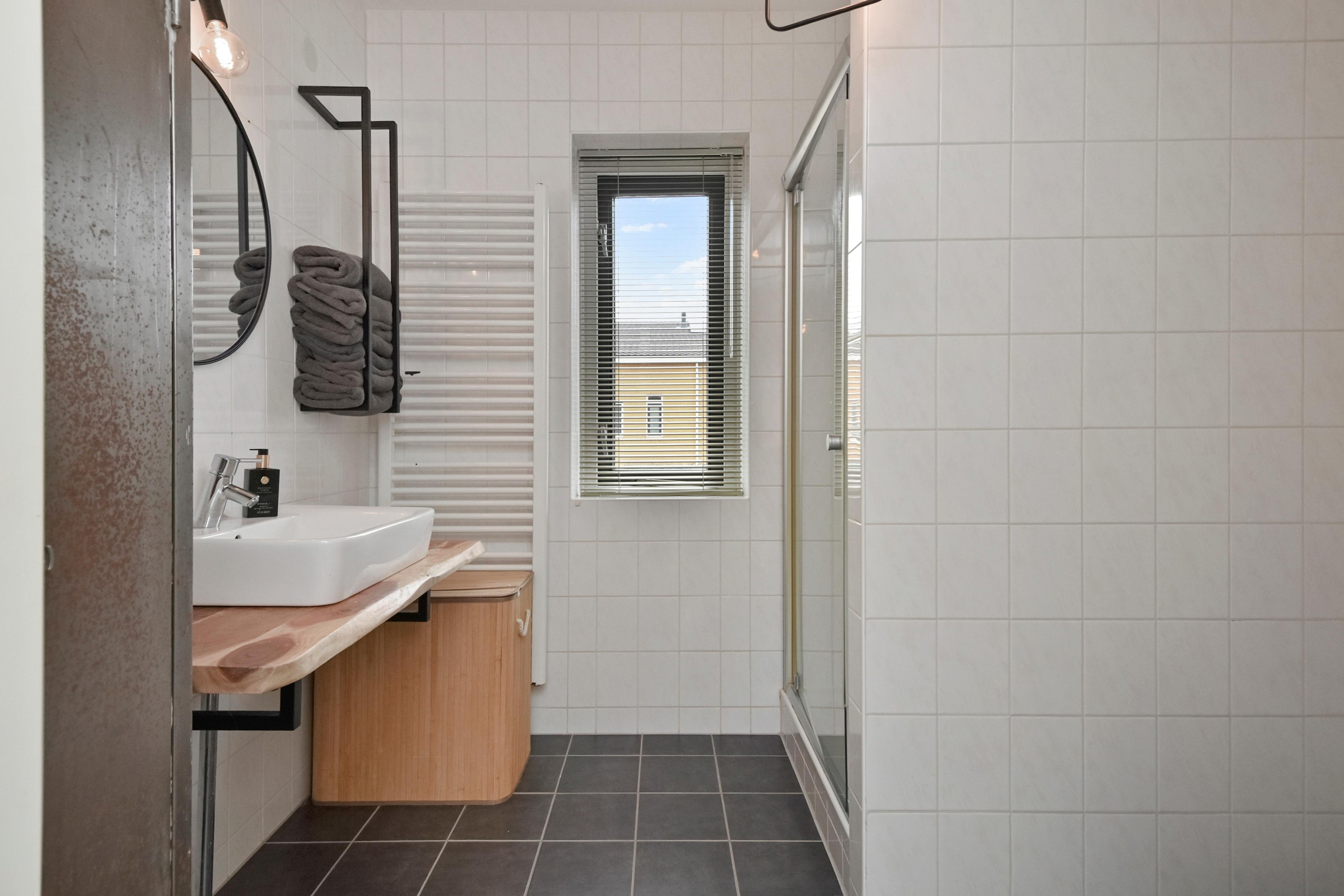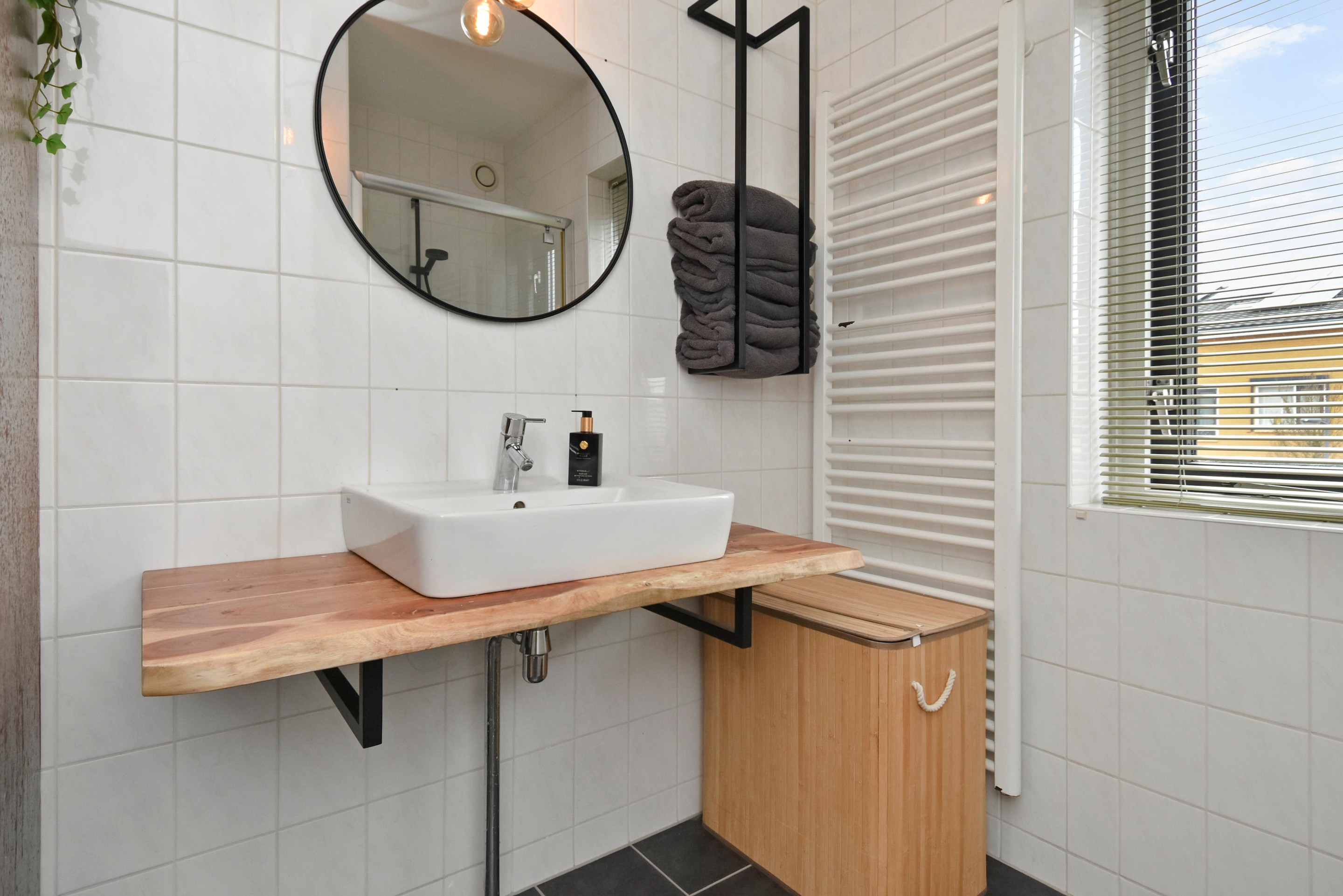De badkamer is volledig betegeld, uitgevoerd in neutrale kleuren en voorzien van een douche, wastafelmeubel, designradiator, tweede toilet en een te openen raam.