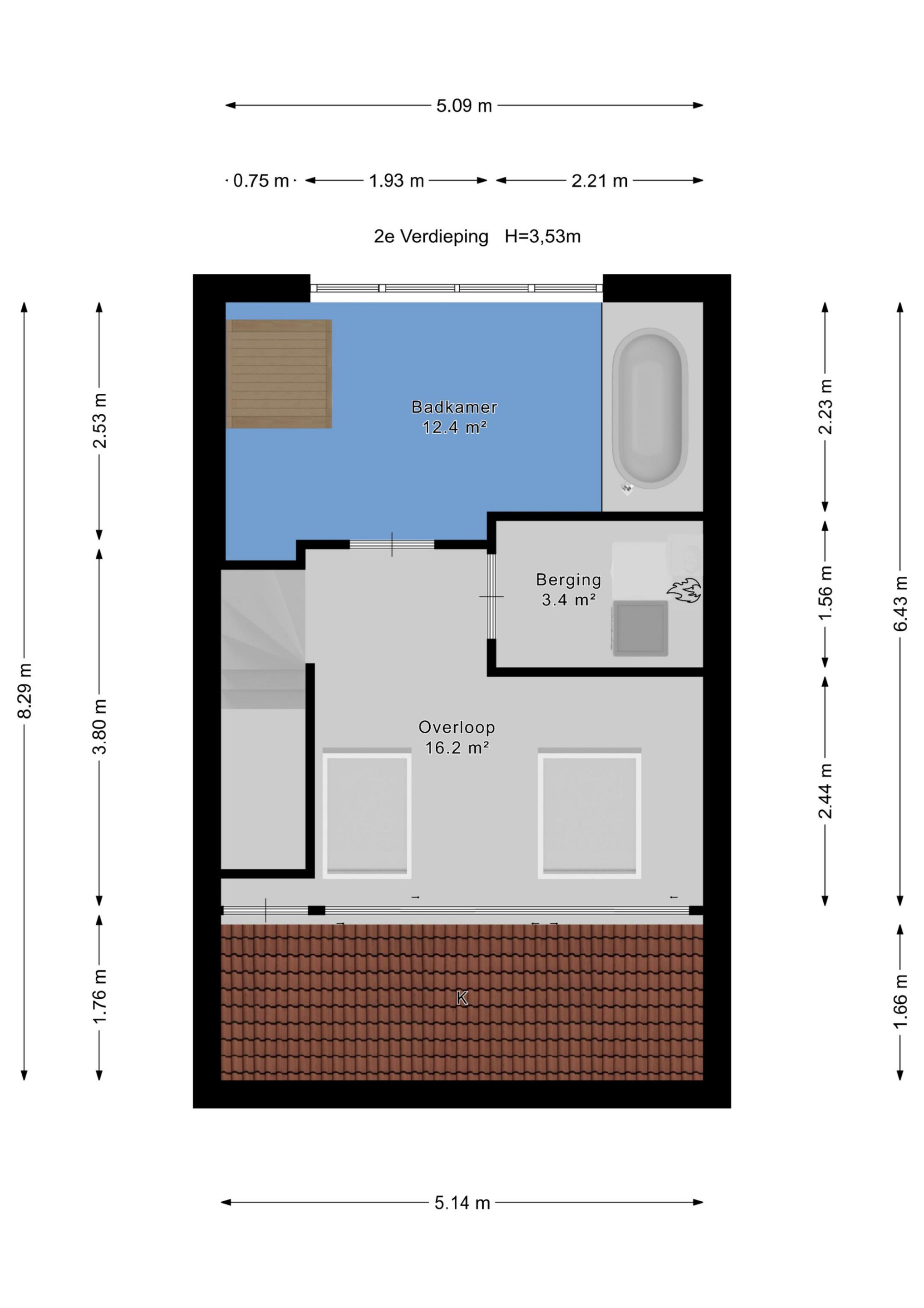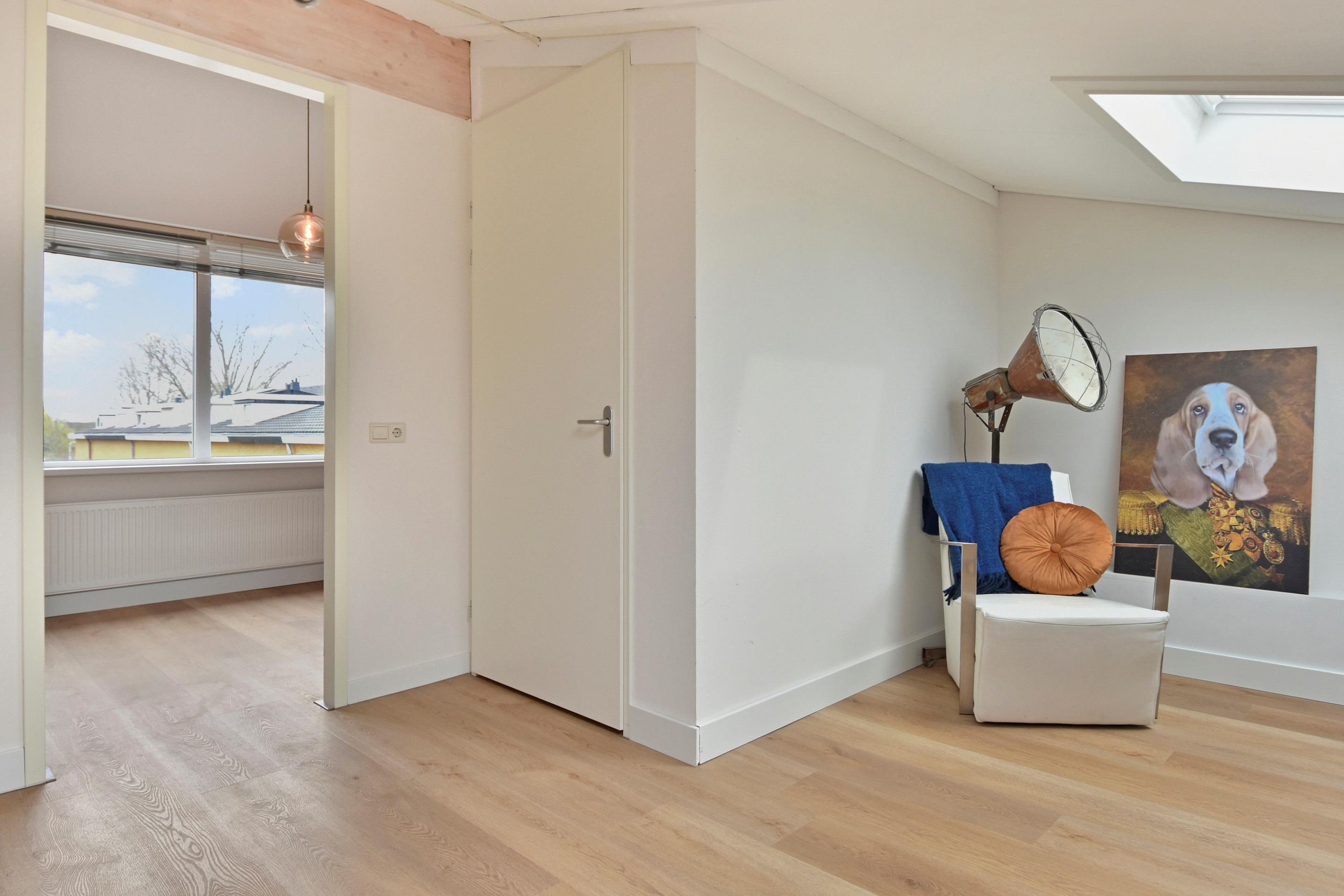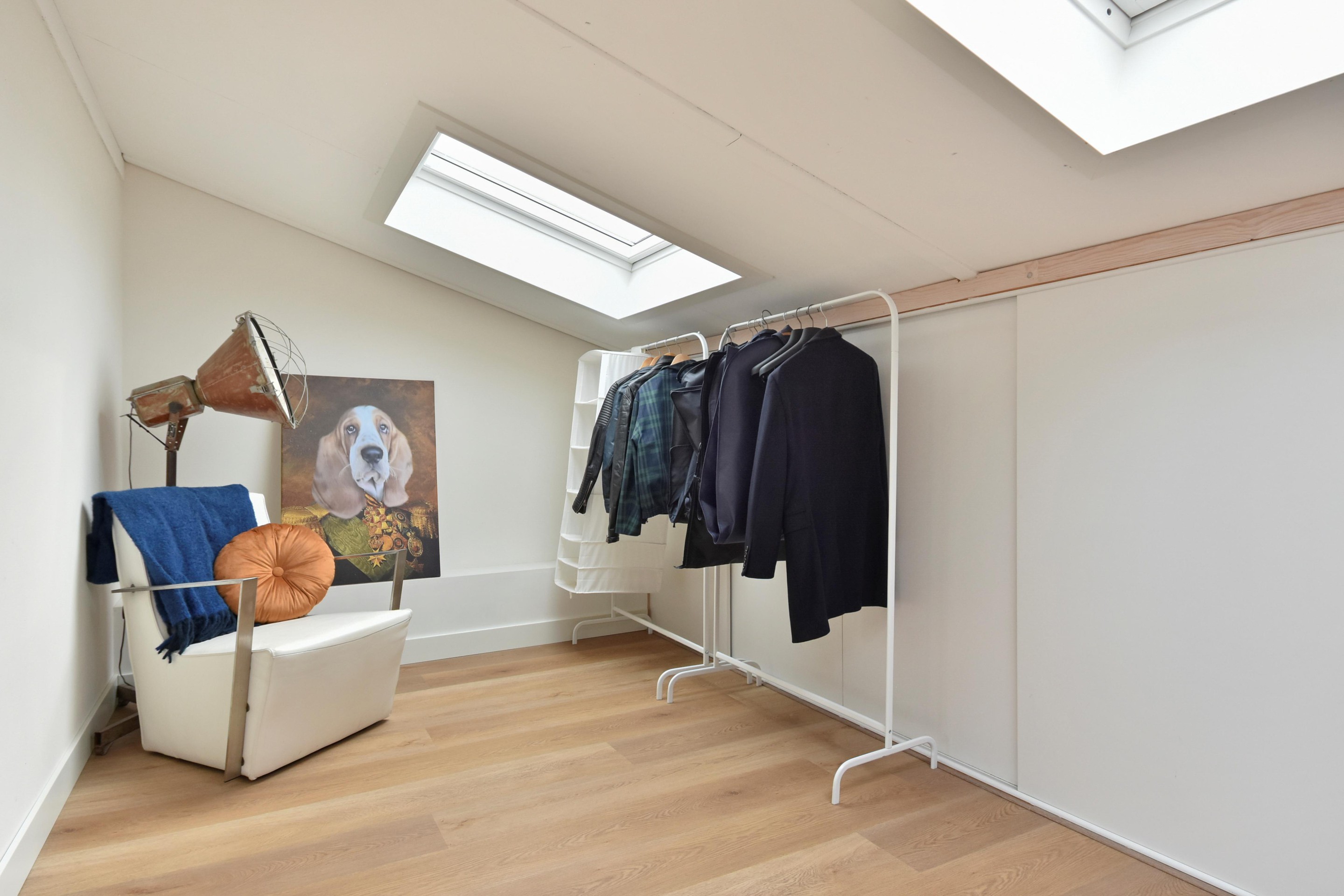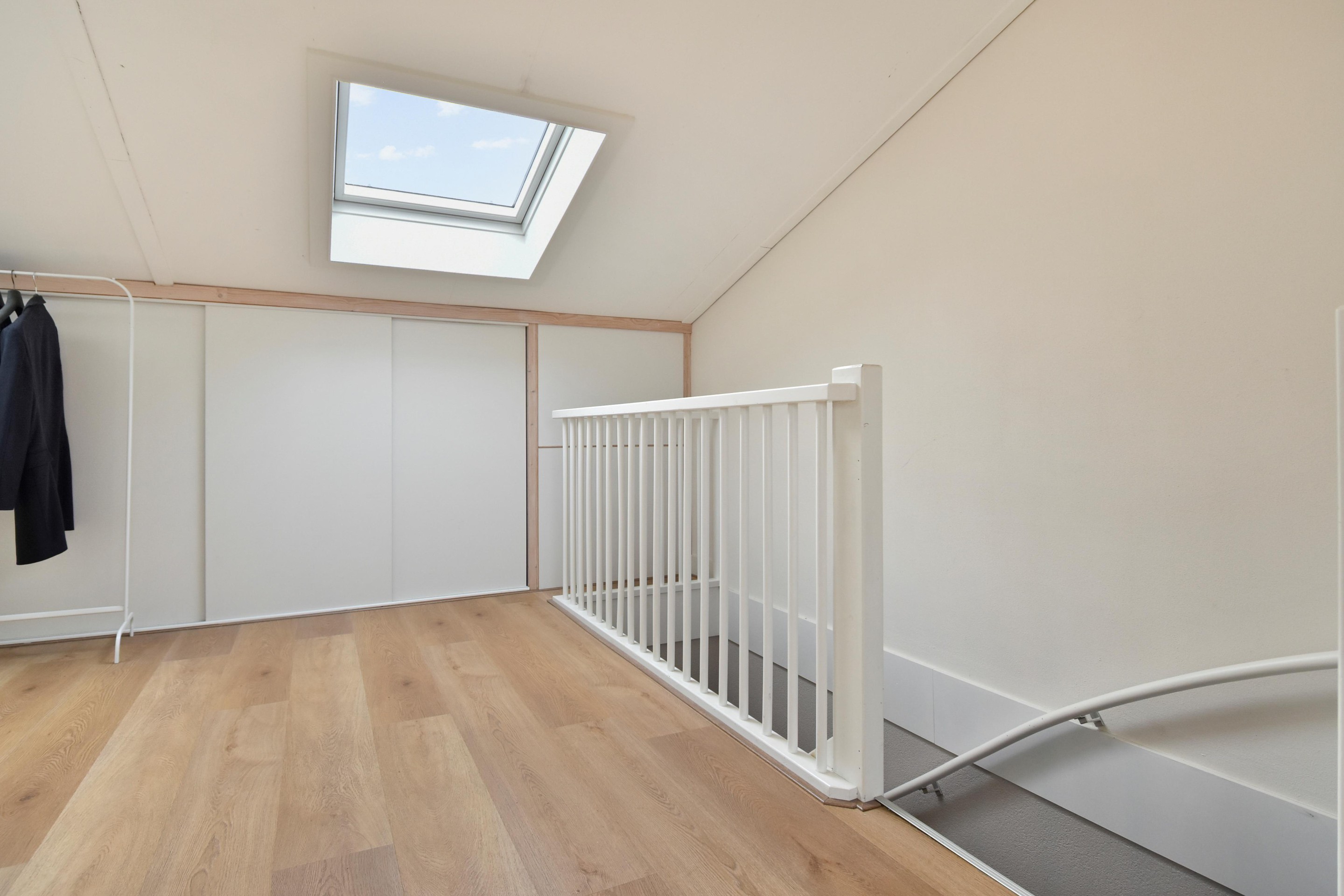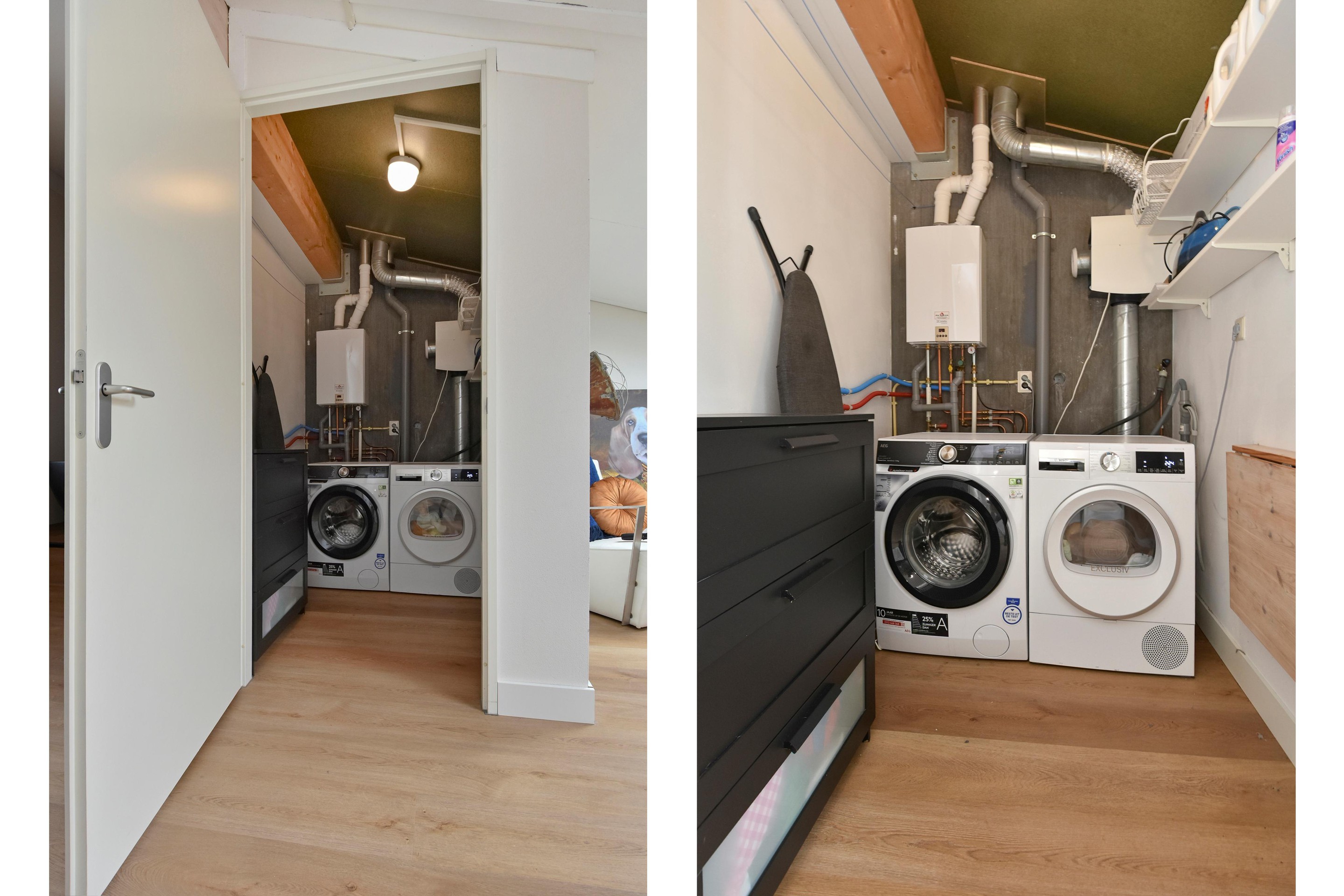 De ruime overloop beschikt over een Velux dakraam en een vaste kast met opstelling van de cv-ketel en aansluitingen voor wasmachine en droger. Deze ruimte biedt mogelijkheden voor het creëren van een extra kamer, bijvoorbeeld met een dakkapel.