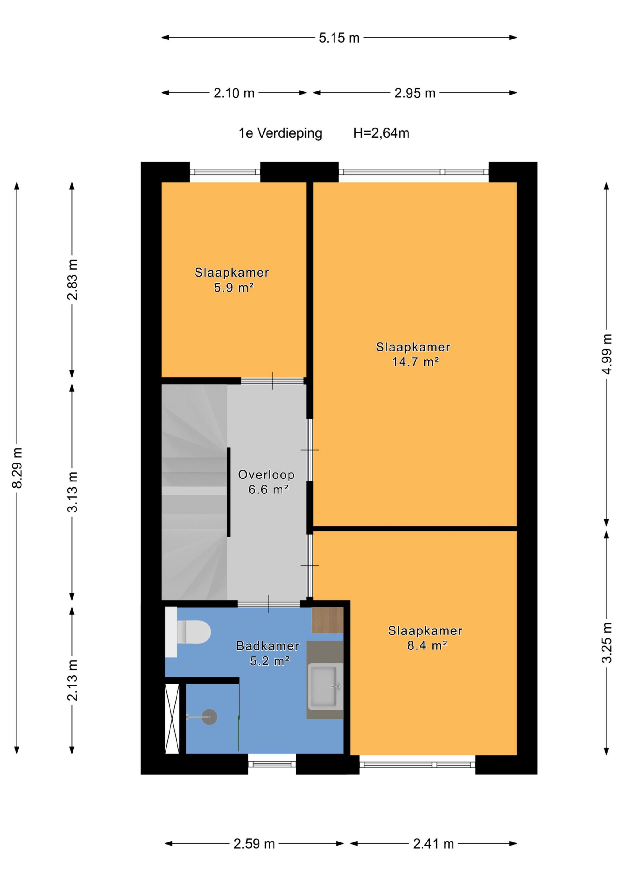 De overloop geeft toegang tot drie slaapkamers. Aan de achterzijde bevinden zich twee slaapkamers van ca. 15 m2 en ca. 6 m2. De derde slaapkamer (ca. 8 m2) ligt aan de voorzijde en is voorzien van een rolluik.
