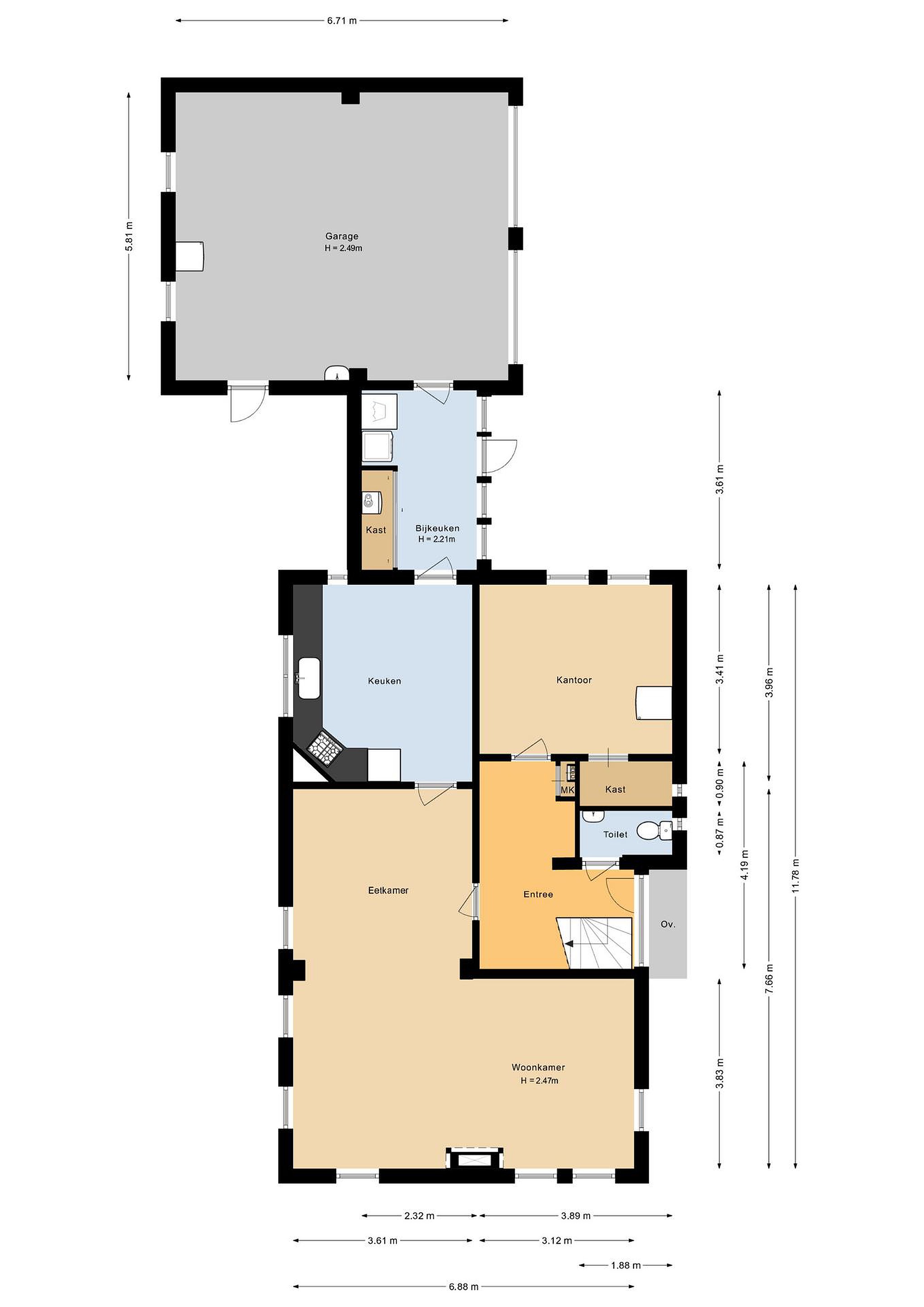 Begane grond Hal met toilet, trapopgang en meterkast. L-vormige woonkamer, keuken, slaapkamer met ruimte waarin voorbereiding voor een badkamer zit, bijkeuken met doorgang naar de dubbele garage met zolder.