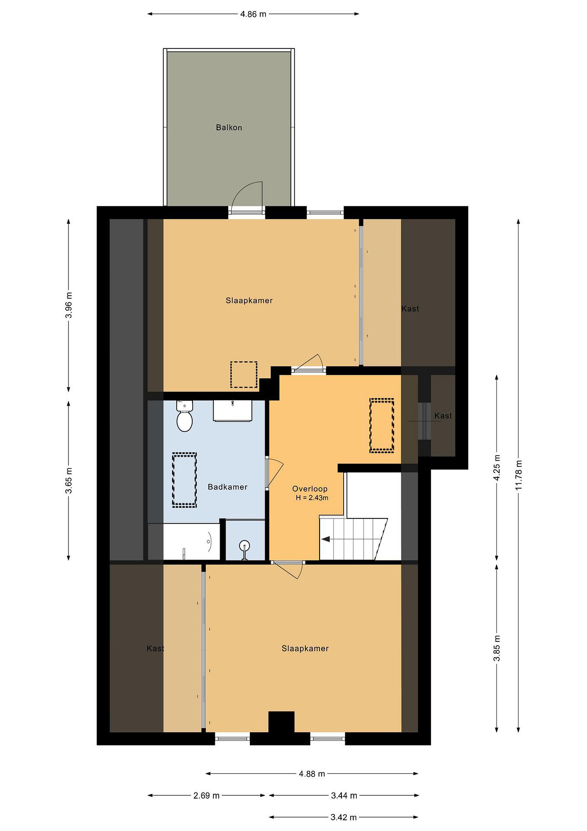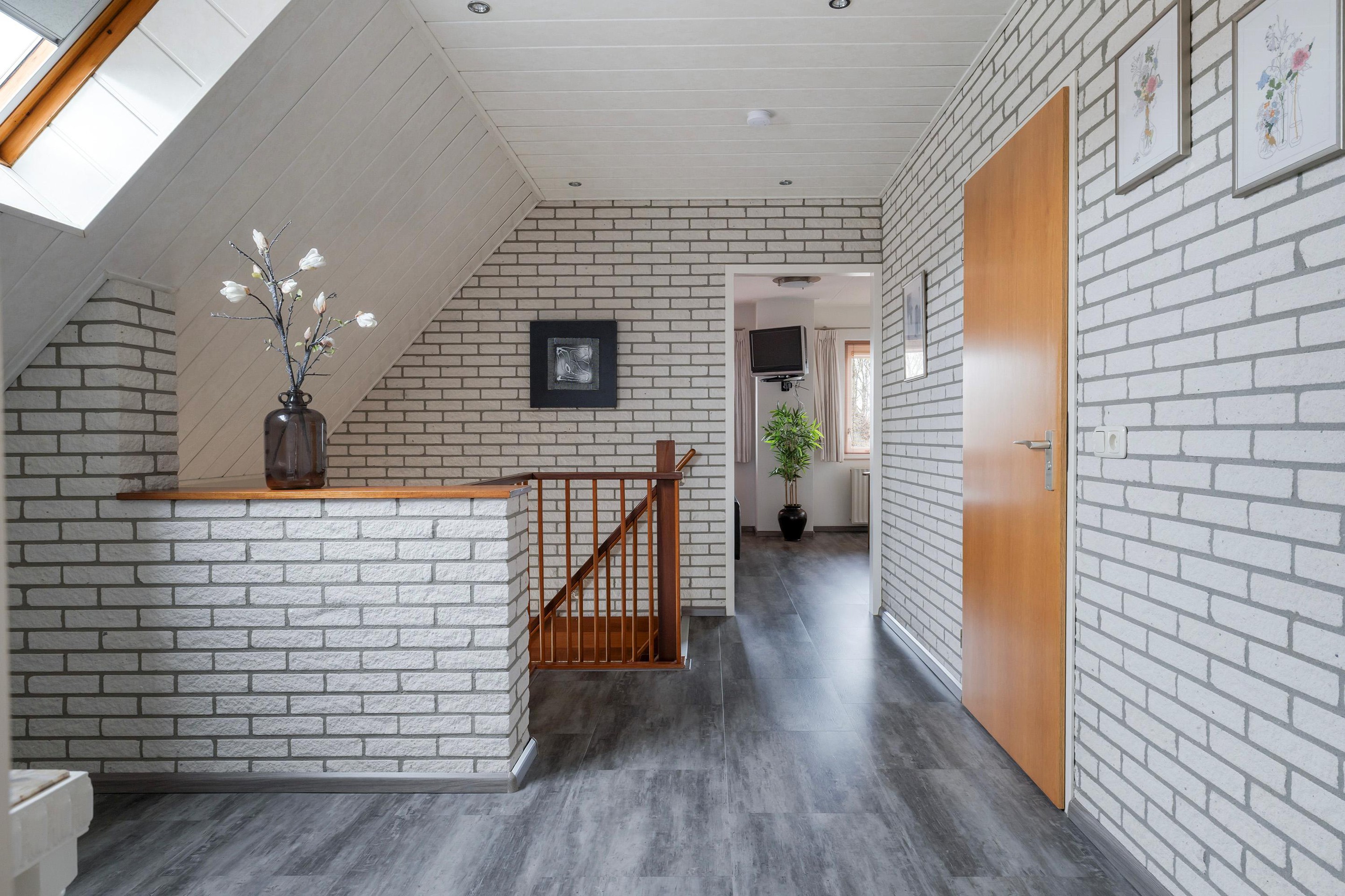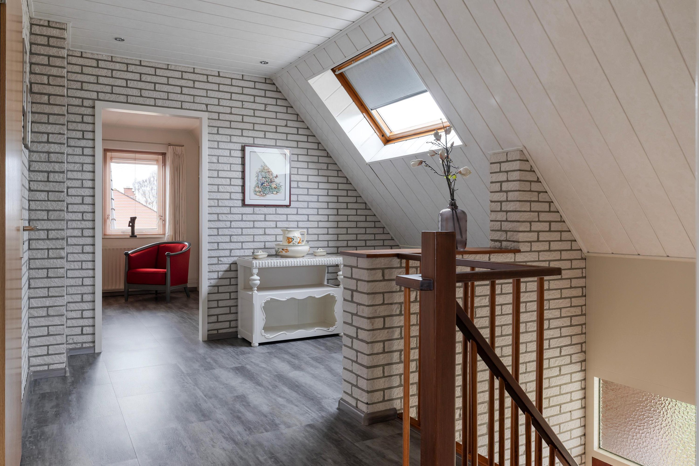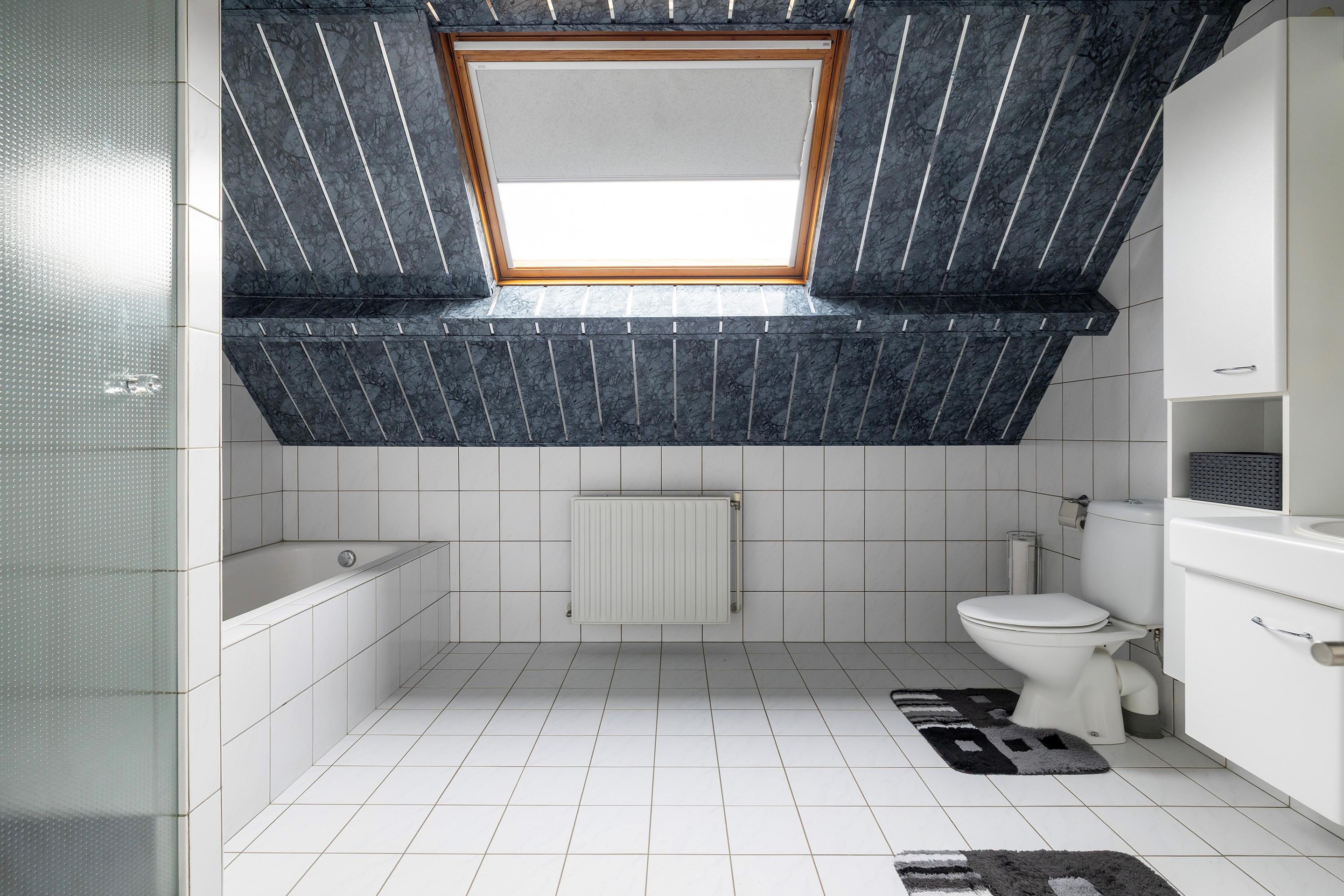 Eerste verdieping Overloop met groot dakraam, 2 slaapkamers, badkamer, voorzien van inloopdouche, ligbad, toilet en badmeubel.