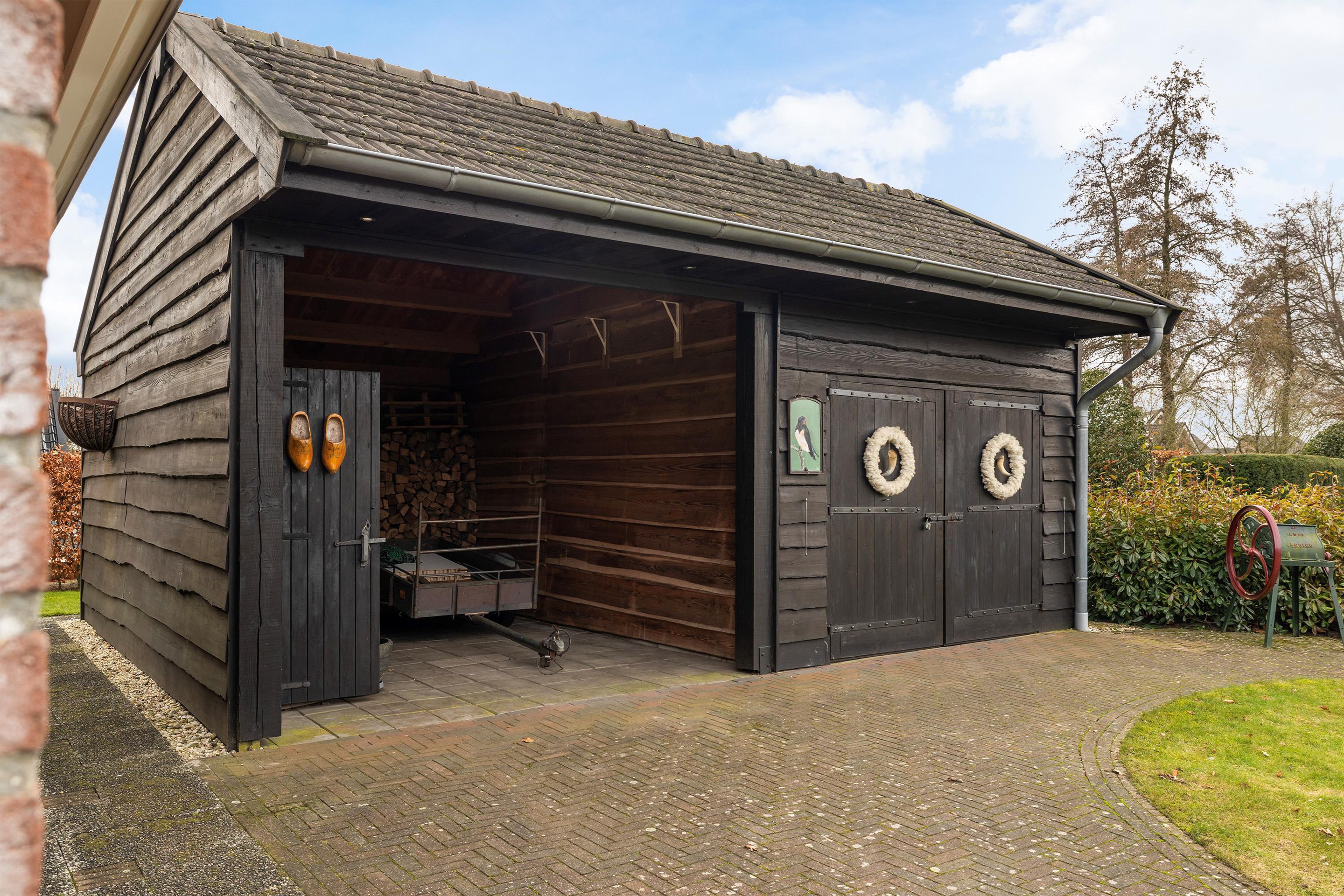 - Vrijstaande houten berging/werkplaats: De perfecte plek voor de klusser en de overkapping voor caravan of camper stalling.