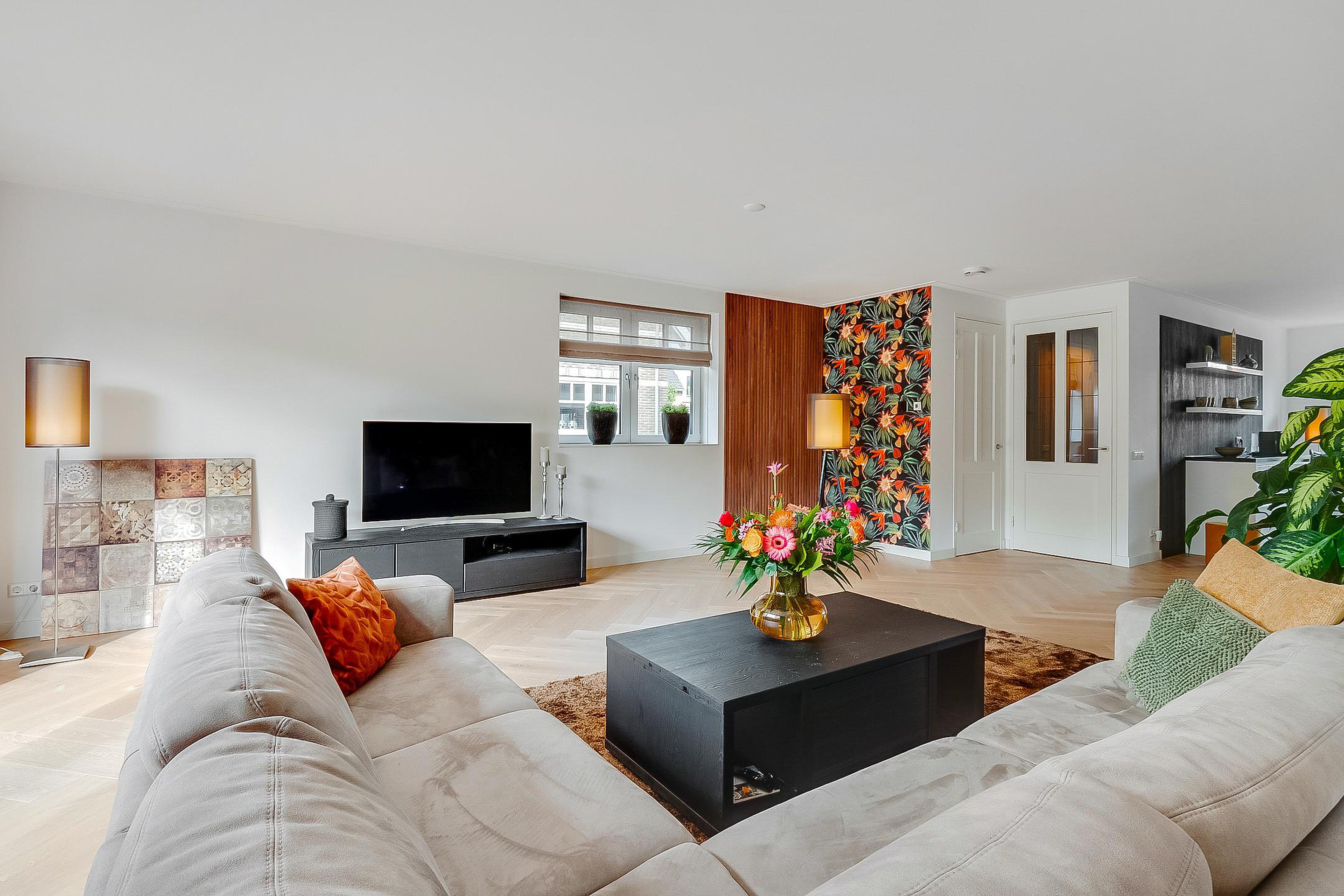 Wat bij binnenkomst gelijk opvalt is de imposante woonkamer (7.50 x 8.45) en royale open keuken (4.72 x 5.89). Er is voldoende ruimte voor diverse verschillende meubelopstellingen en het is mogelijk om naast de zithoek en 10 persoons eettafel bijvoorbeeld een handige werkplek te creëren.