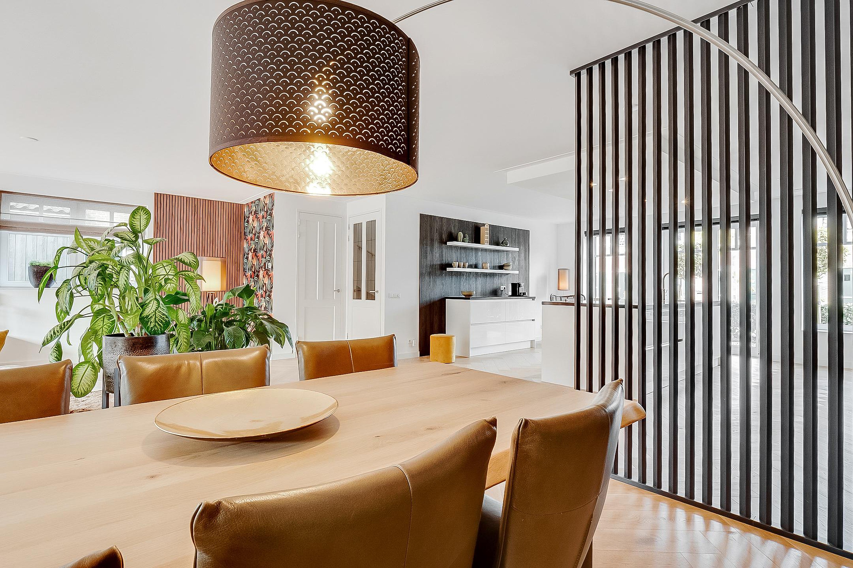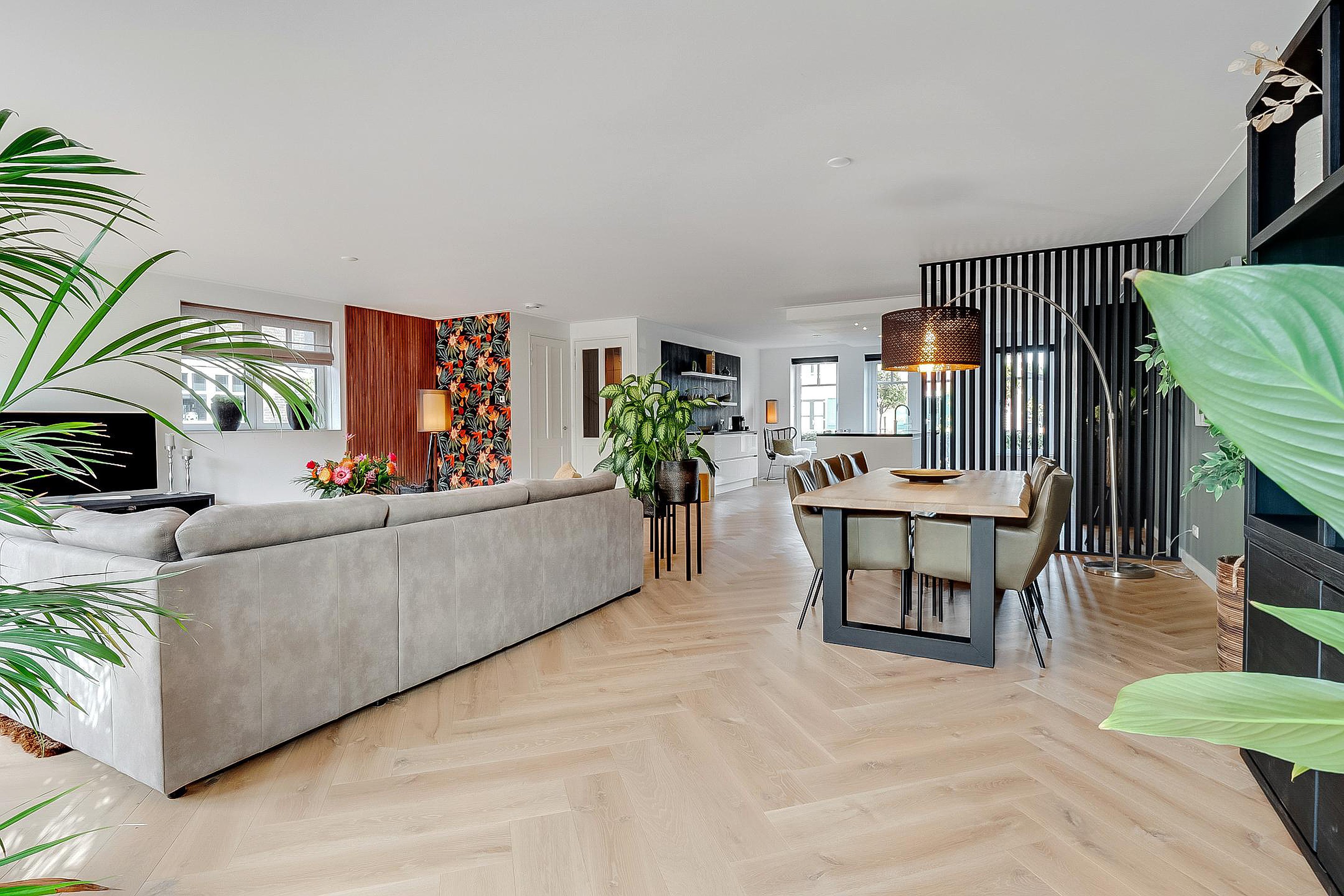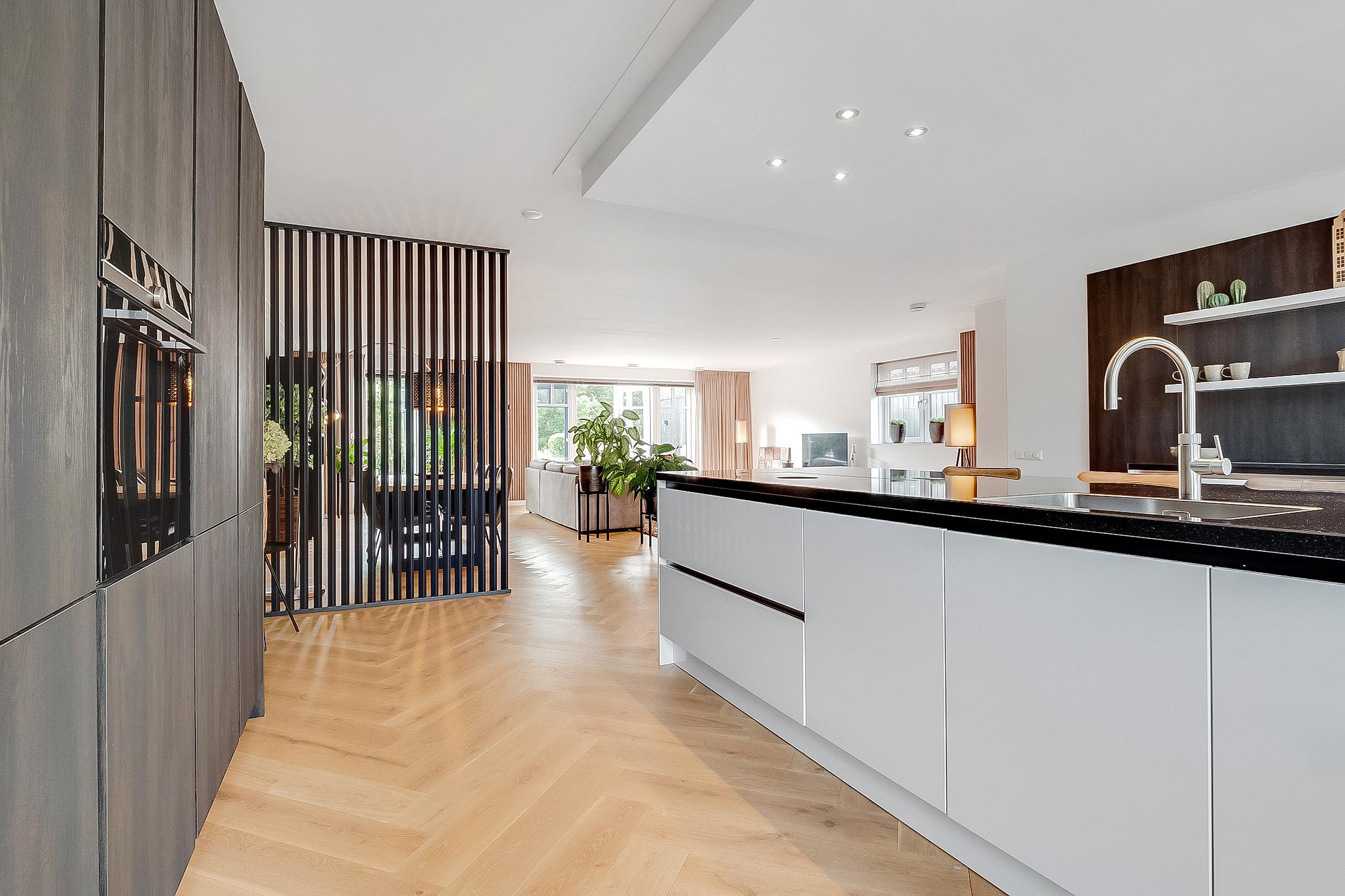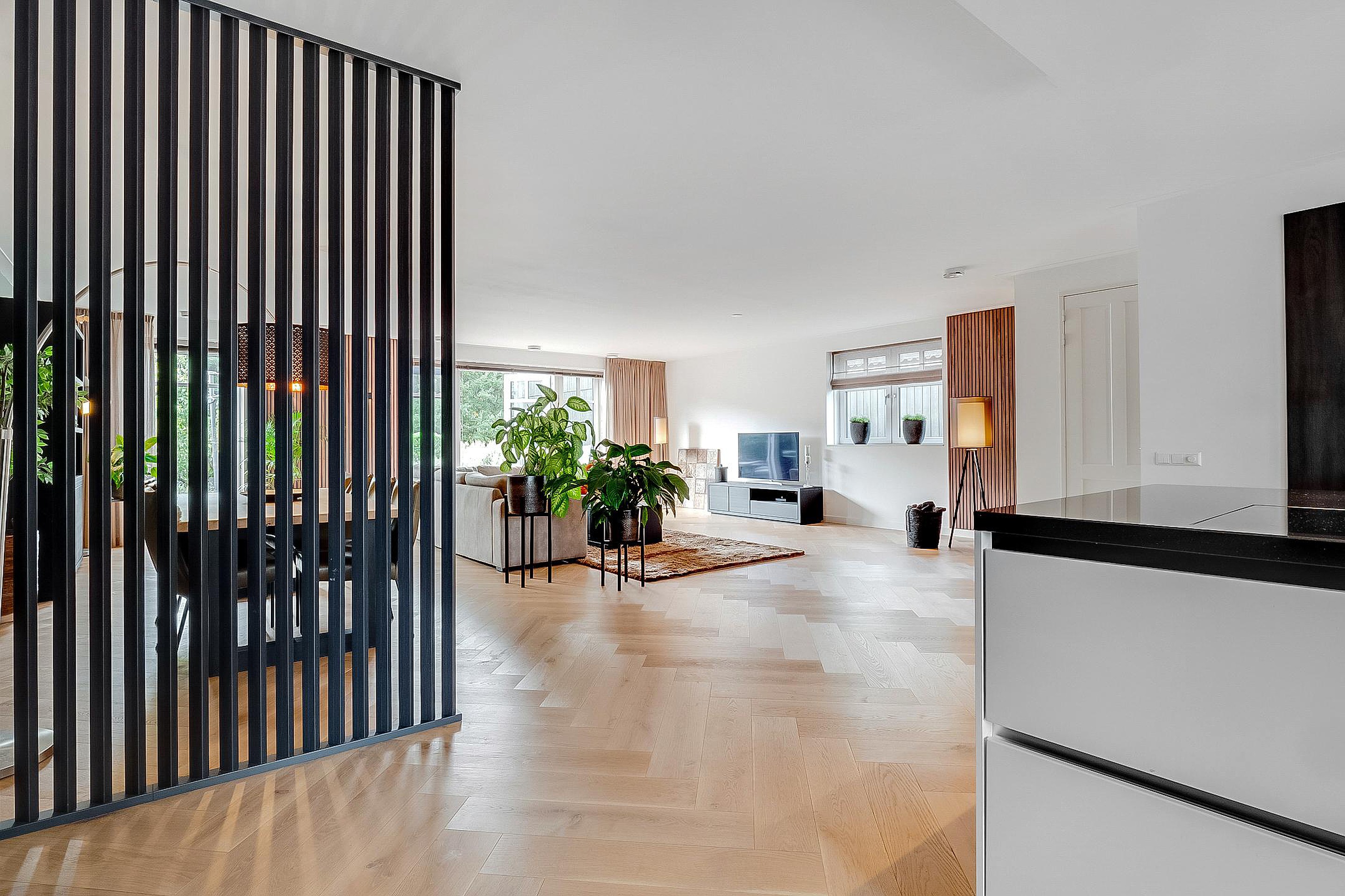 Tussen woonkamer en keuken is een modern kamerscherm geplaatst.