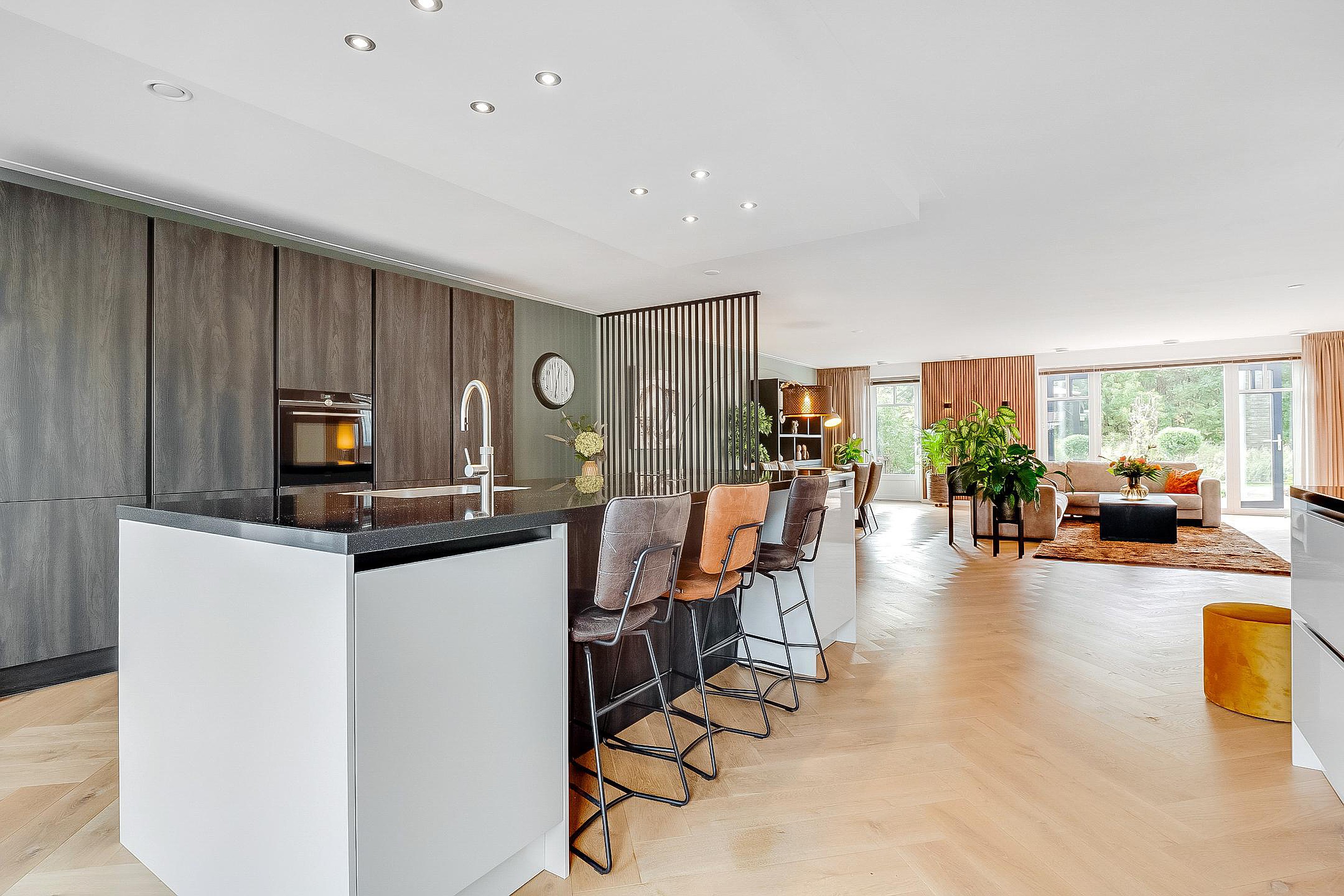 Vanuit de keuken openslaande deuren naar de voortuin en vanuit de woonkamer openslaande deuren naar de achtertuin. De moderne keuken met kookeiland is voorzien van diverse luxe inbouwapparatuur.