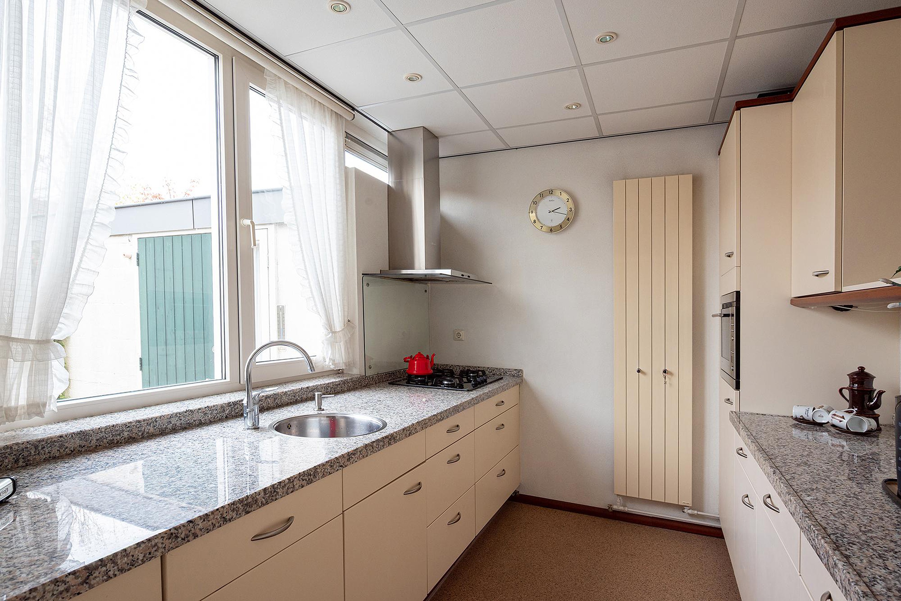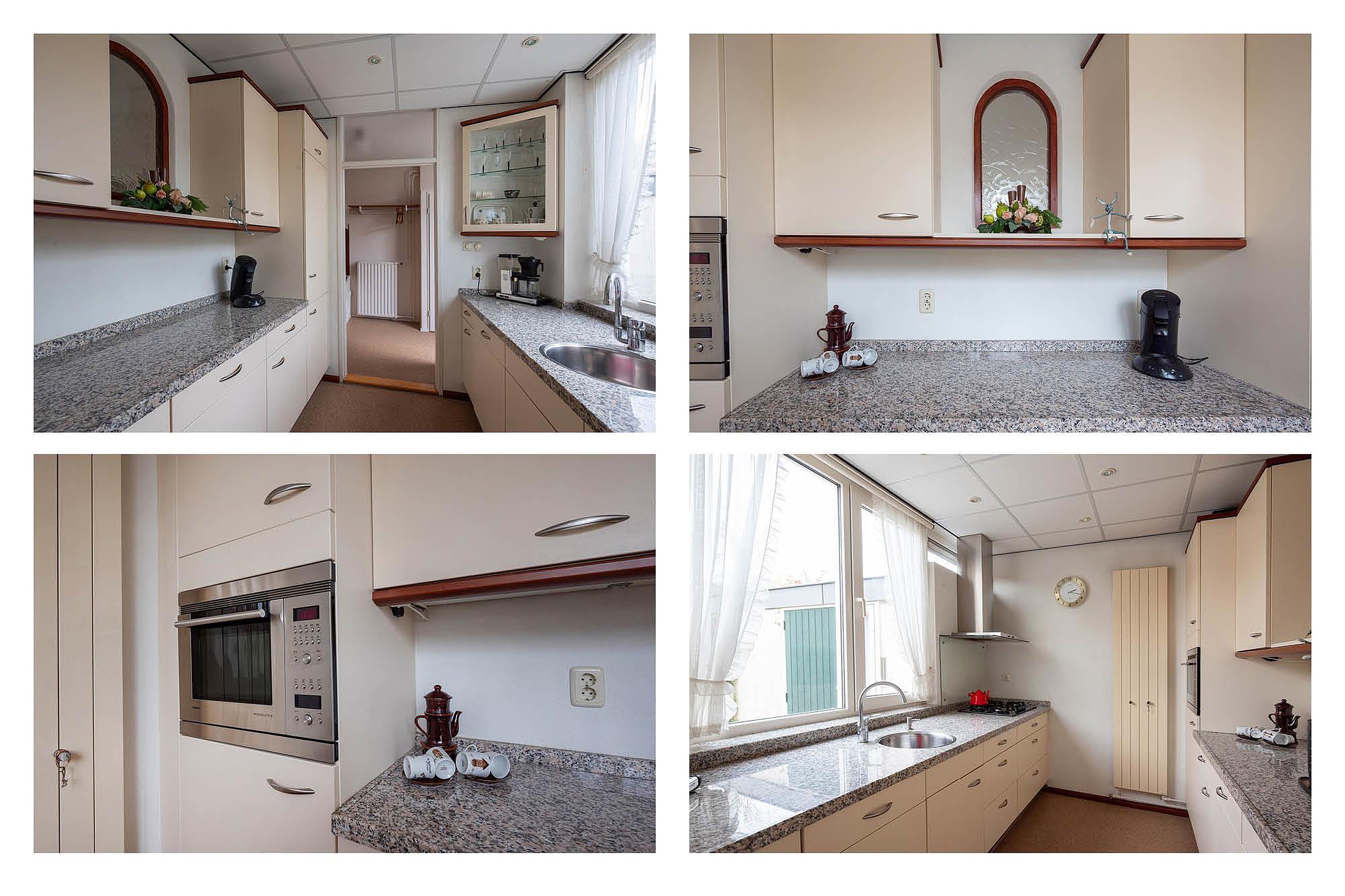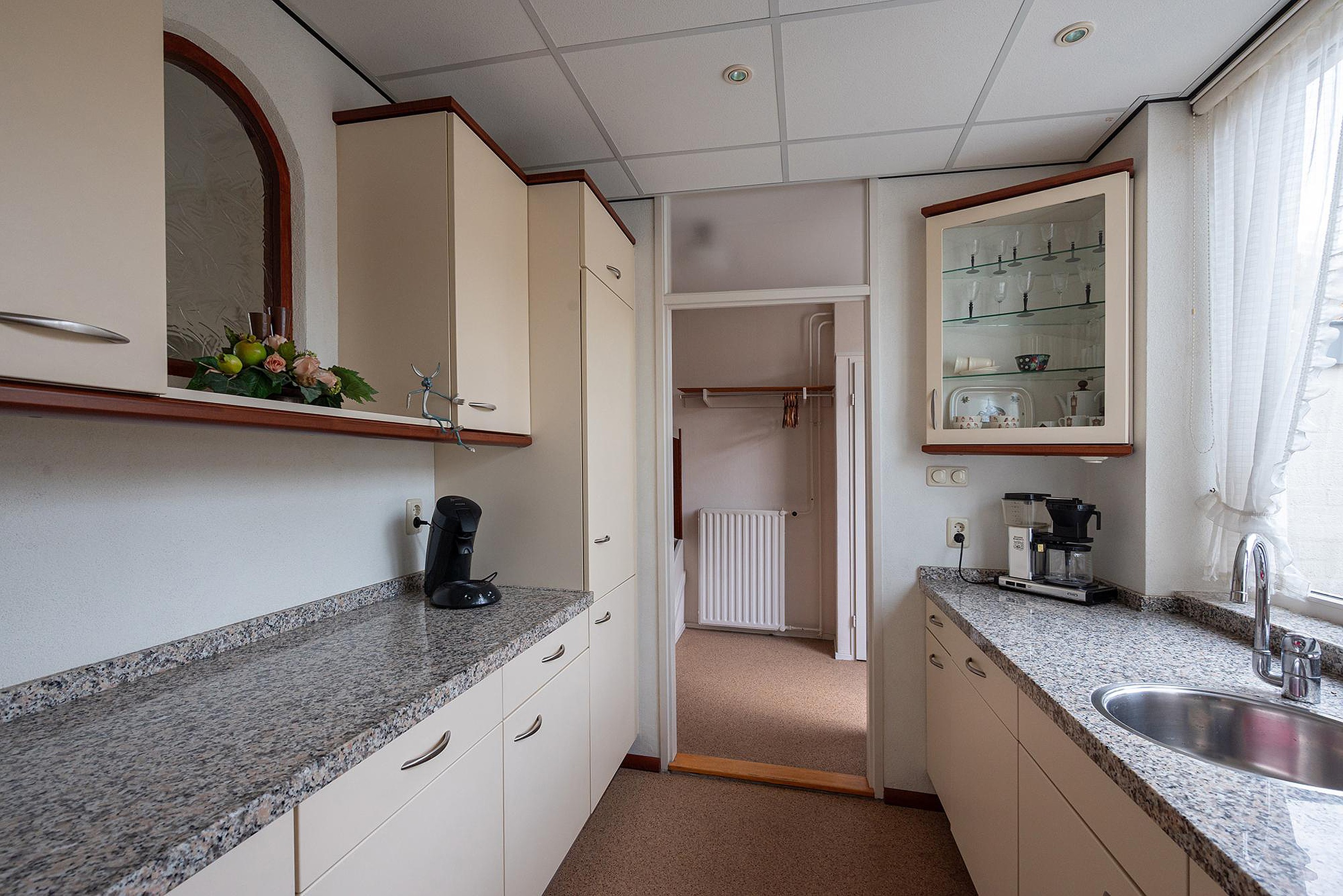 De gesloten keuken is aan de voorzijde gesitueerd en de keuken is voorzien van diverse inbouwapparatuur. Het is mogelijk om de muur tussen keuken en woonkamer weg te halen en een open keuken te creëren.