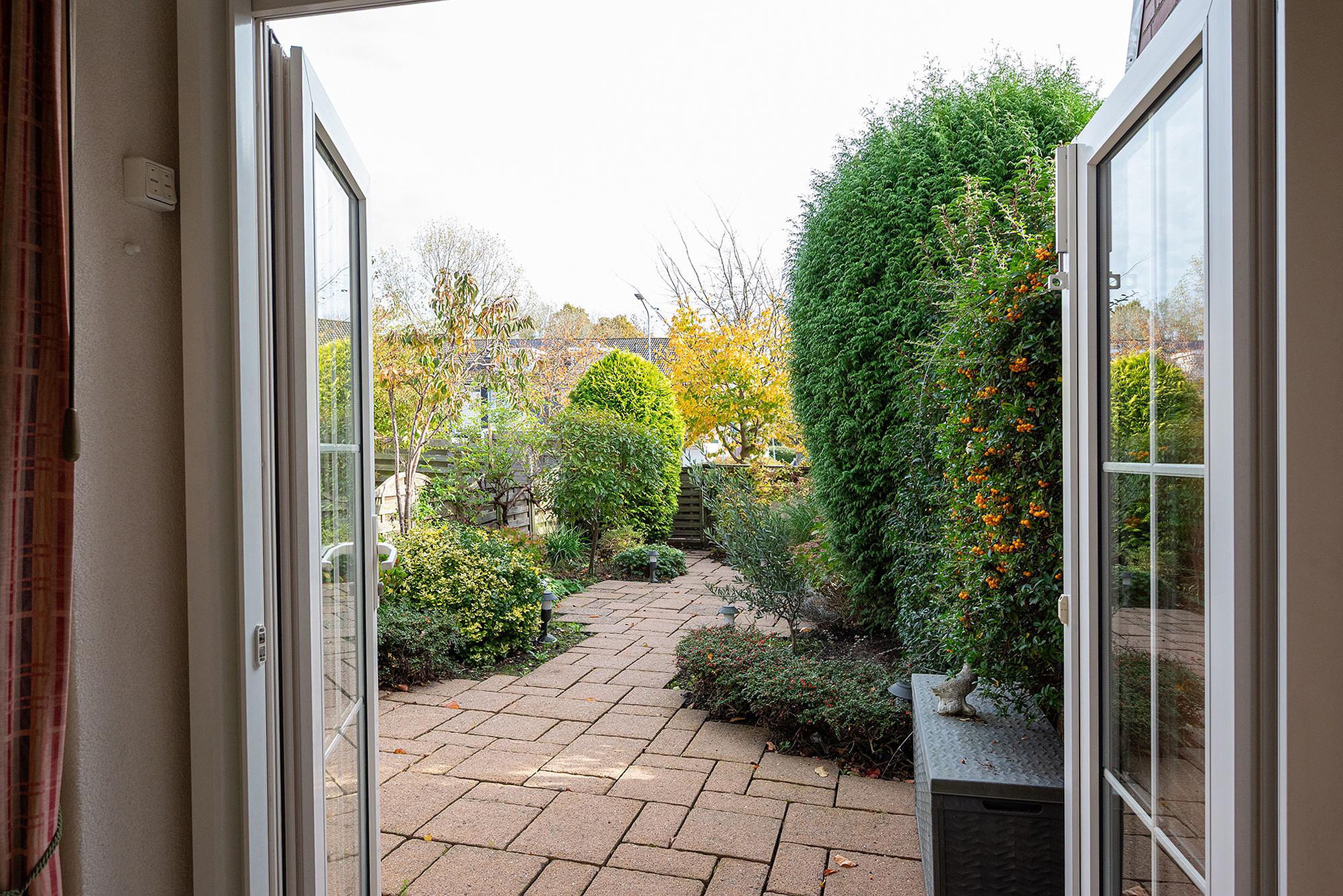 Ruime tuingerichte woonkamer met openslaande deuren naar de zonnige achtertuin.