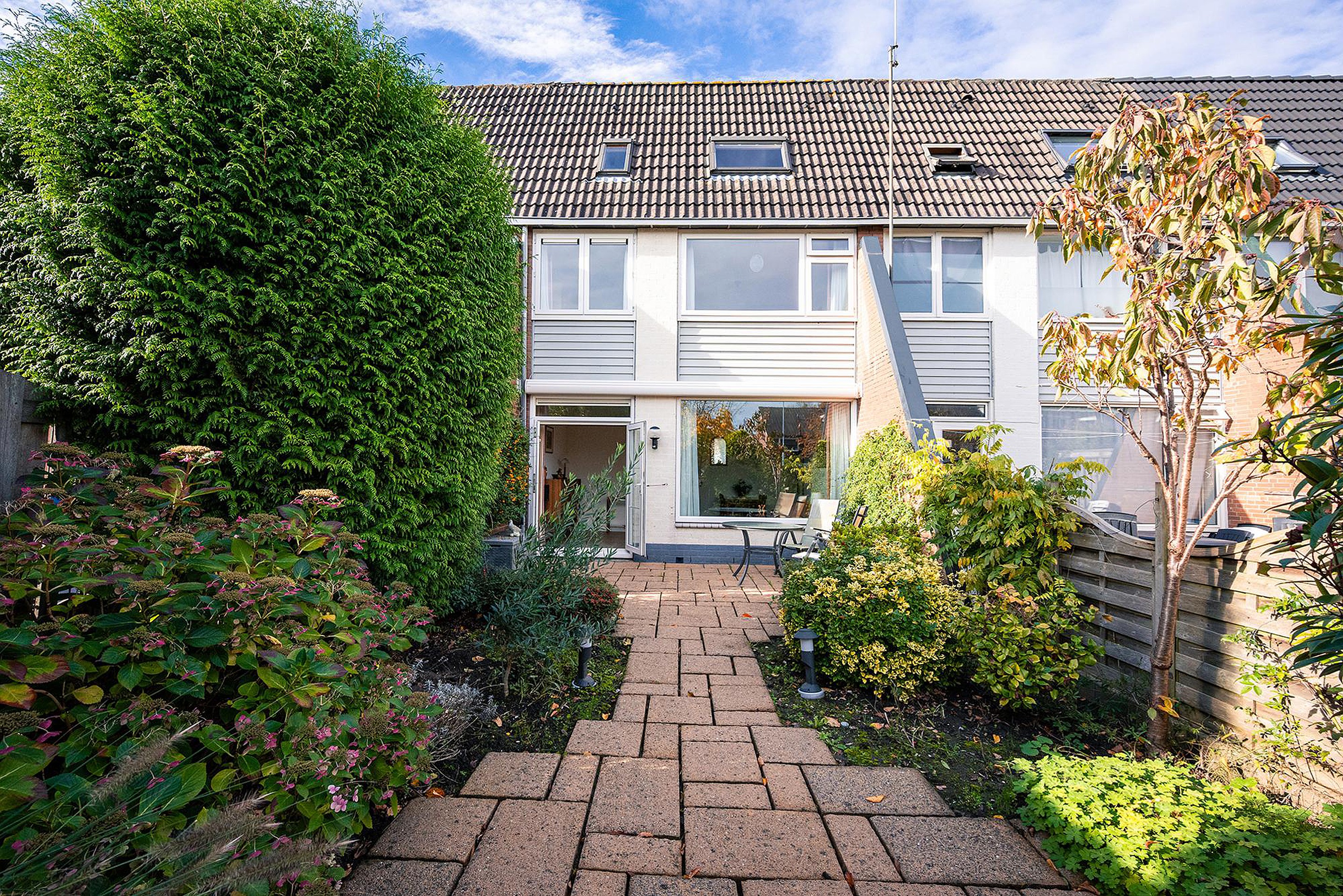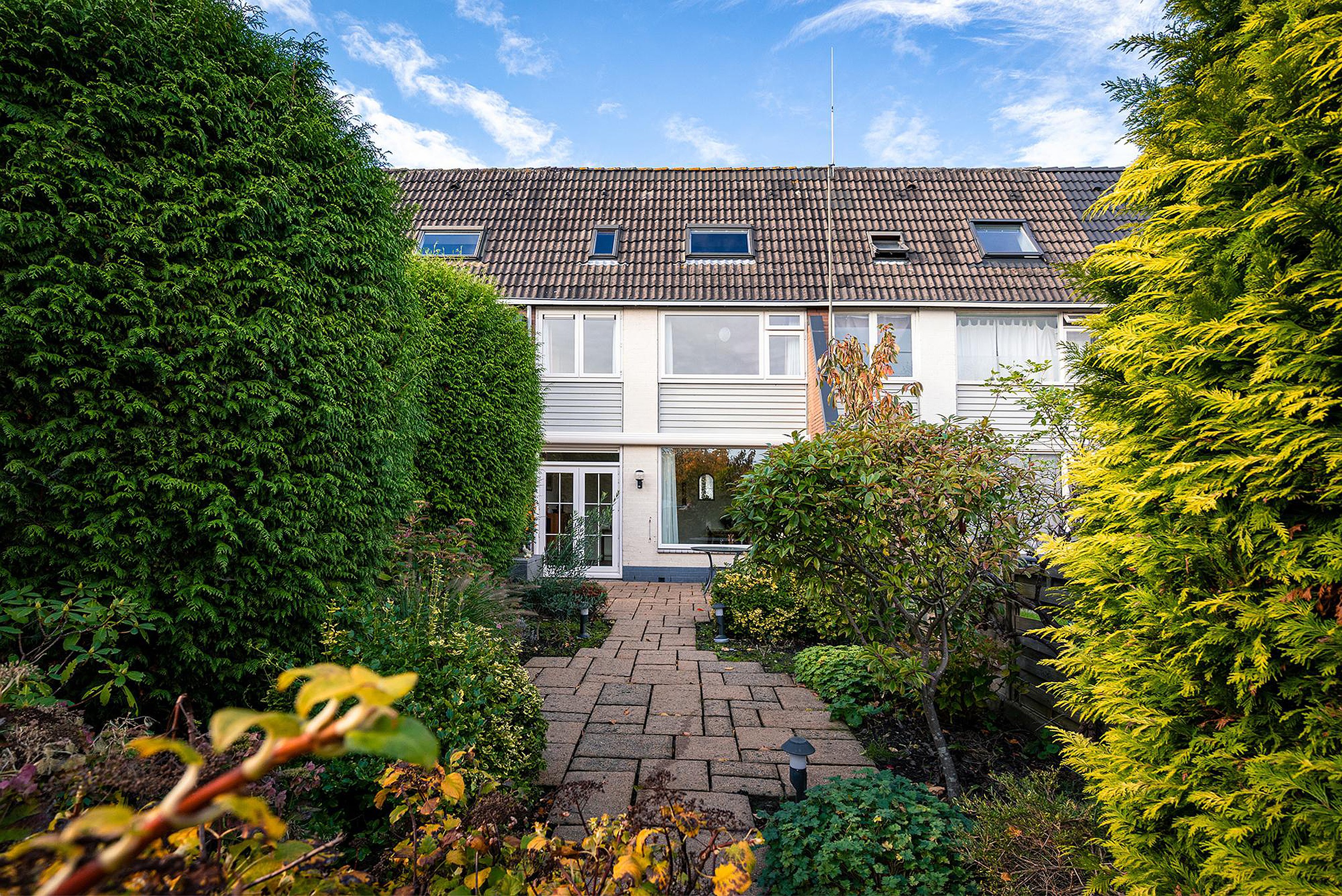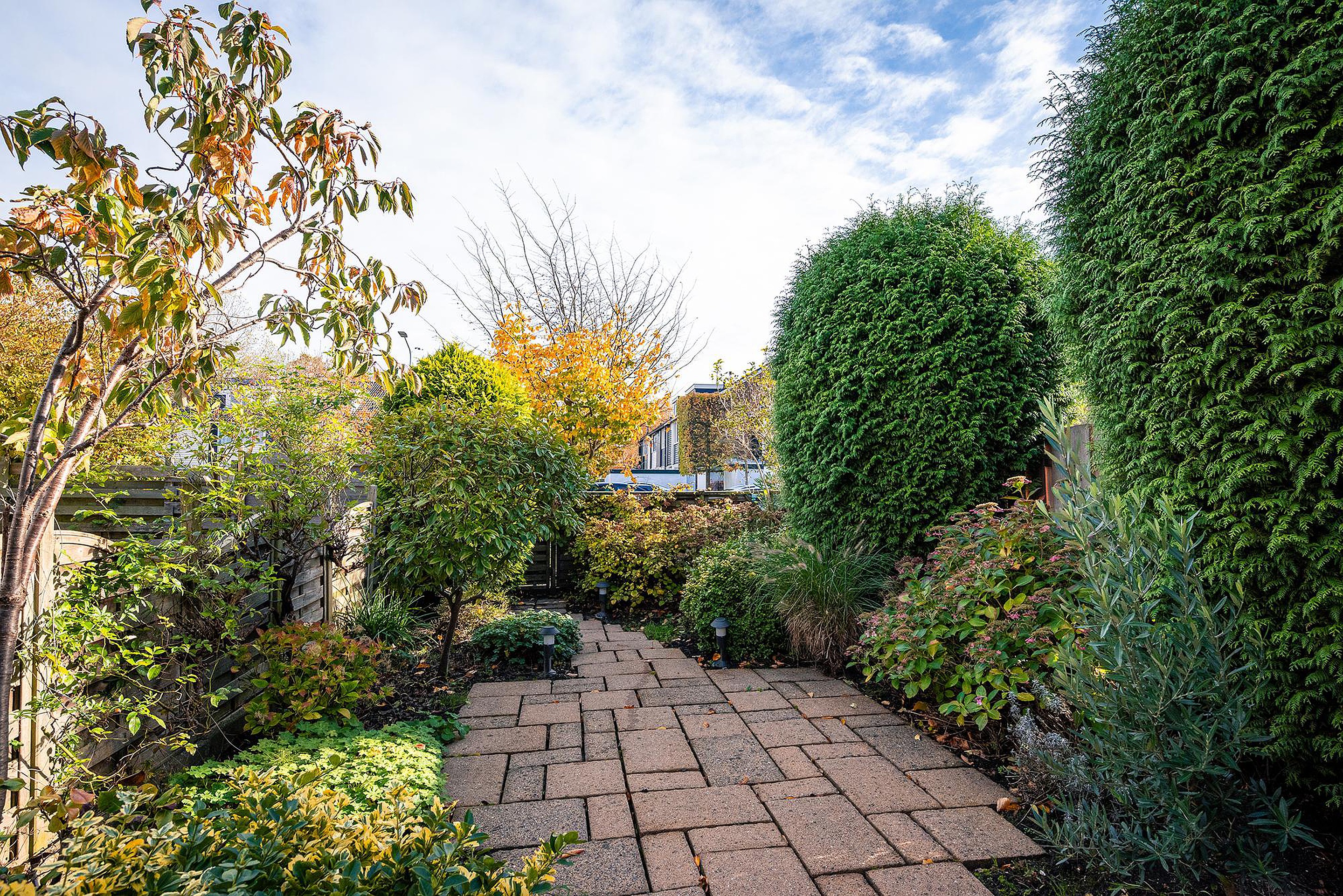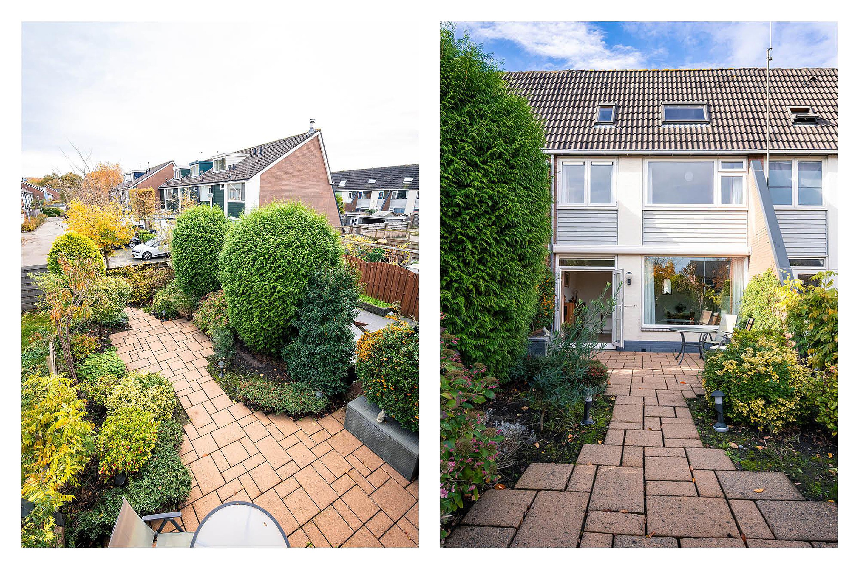 Aan de achterzijde een royale, fraai aangelegde tuin op het zuidoosten met terras en diverse sierlijke beplanting. Het terras beschikt, vanwege de zonnige ligging, over een elektrisch zonnescherm. Via de achteruitgang van de tuin is het pleintje met speelvoorzieningen veilig bereikbaar voor kinderen.