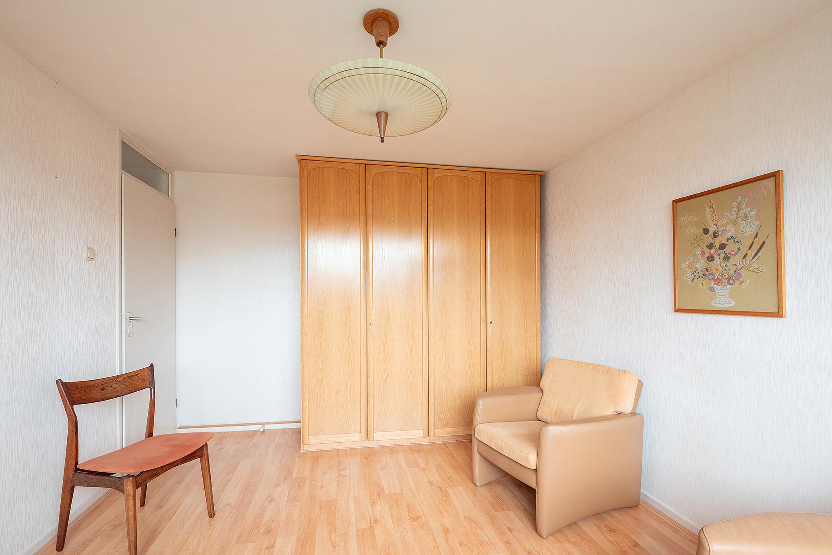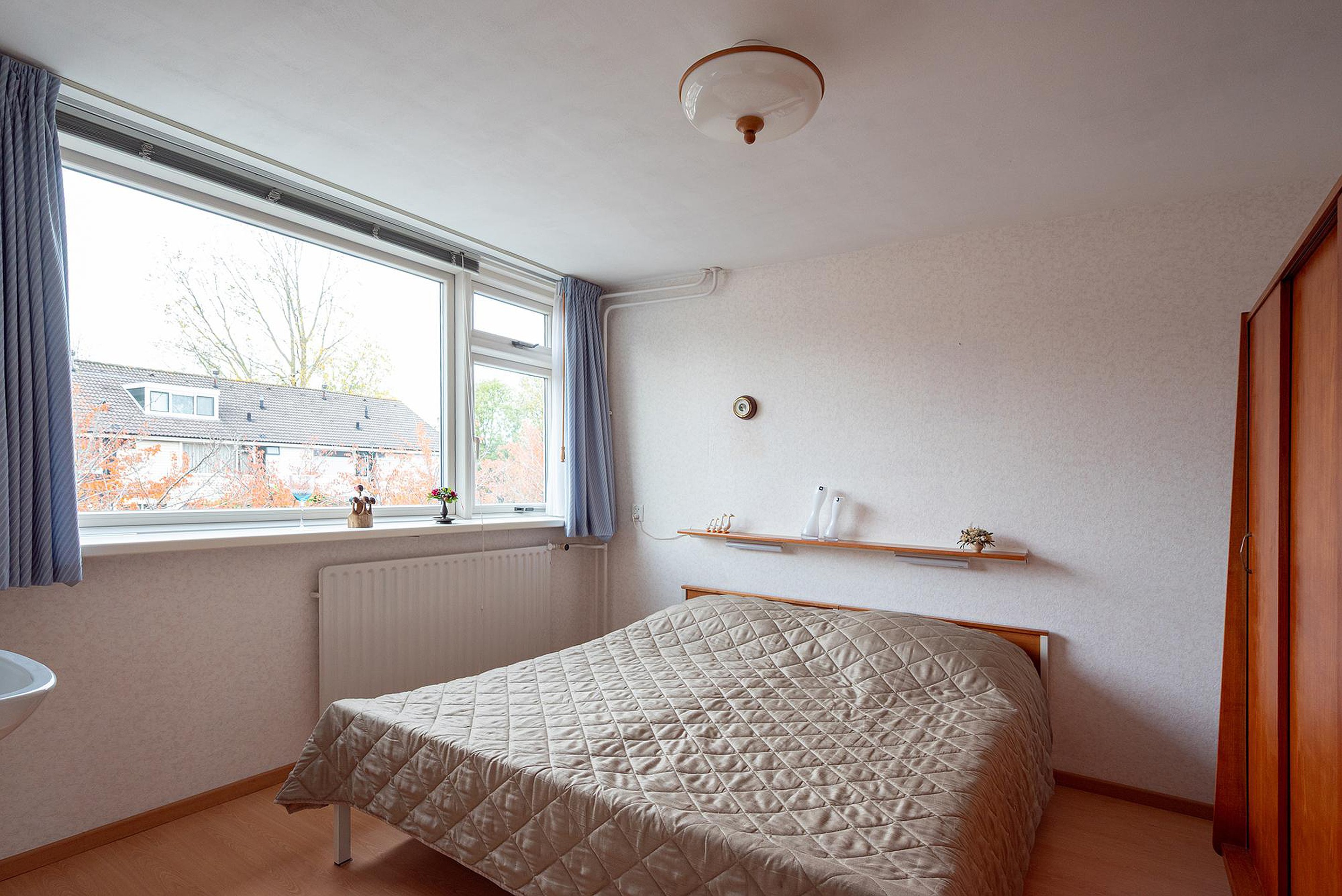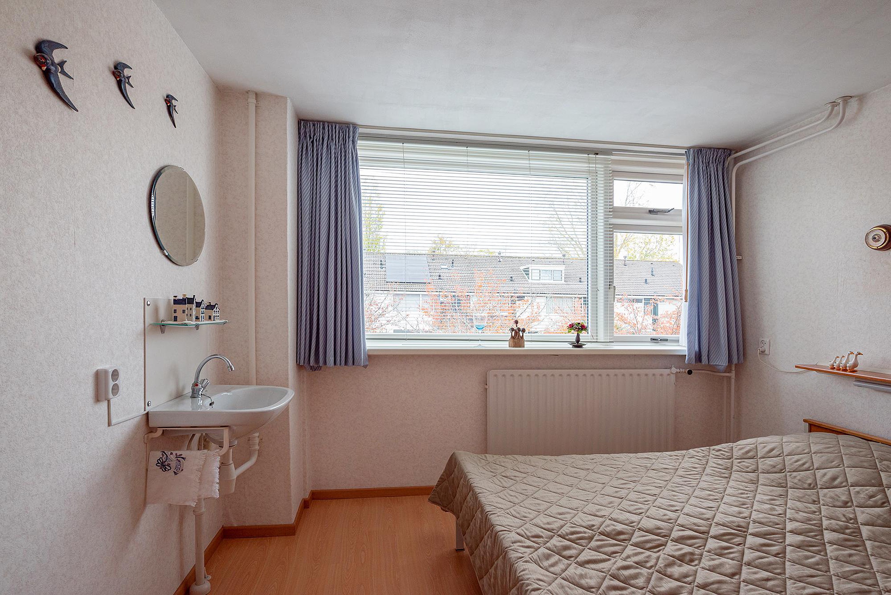 De grote slaapkamer aan de voorzijde is voorzien van een wastafel met spiegel.
