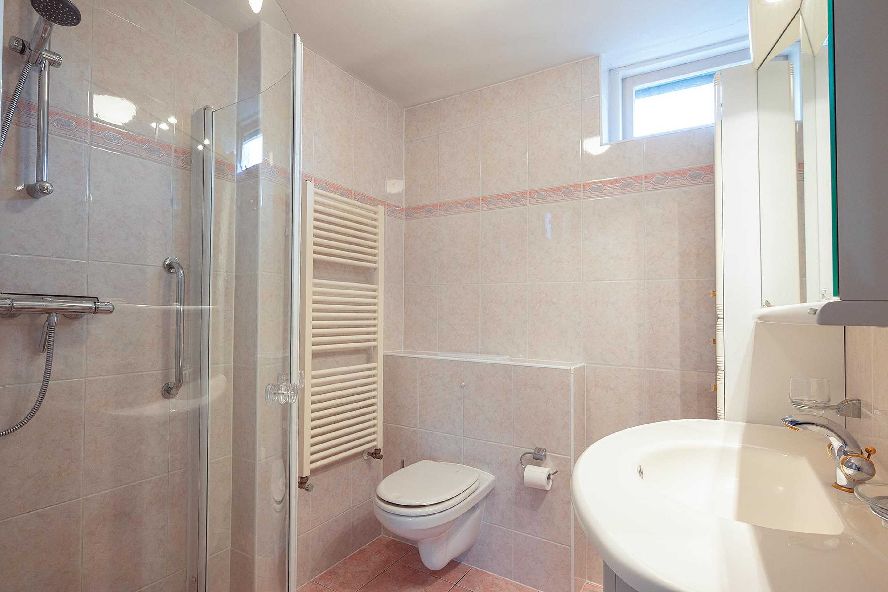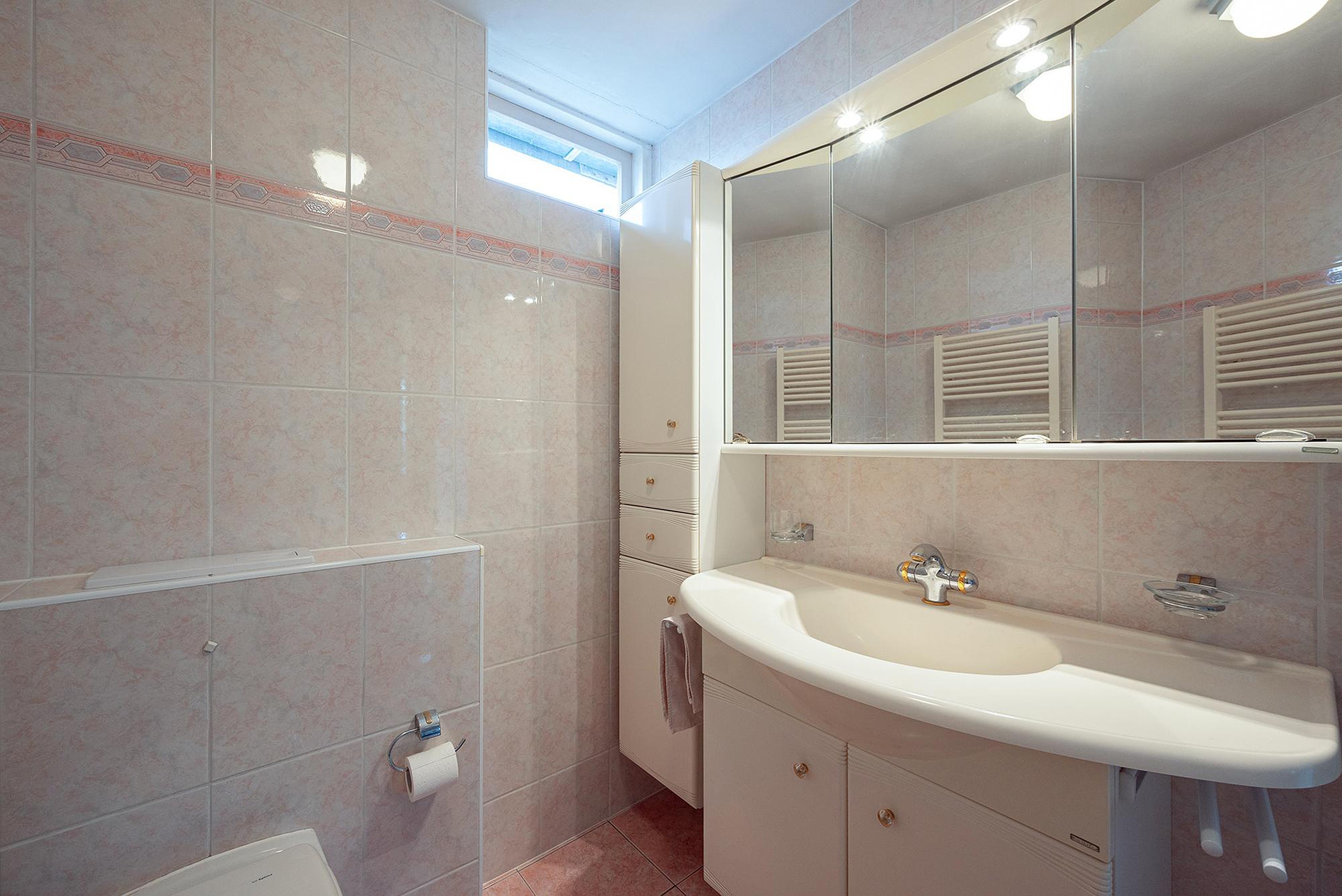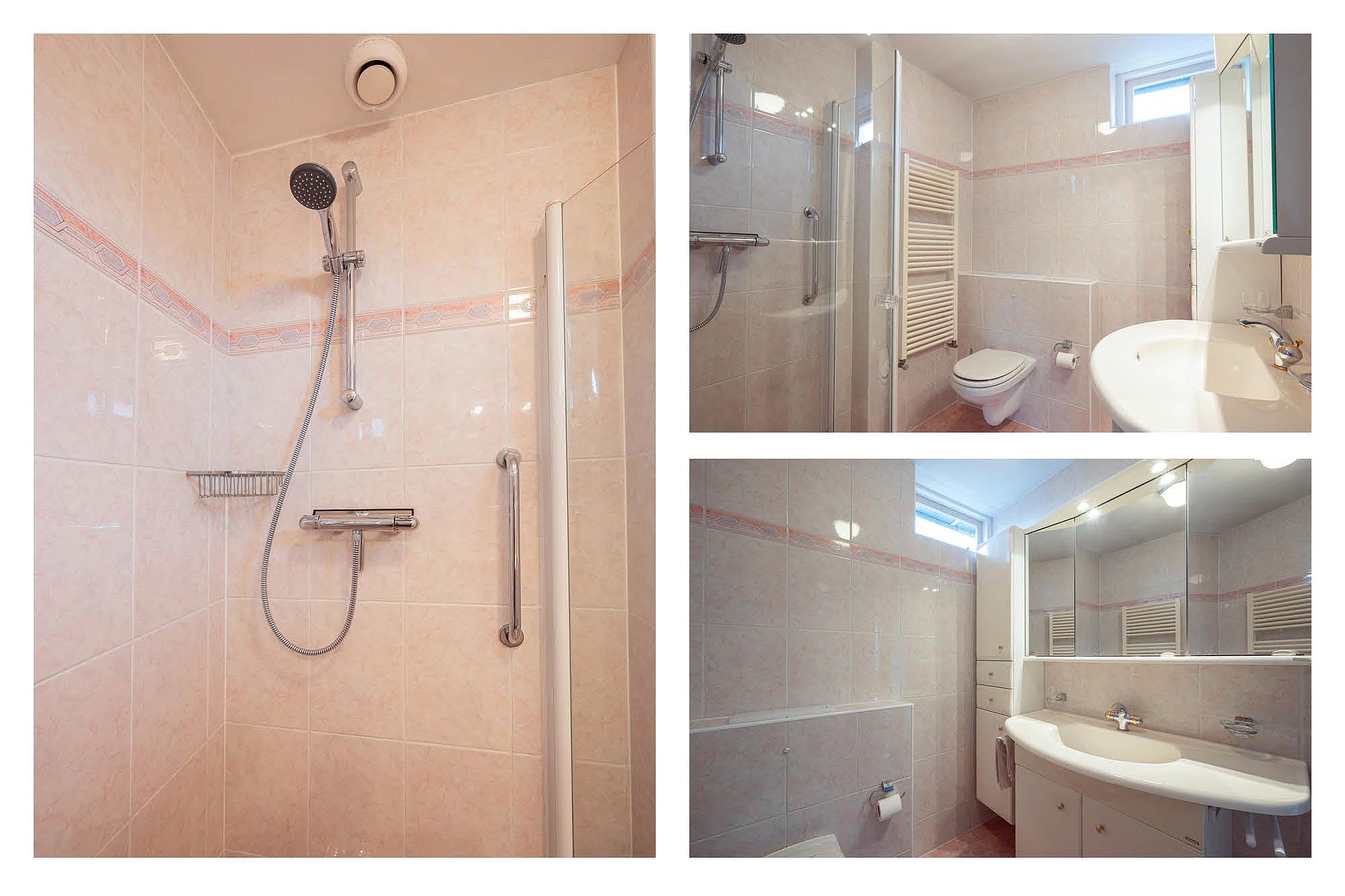 De badkamer is volledig betegeld en voorzien van een douchecabine, wastafelmeubel met wastafel, spiegelkast en verlichting, toilet, handdoekradiator en raam.