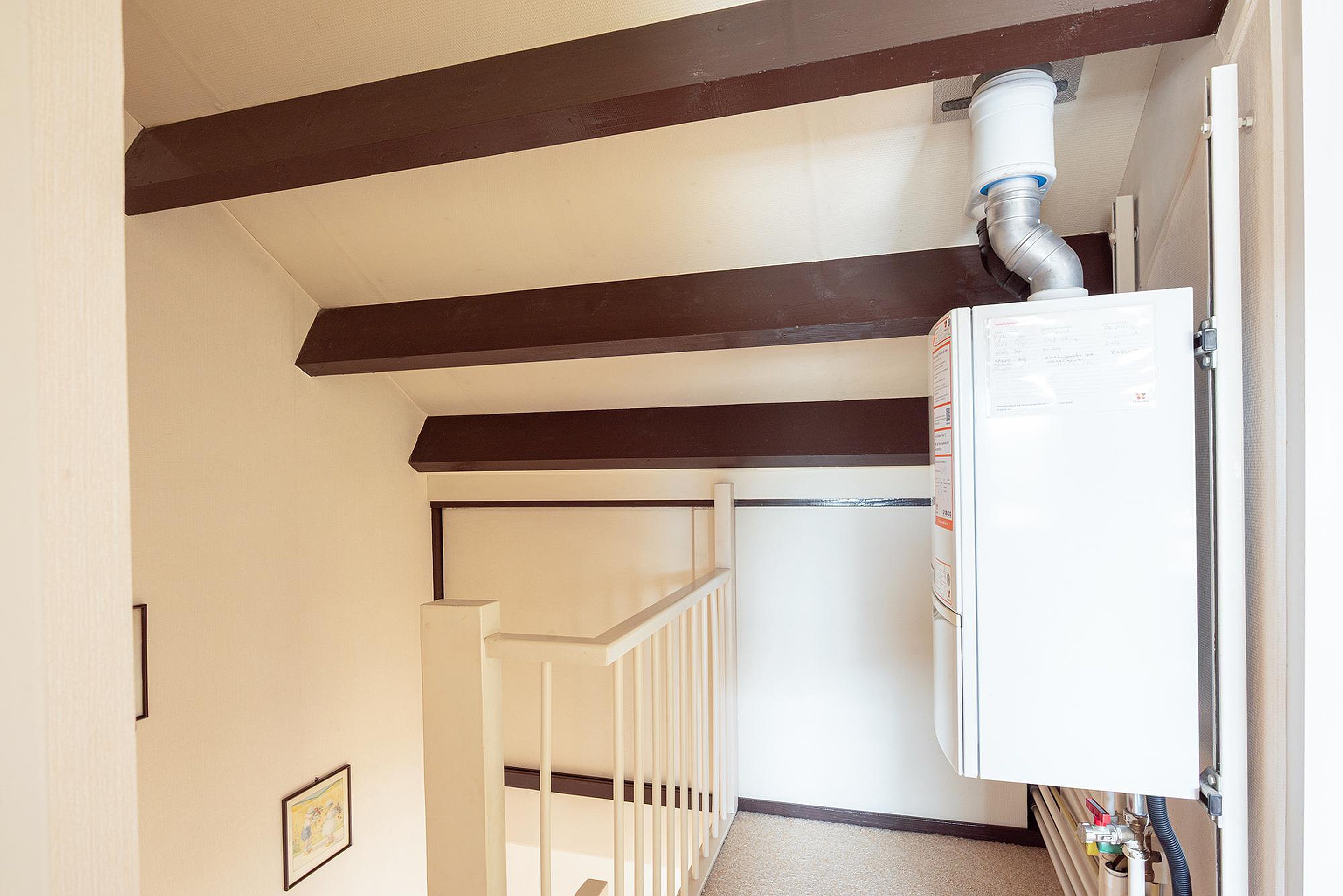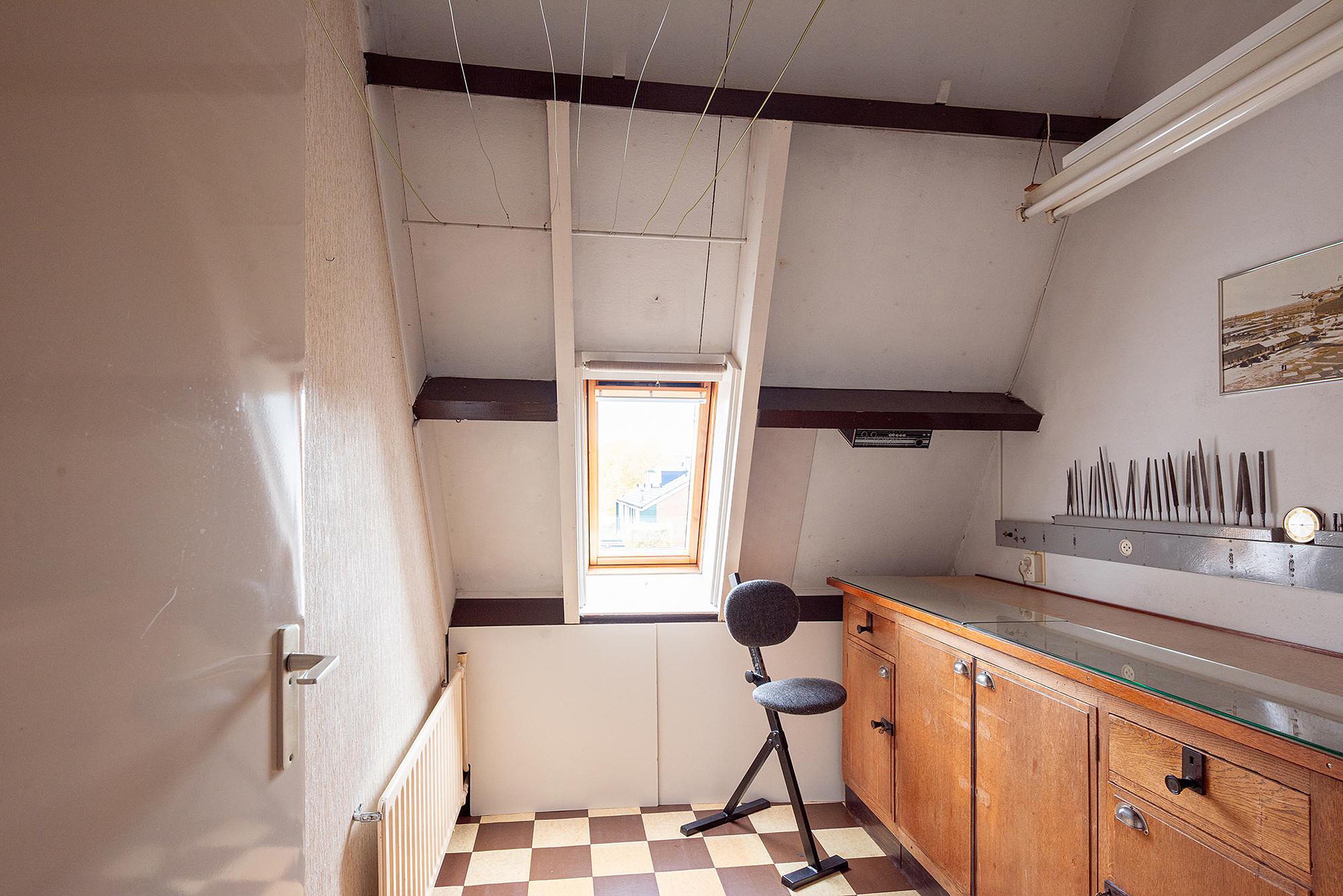 Veel bergruimte op zowel overloop als onder het schuine dak achter de knieschotten.