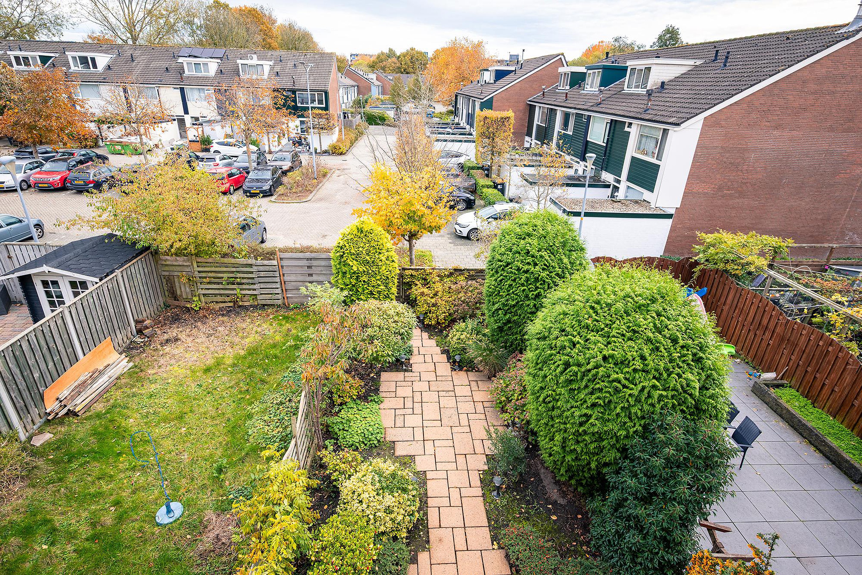 Tuin Voortuin met stenen berging en een eigen parkeerplaats. Met de mogelijkheid tot uitbreiding naar twee parkeerplaatsen op eigen terrein.