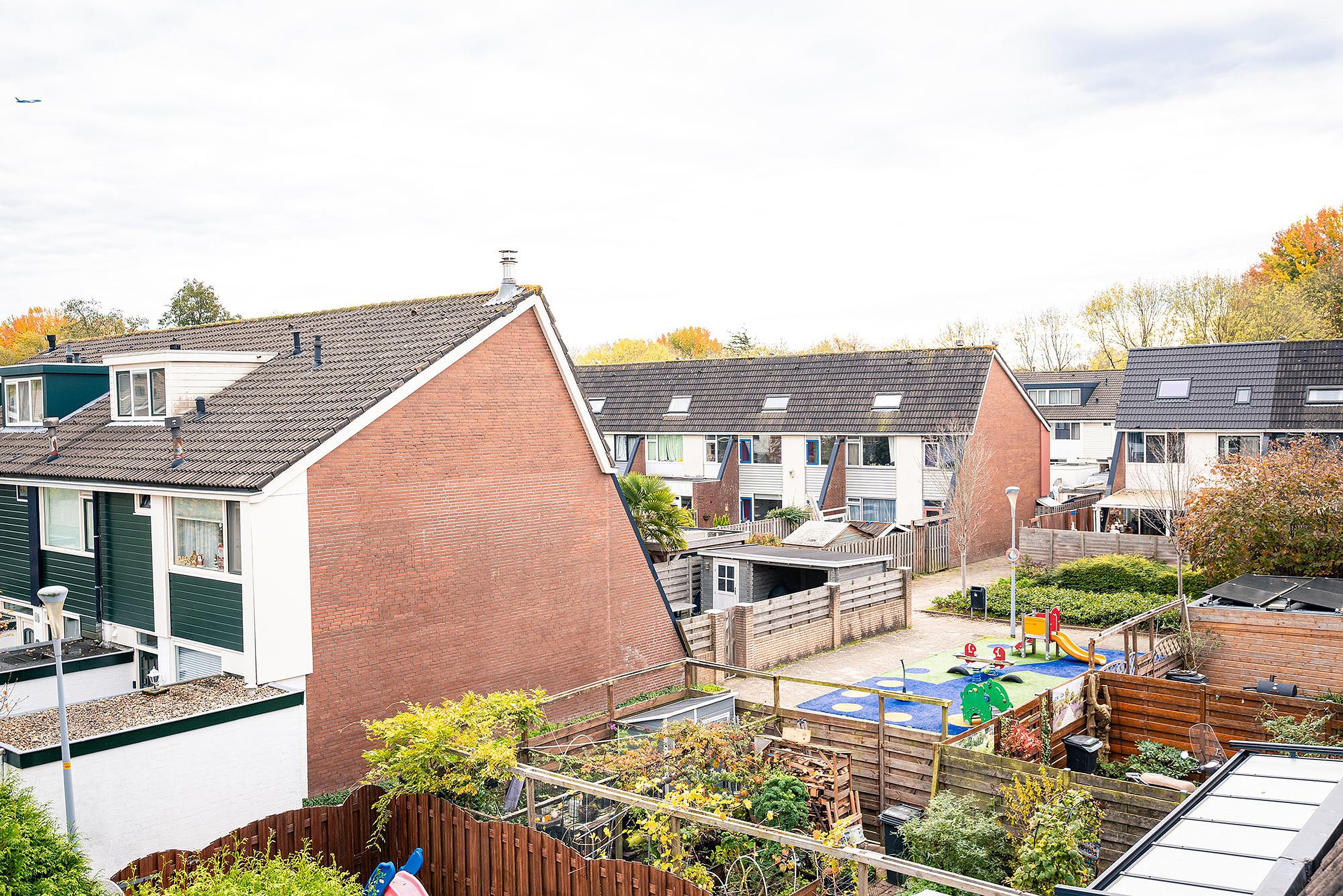 De achtertuin grenst aan een pleintje met speelvoorzieningen voor kinderen.