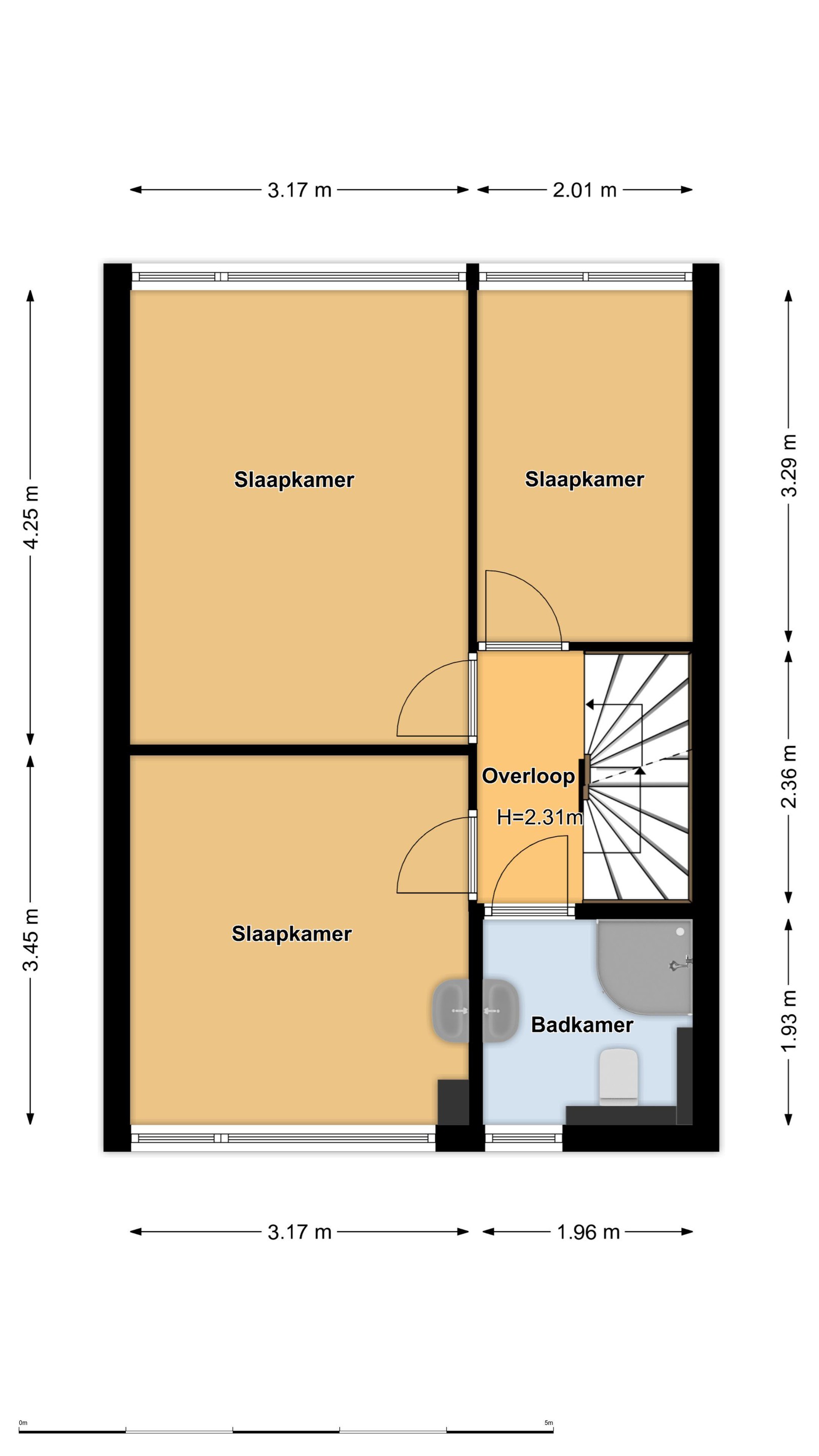 Eerste verdieping Overloop, drie slaapkamers en een nette badkamer.