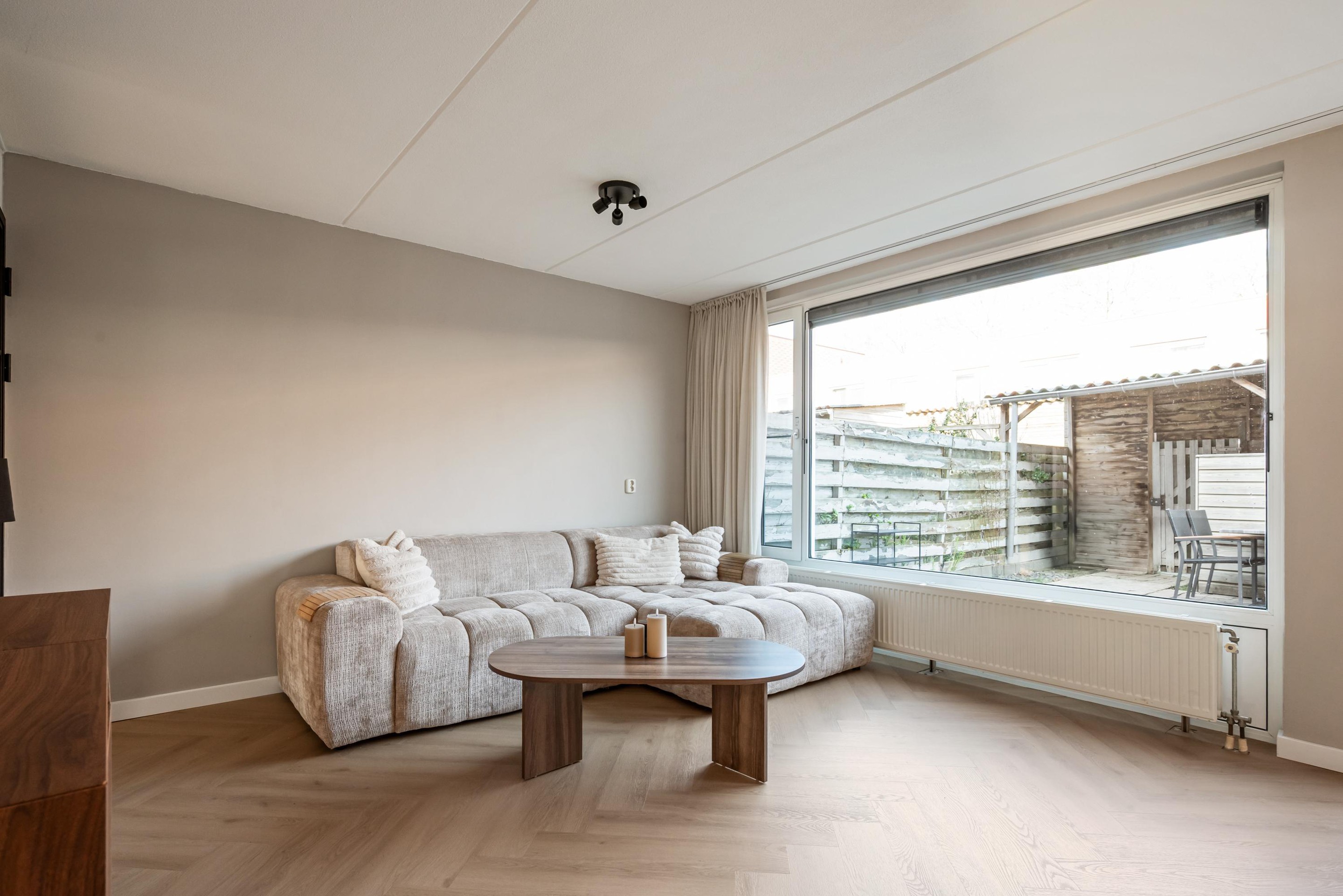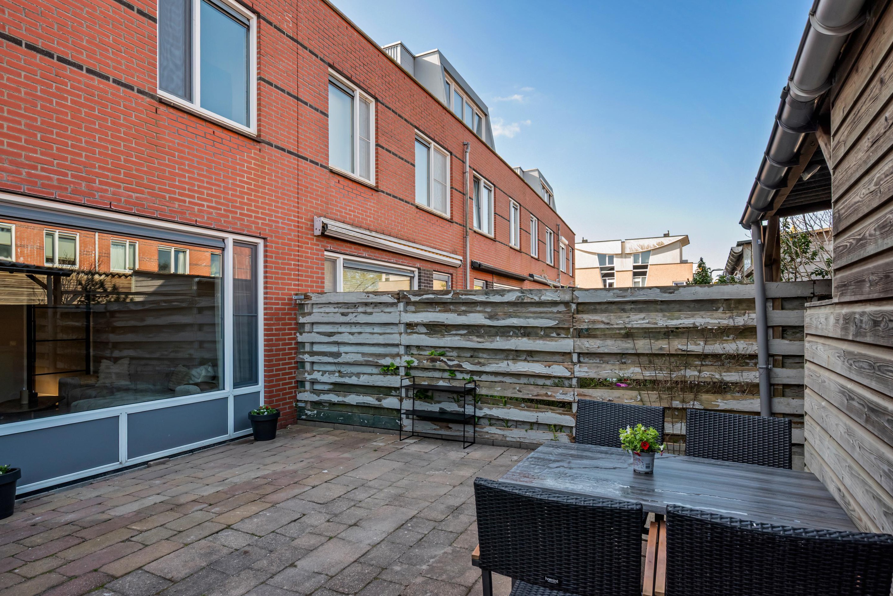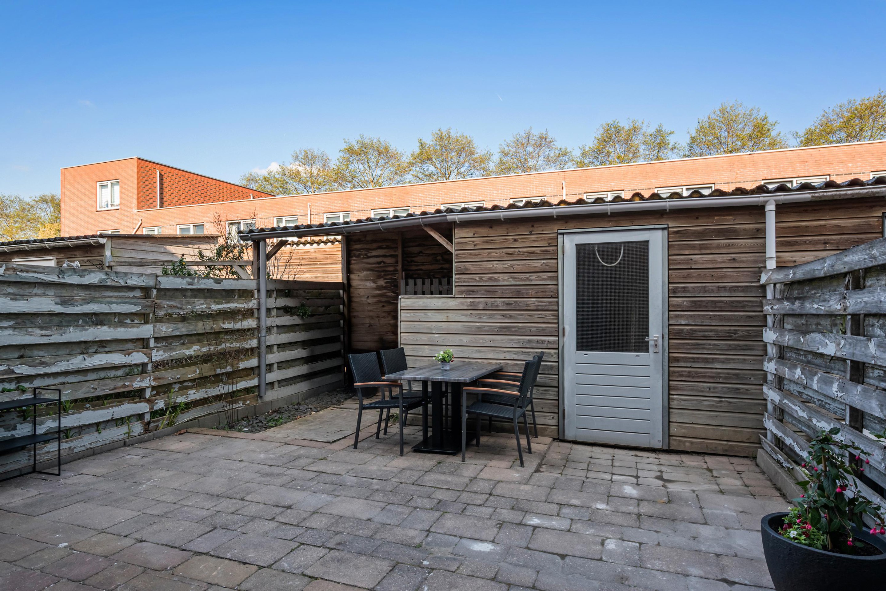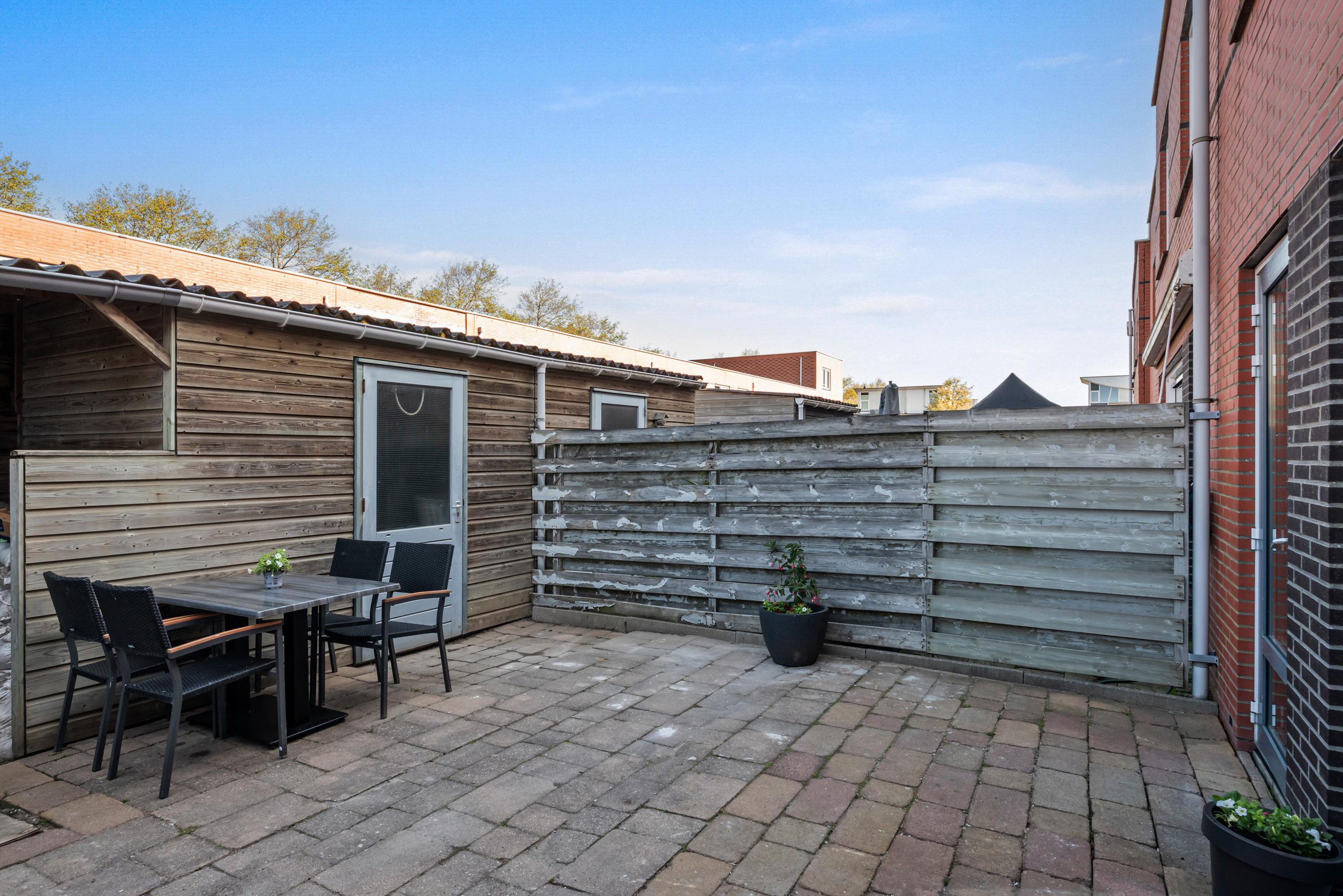 - Buitenleven: De achtertuin ligt ideaal op het noordwesten. Dit betekent dat je na een dag werken nog heerlijk van de middag- en avondzon kunt genieten. De tuin beschikt over een praktische houten schuur voor de fietsen en een handige poort achterom.