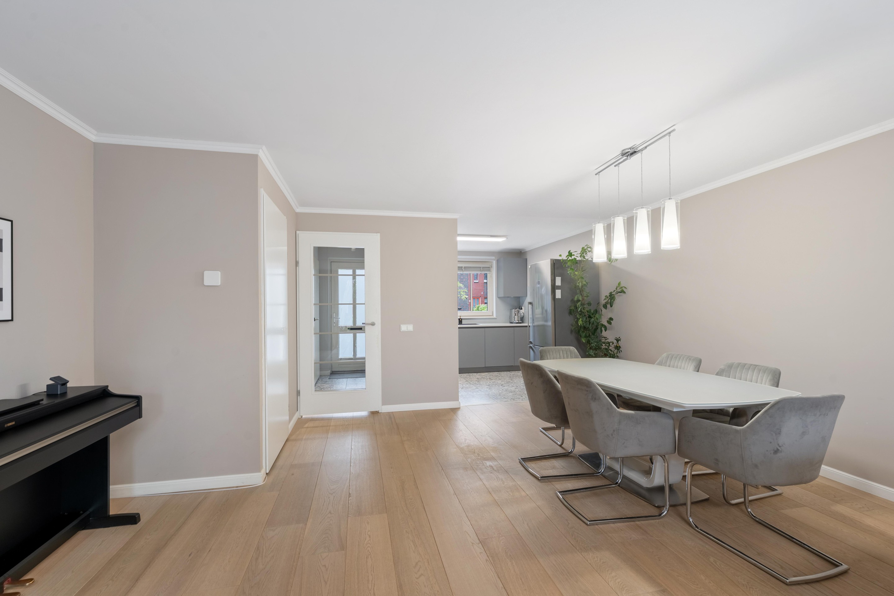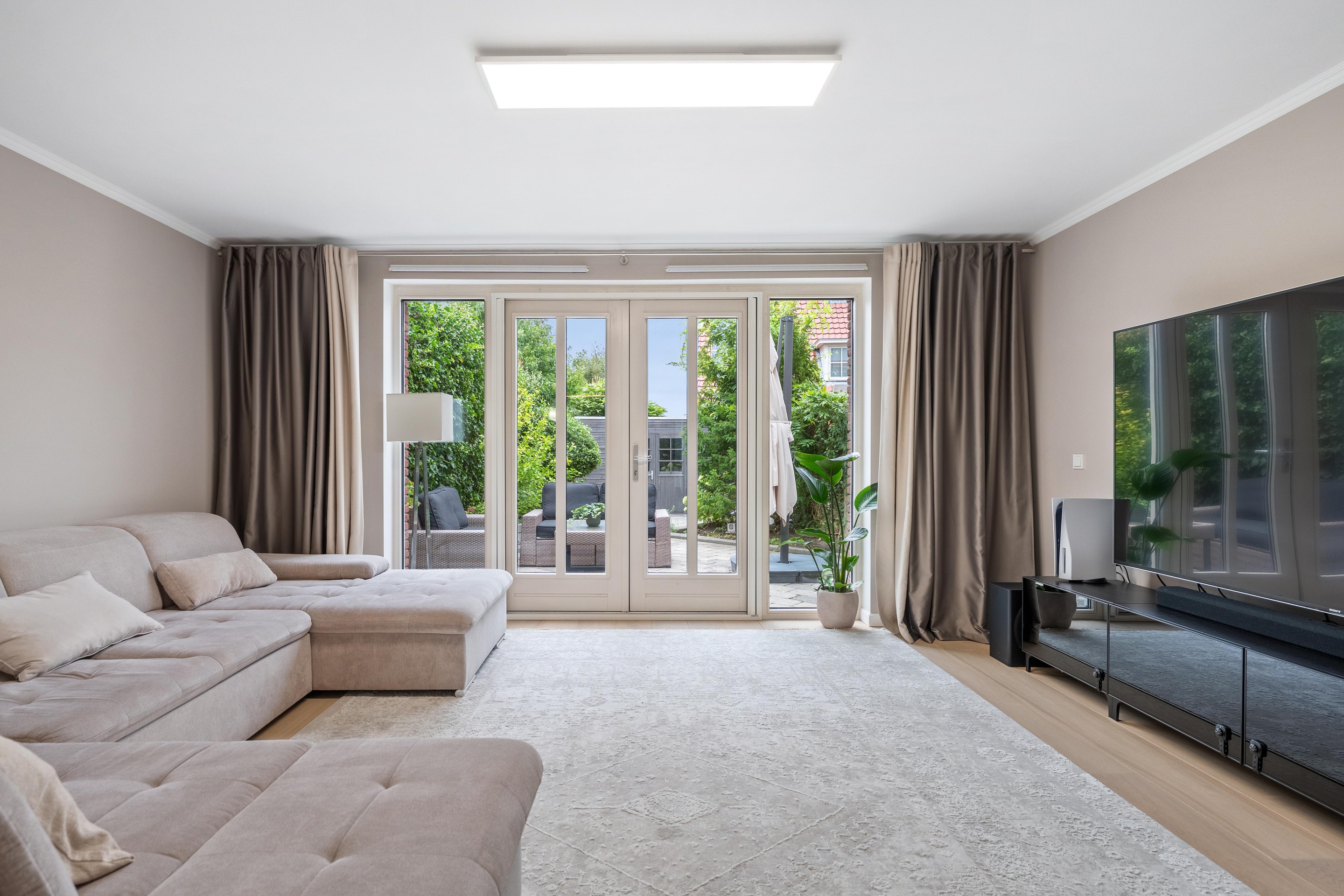 Entrance with hall, meter cupboard, and modern toilet with, bidet, and warm water. The spacious living room, with storage cupboard, was extended by 2.5 meters during construction. French doors provide access to the deep, well-kept backyard where you can enjoy the sun all day long. At the front, the modern open kitchen (2021) with tiles is equipped with built-in appliances such as a 5-burner gas hob, dishwasher, and oven. The living features a stylish oak wooden floor.