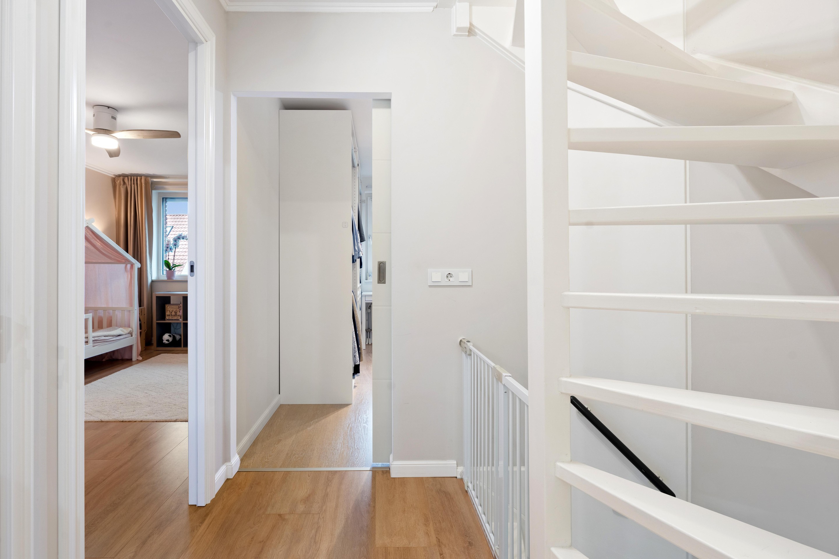 Overloop met drie lichte en ruime slaapkamers., waarvan een dienst doet als walk-in wardrobe. De luxe badkamer (2020) is voorzien van een wandcloset, ligbad/douche en een stijlvol wastafelmeubel.