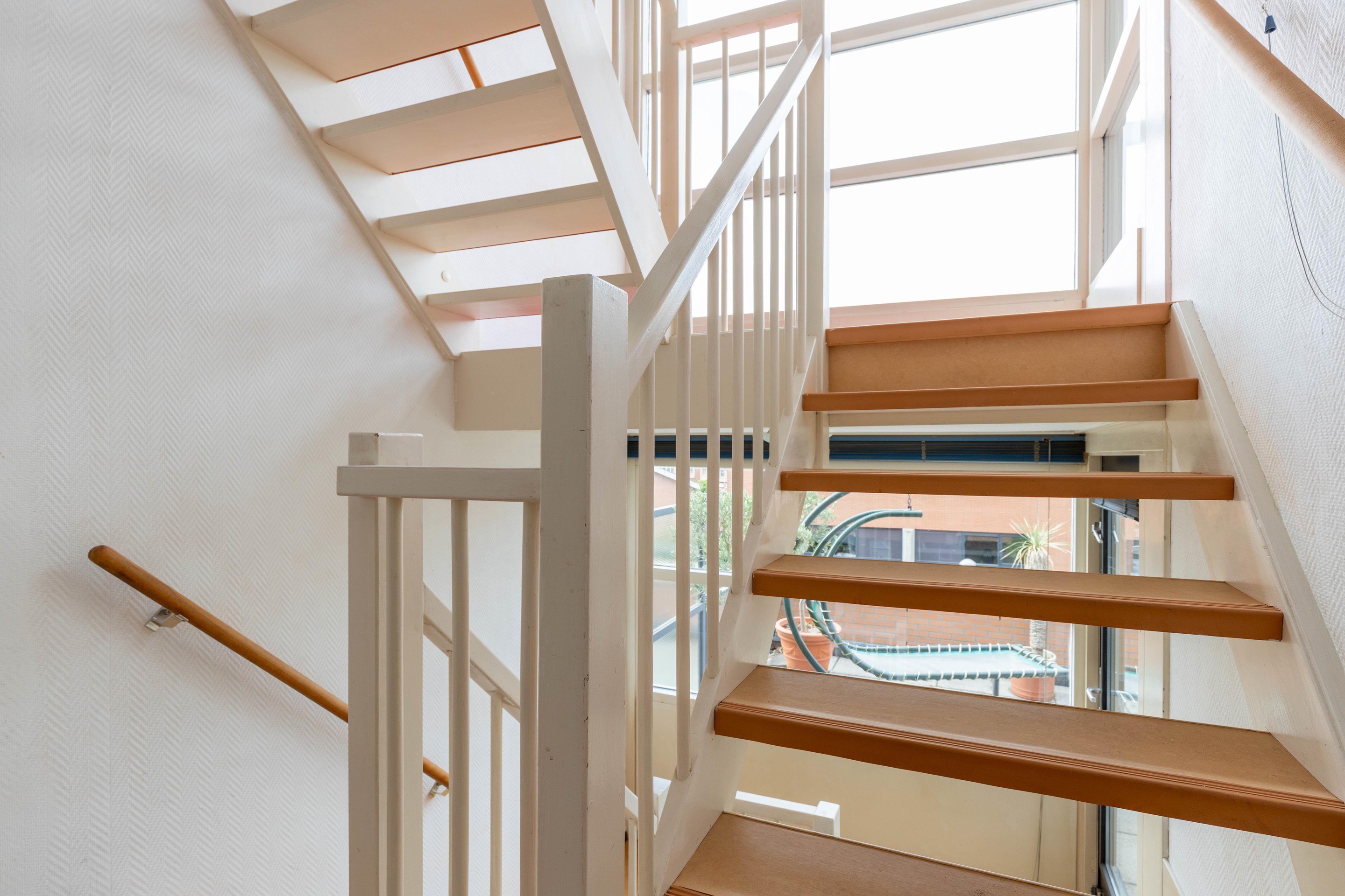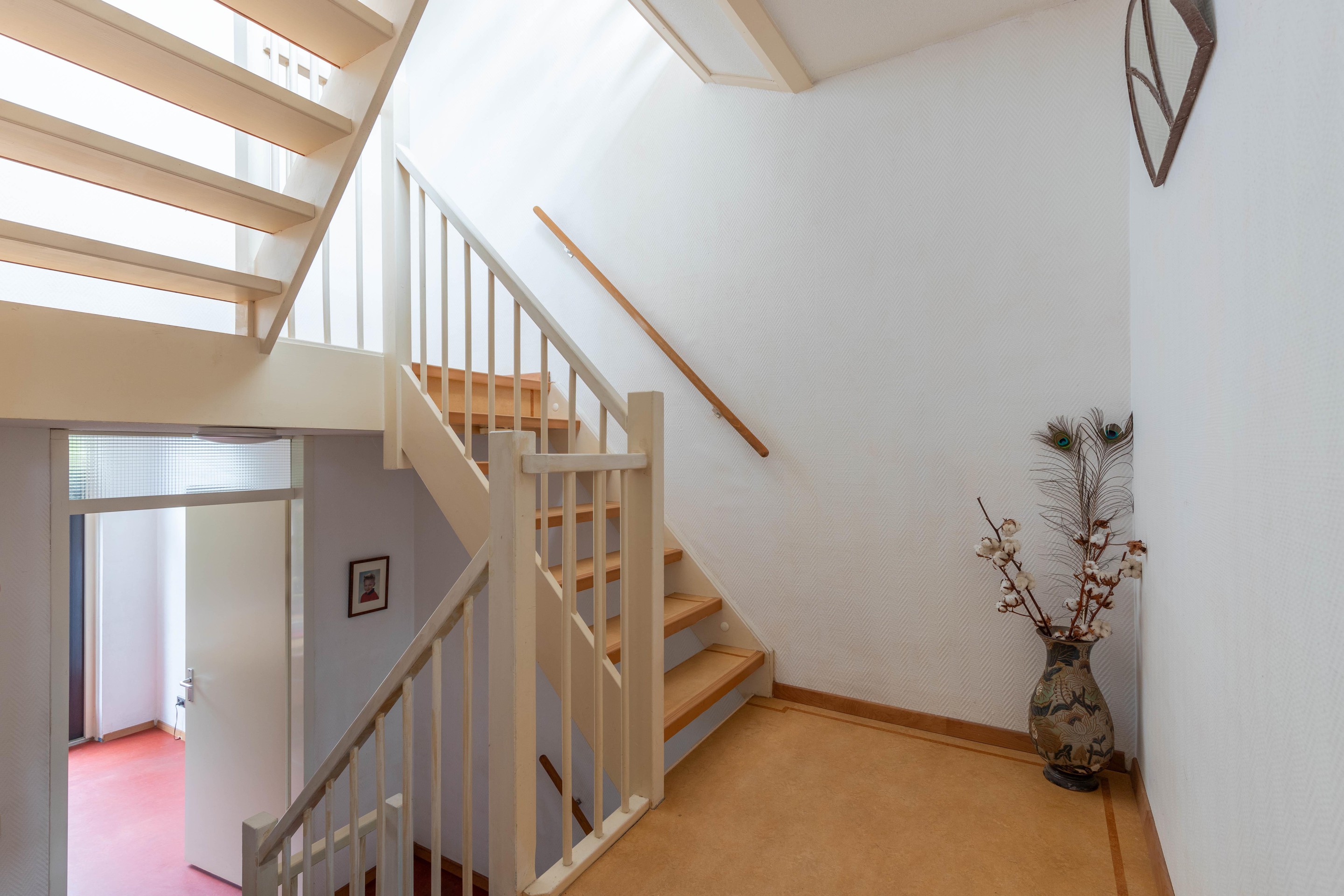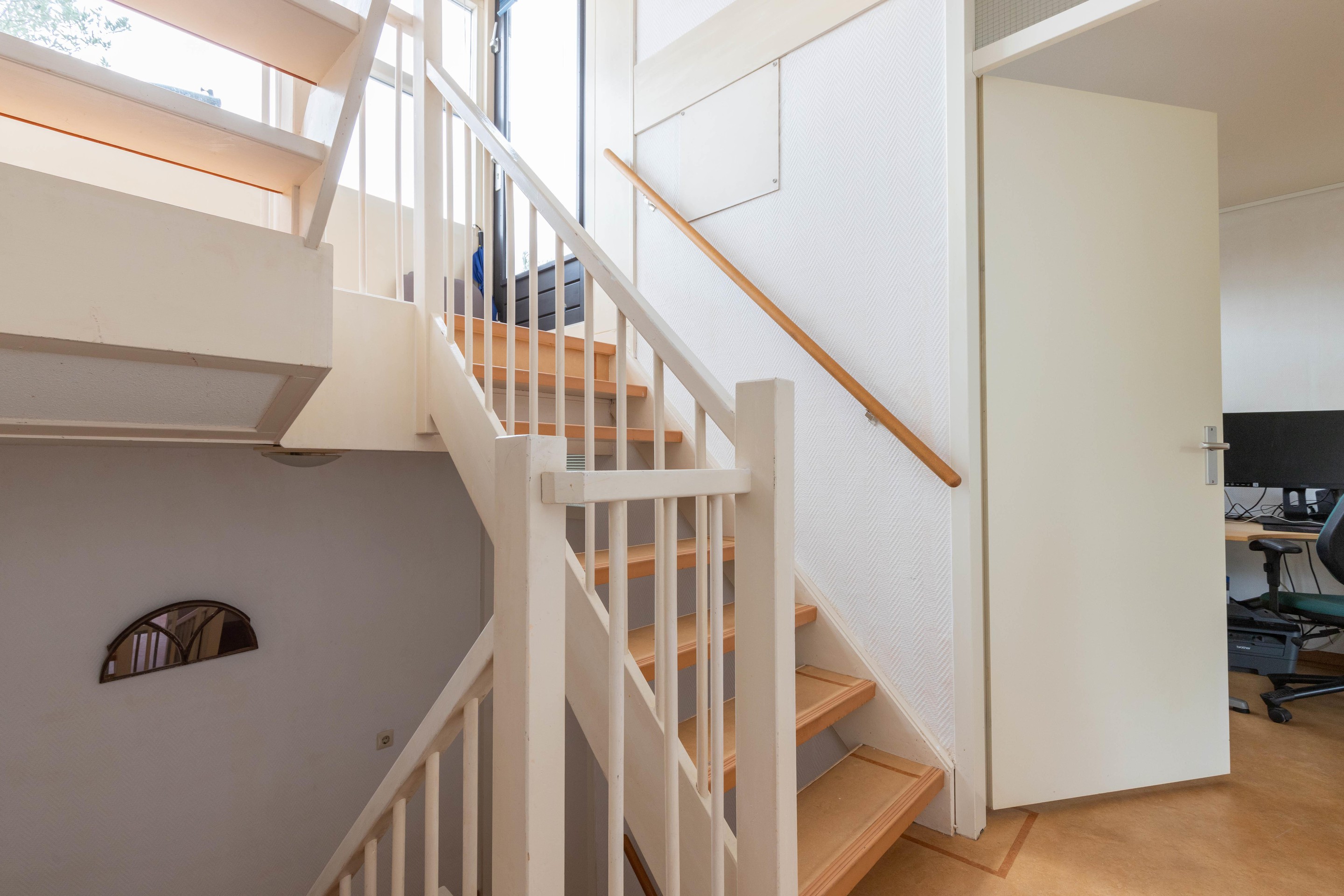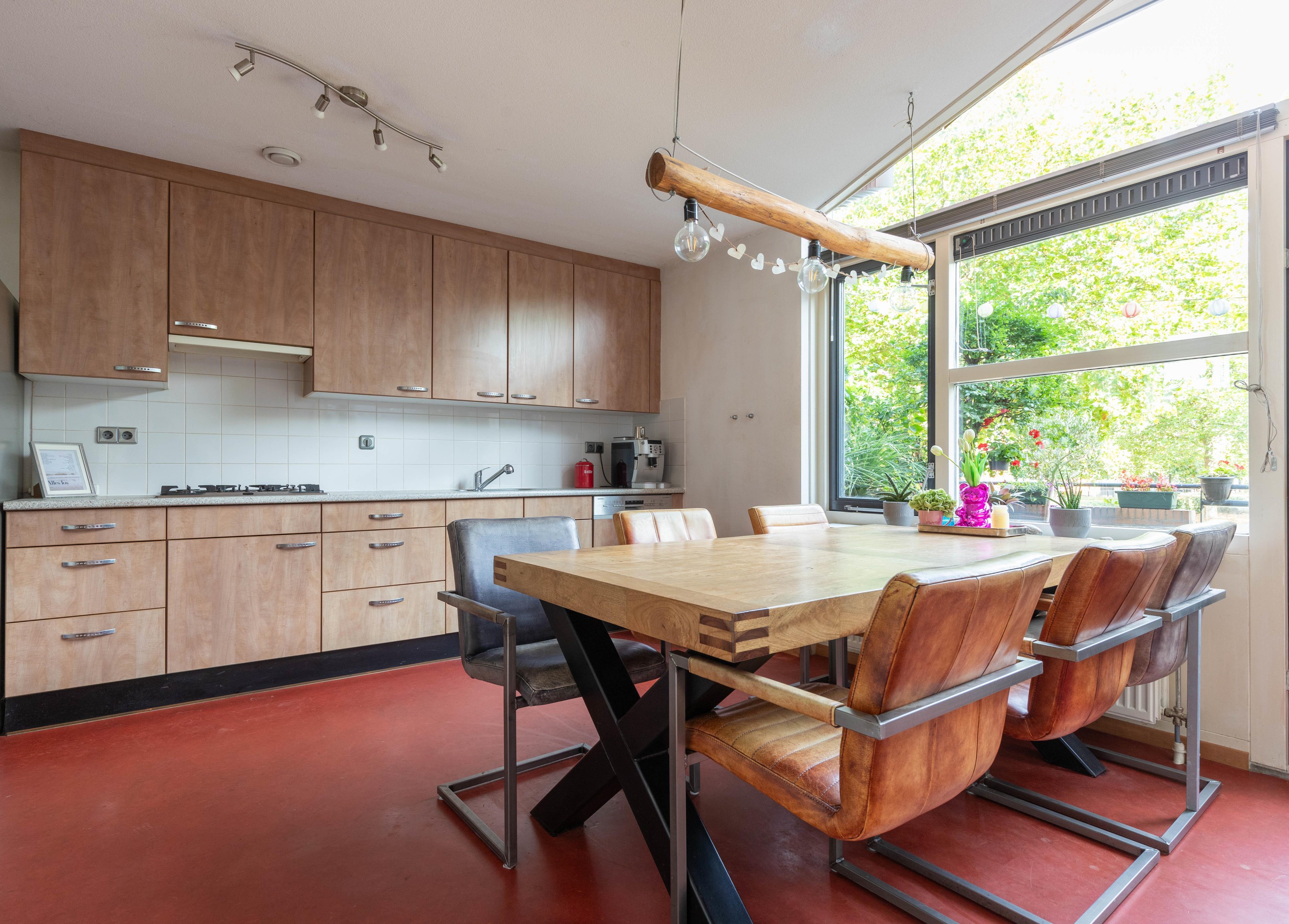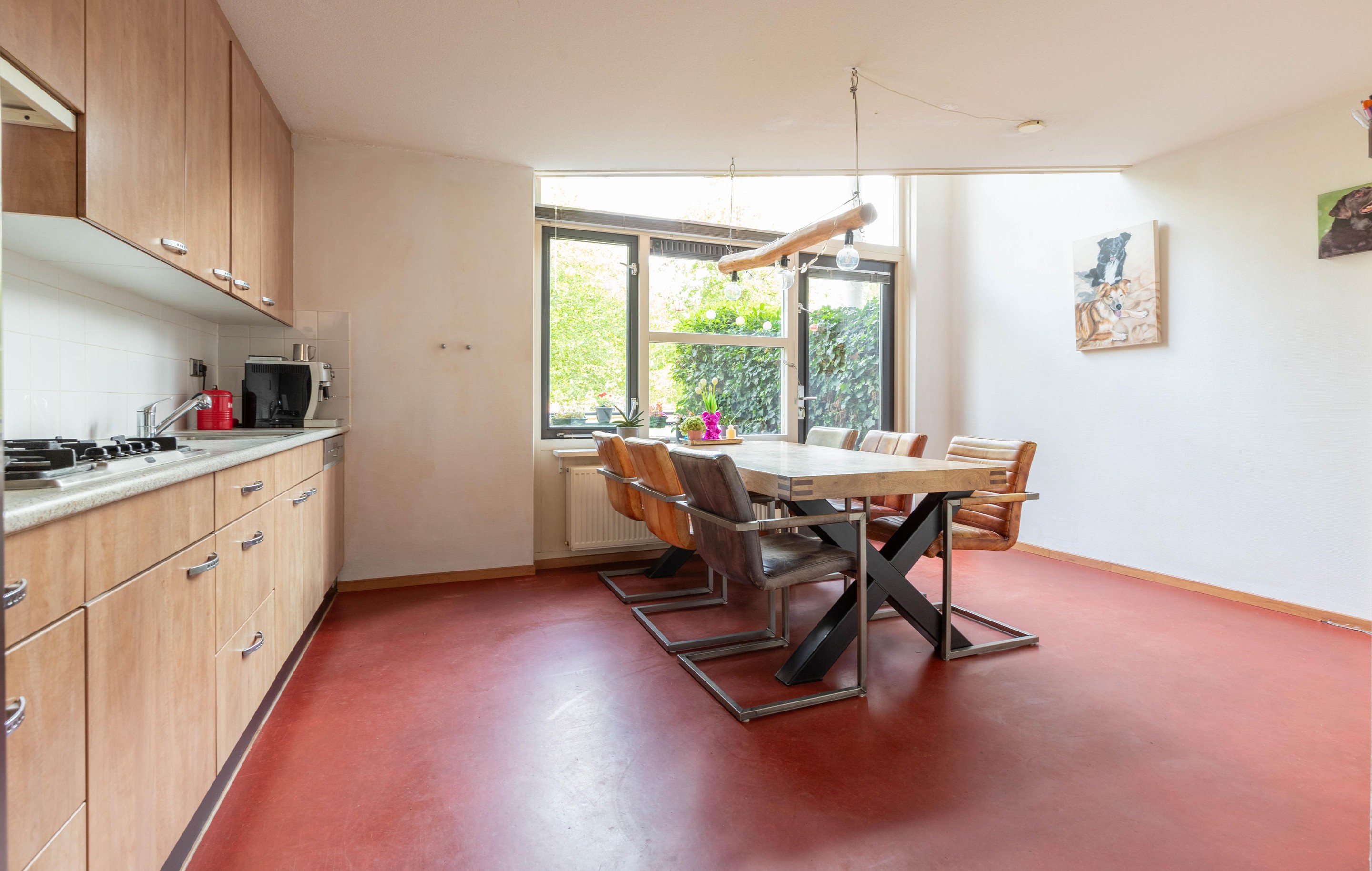 Eerste verdieping De eerste verdieping is opgesplitst in twee levels, de keuken en de woonkamer. De keuken is met recht een woonkeuken, beschik over 5 pits gastoestel, vaatwasser en een koel-/vriescombinatie. Er is toegang tot het rustig gelegen terras aan de achterzijde. Vanuit de keuken is een doorkijkje omhoog naar de woonkamer. De L-vormige woonkamer is ruim en licht en geeft op zijn beurt ook weer een doorkijk naar de hoger gelegen werkkamer.