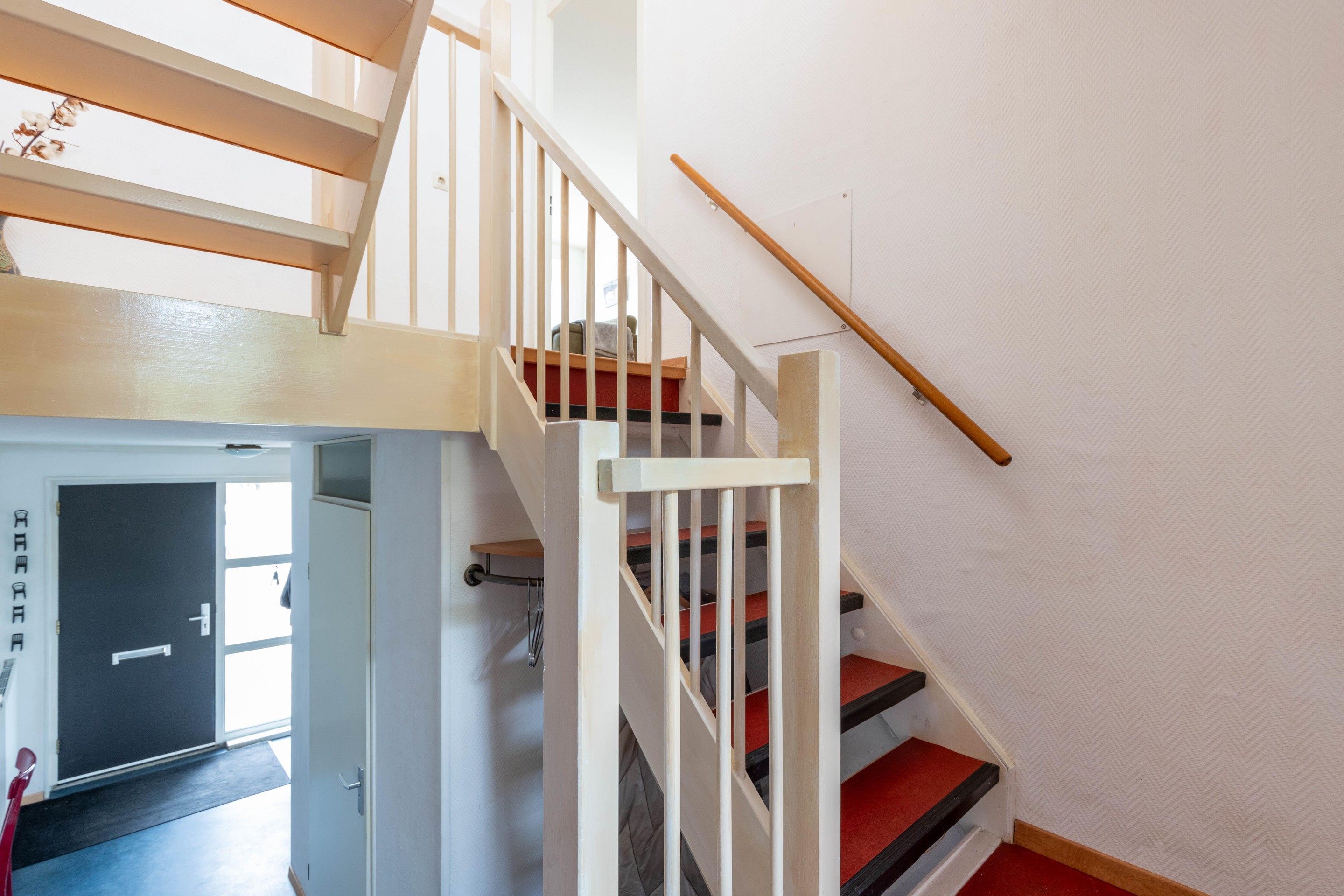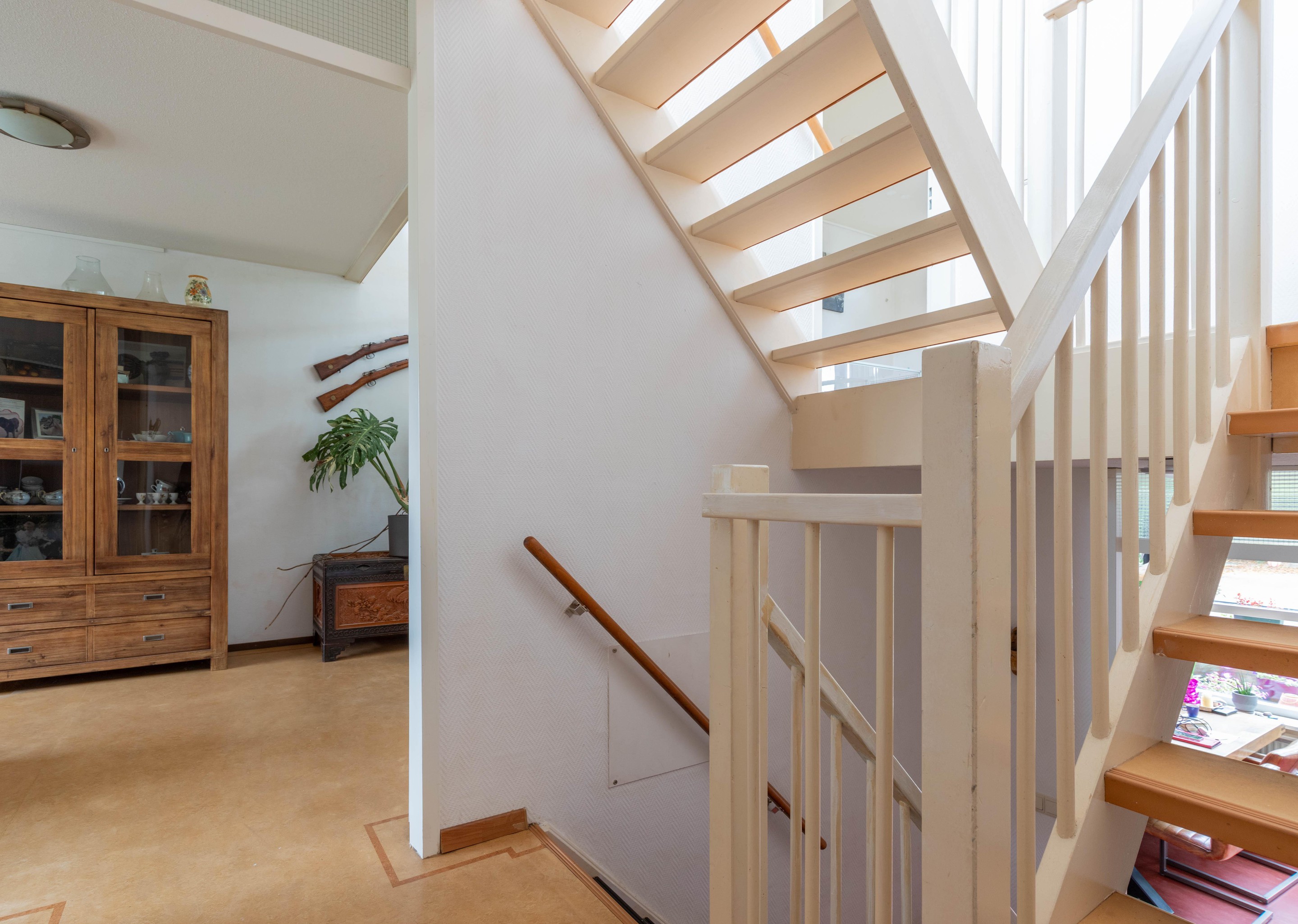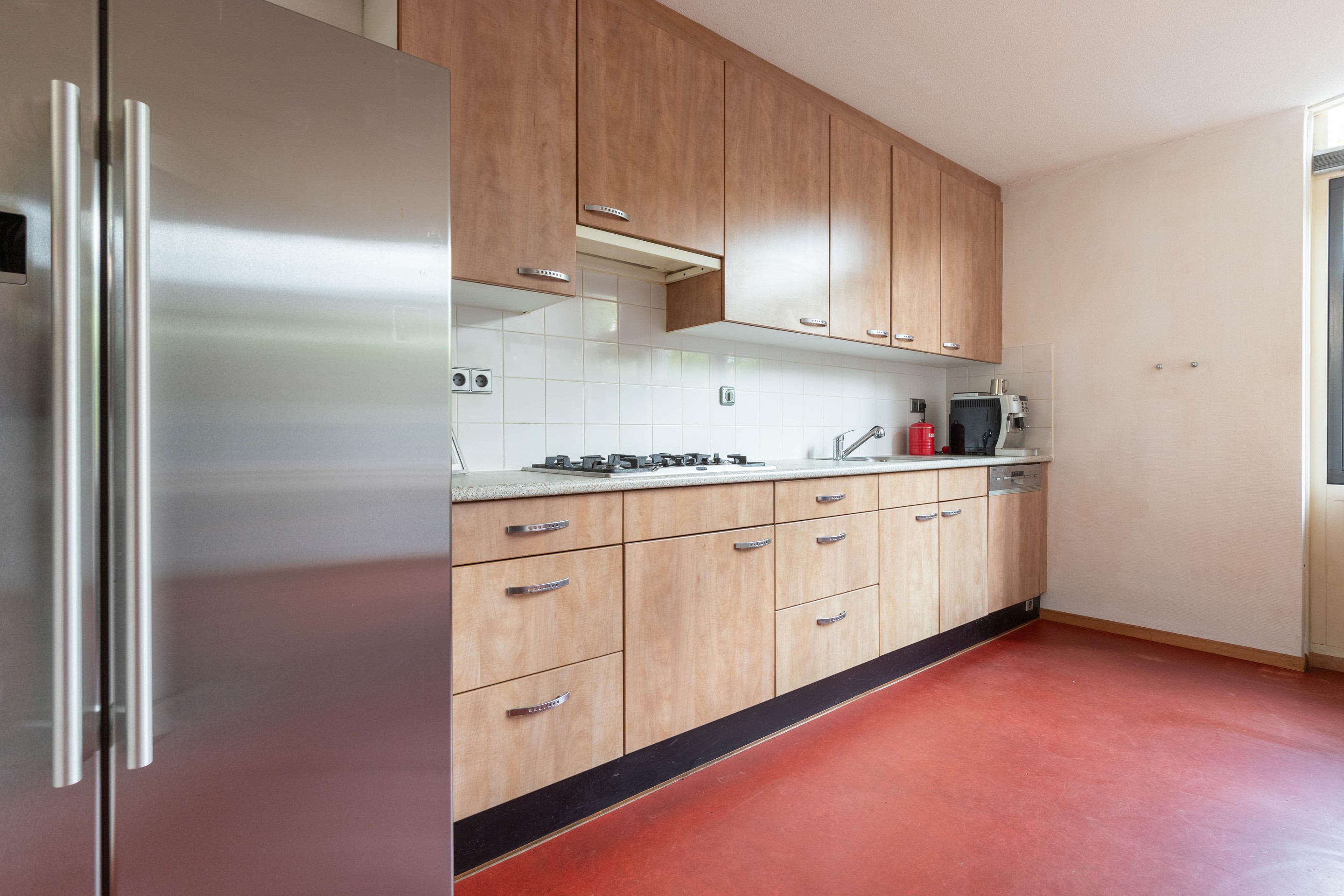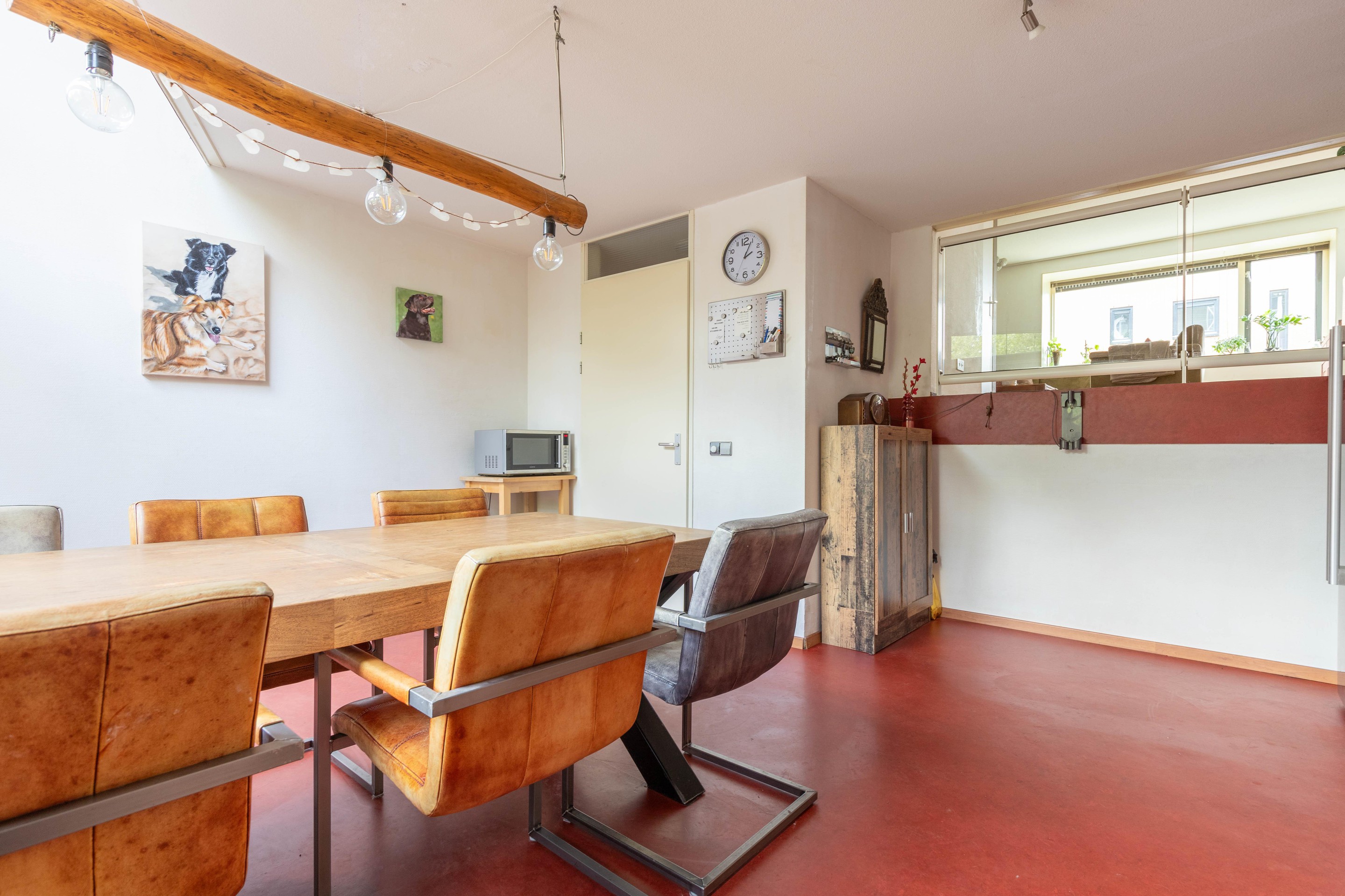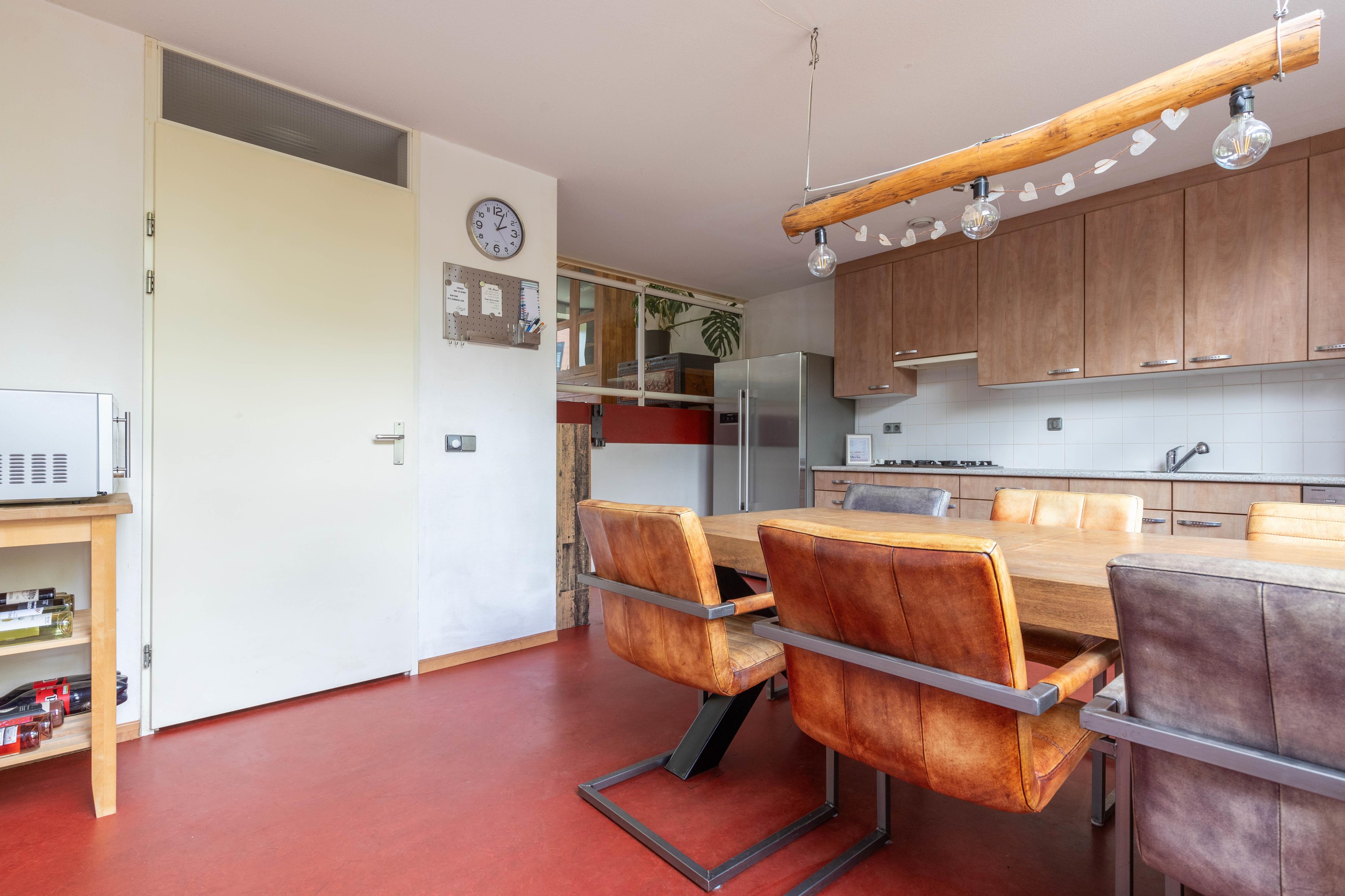 Eerste verdieping De eerste verdieping is opgesplitst in twee levels, de keuken en de woonkamer. De keuken is met recht een woonkeuken, beschik over 5 pits gastoestel, vaatwasser en een koel-/vriescombinatie. Er is toegang tot het rustig gelegen terras aan de achterzijde. Vanuit de keuken is een doorkijkje omhoog naar de woonkamer. De L-vormige woonkamer is ruim en licht en geeft op zijn beurt ook weer een doorkijk naar de hoger gelegen werkkamer.