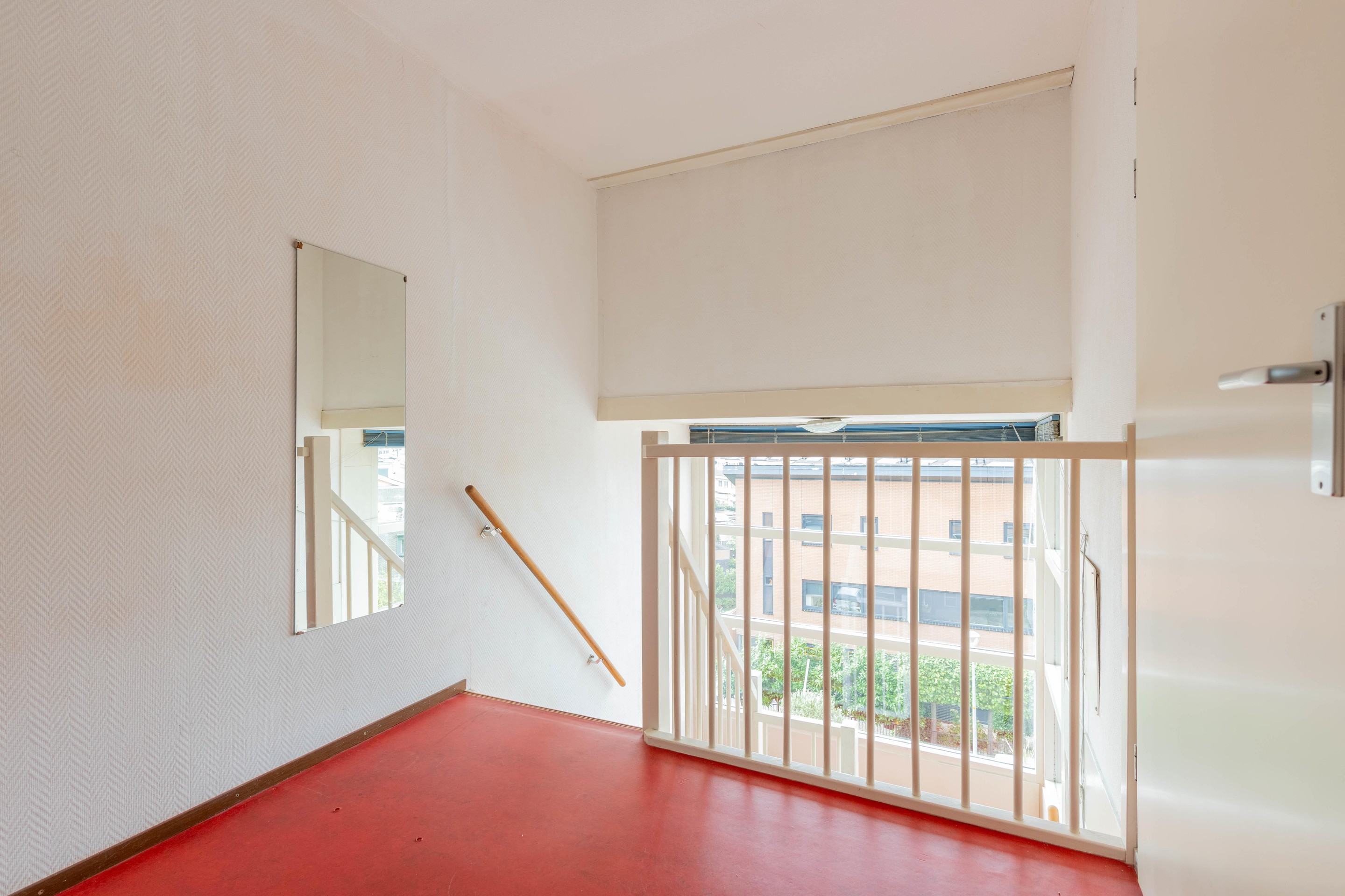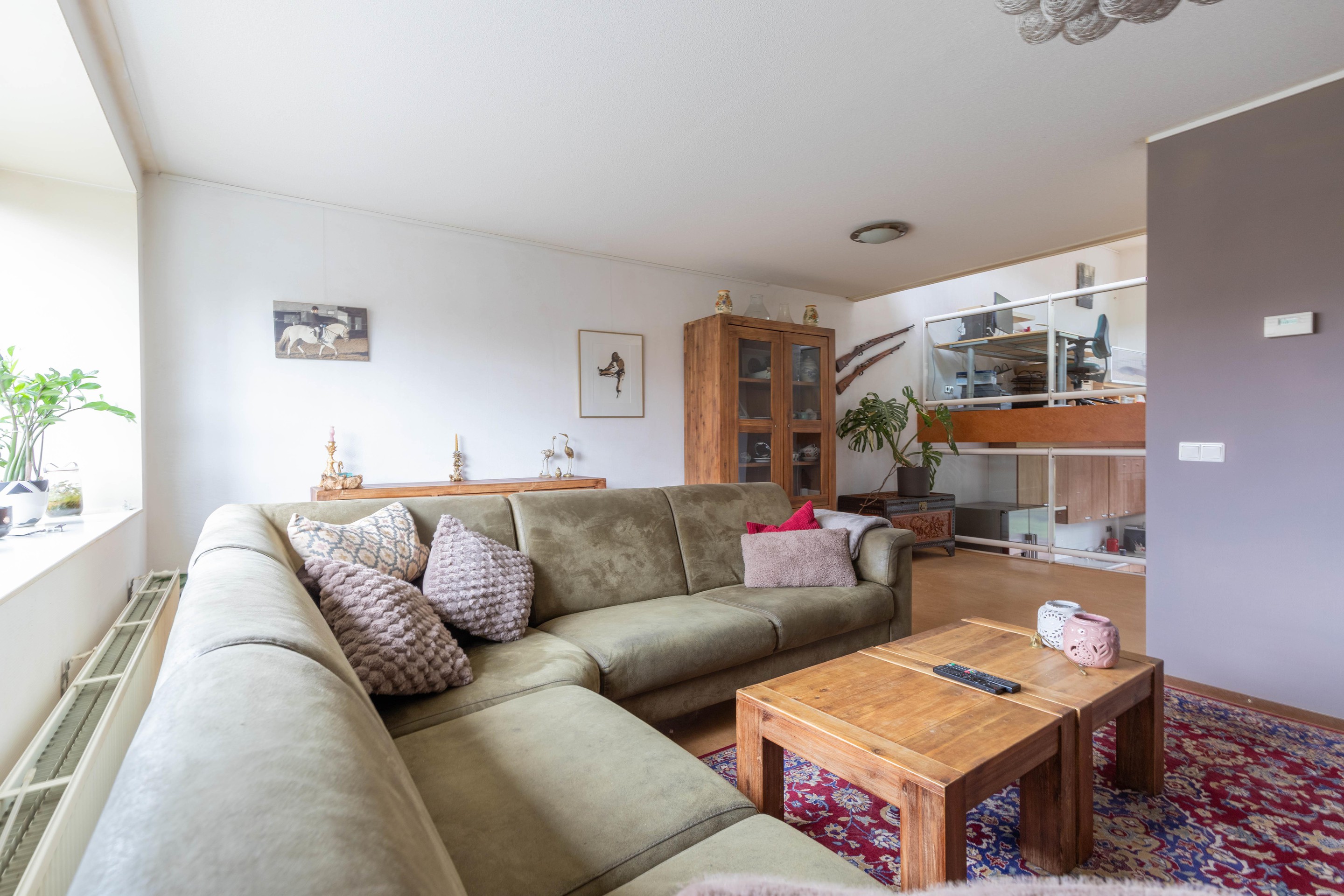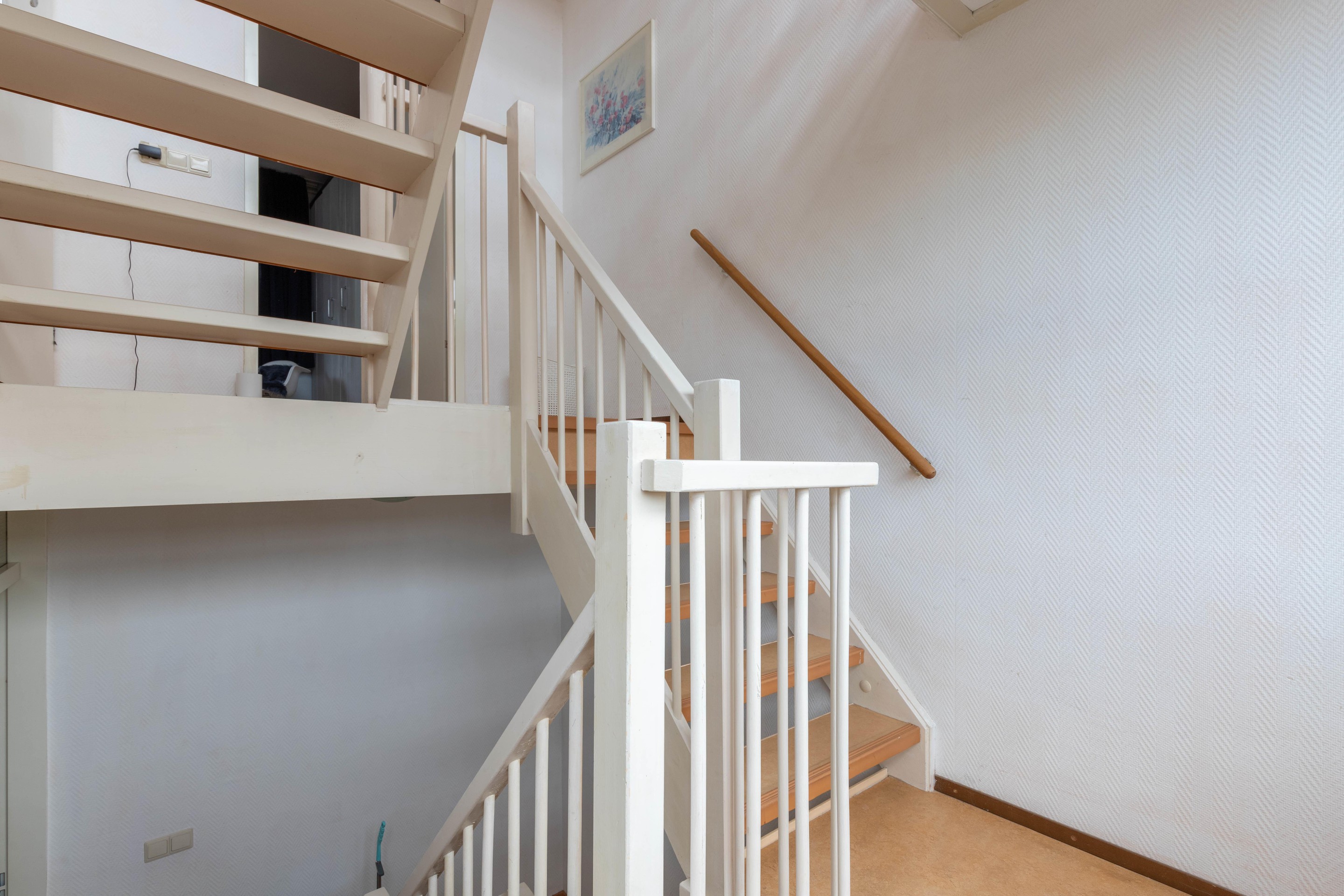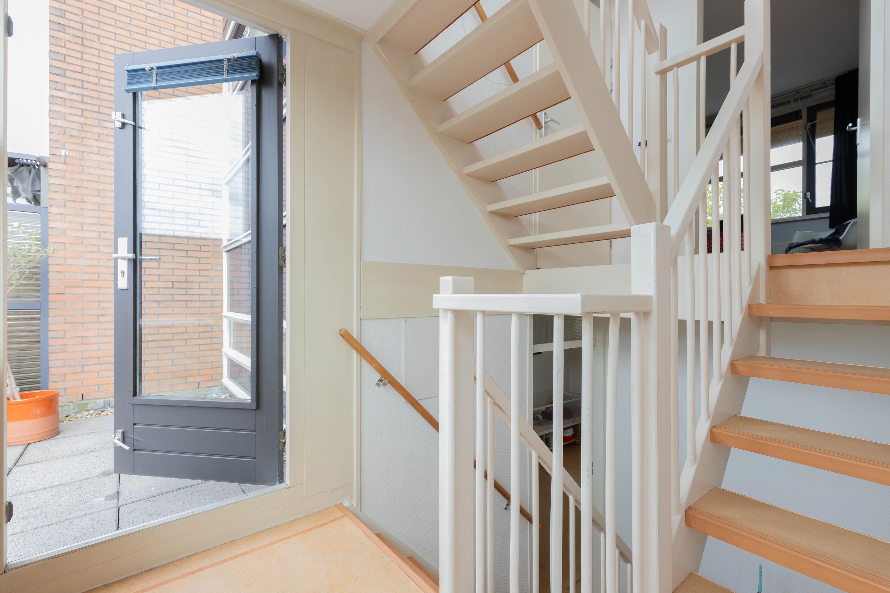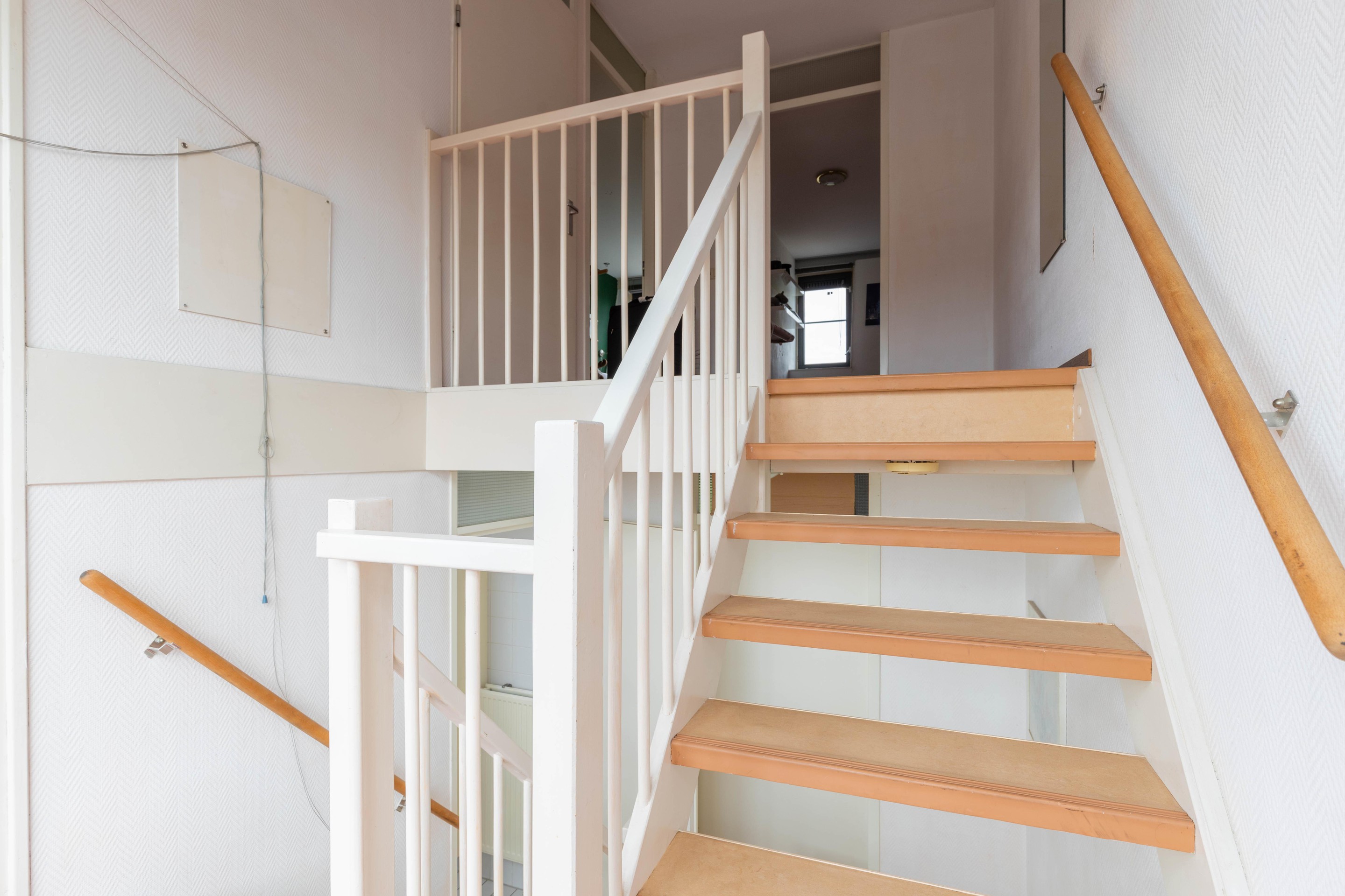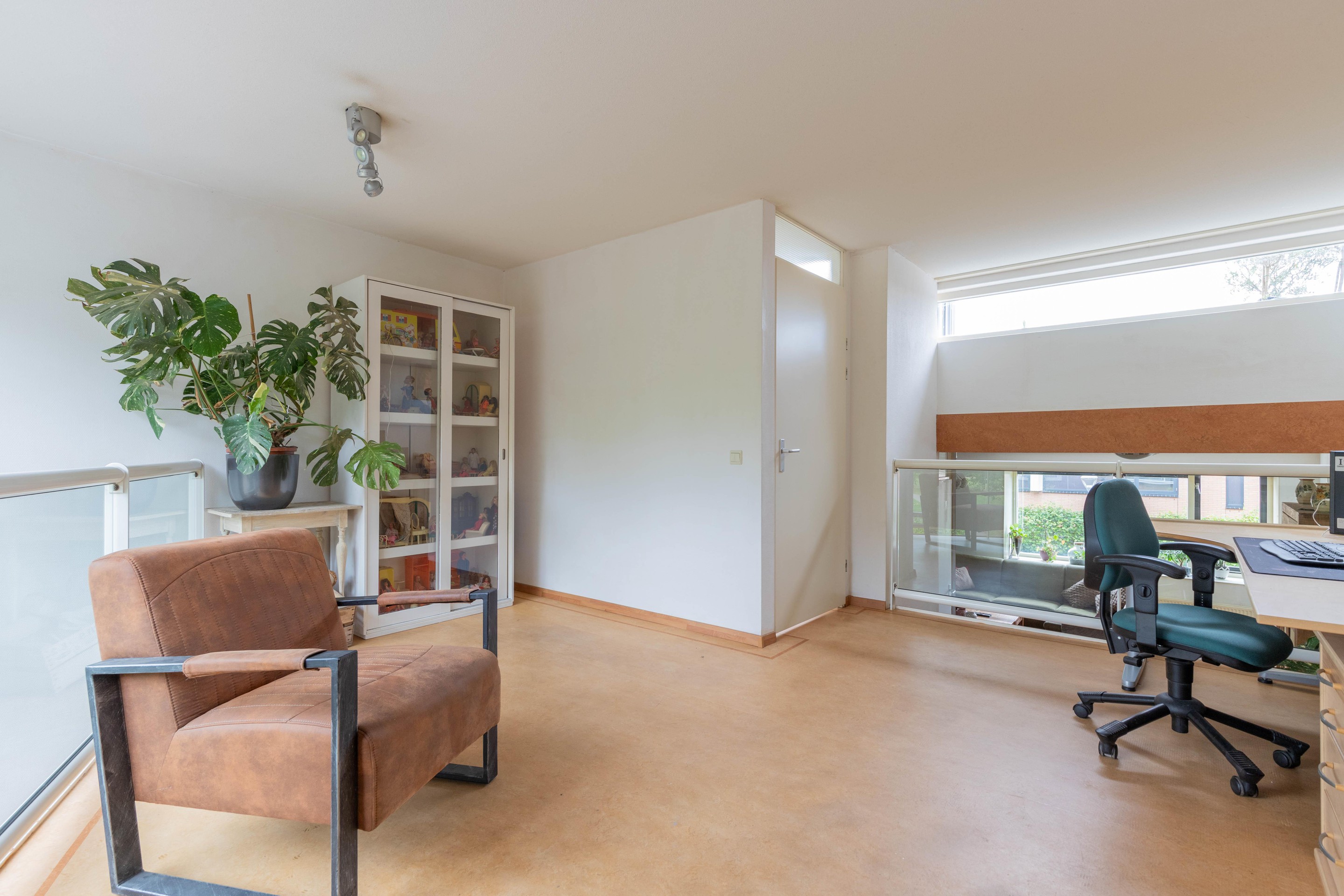 Eerste verdieping De eerste verdieping is opgesplitst in twee levels, de keuken en de woonkamer. De keuken is met recht een woonkeuken, beschik over 5 pits gastoestel, vaatwasser en een koel-/vriescombinatie. Er is toegang tot het rustig gelegen terras aan de achterzijde. Vanuit de keuken is een doorkijkje omhoog naar de woonkamer. De L-vormige woonkamer is ruim en licht en geeft op zijn beurt ook weer een doorkijk naar de hoger gelegen werkkamer.