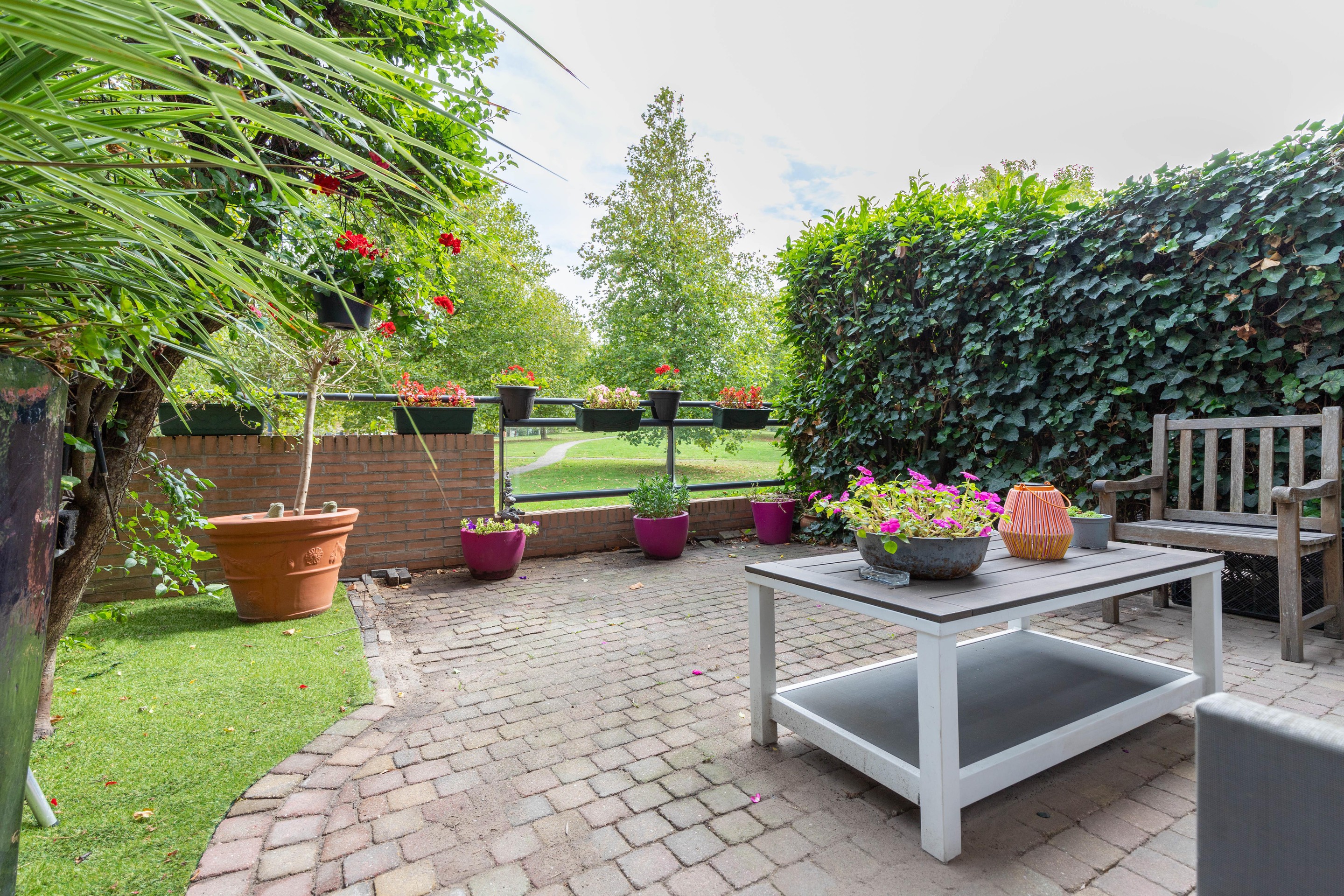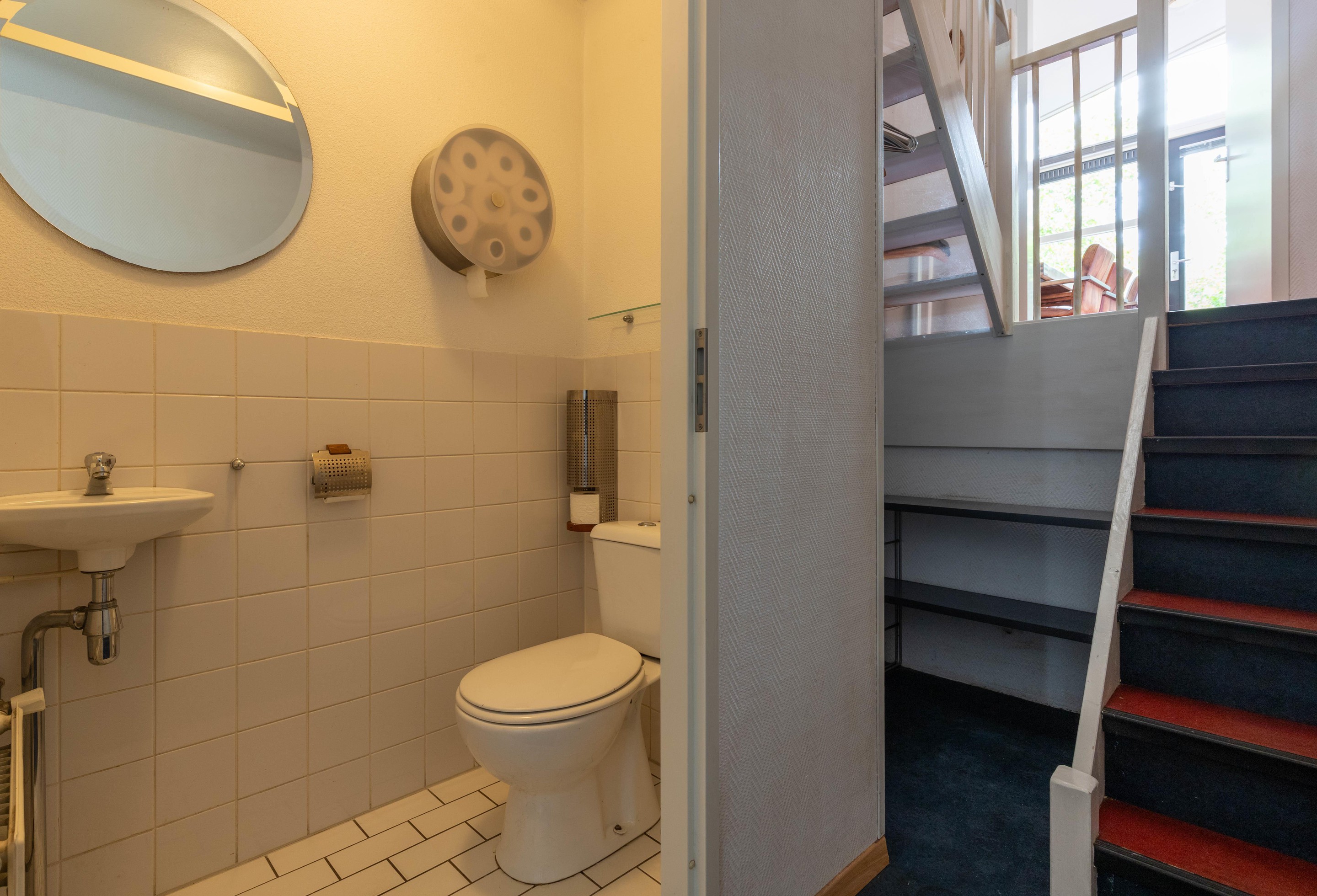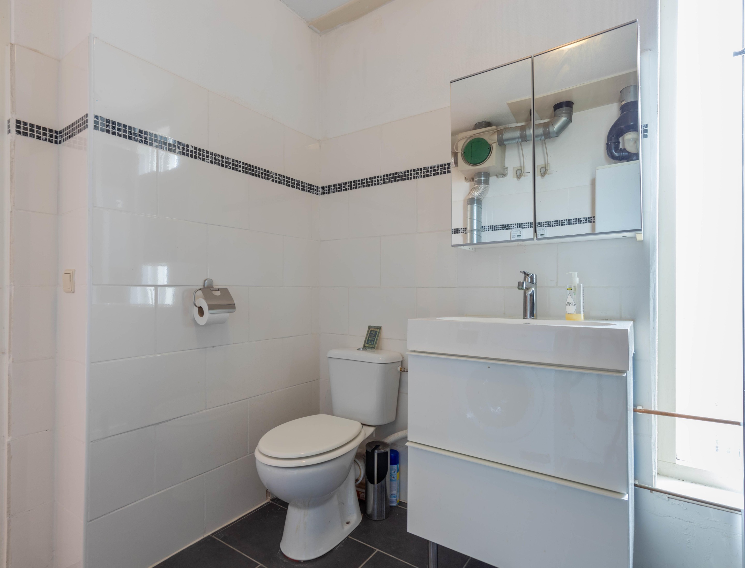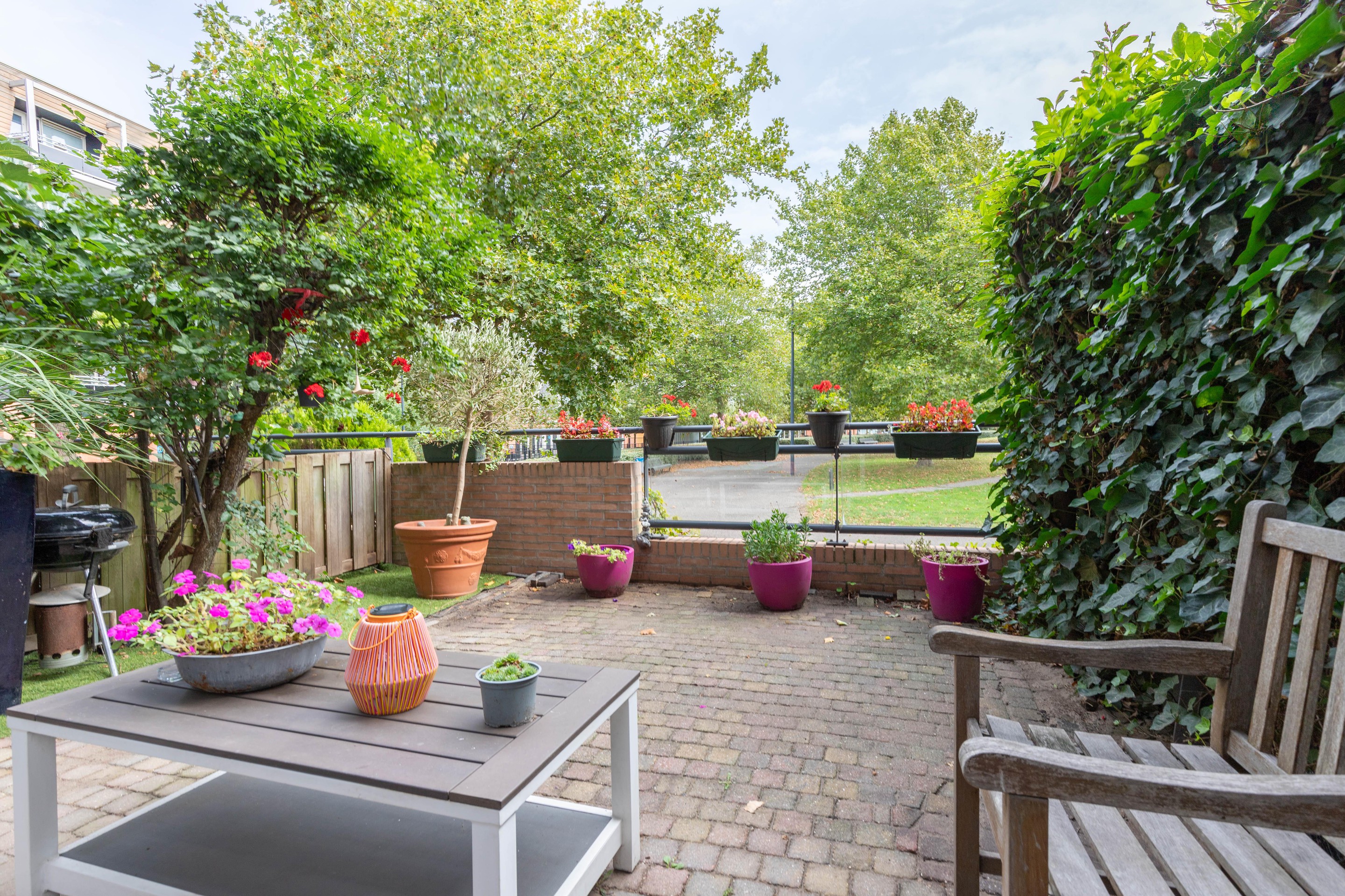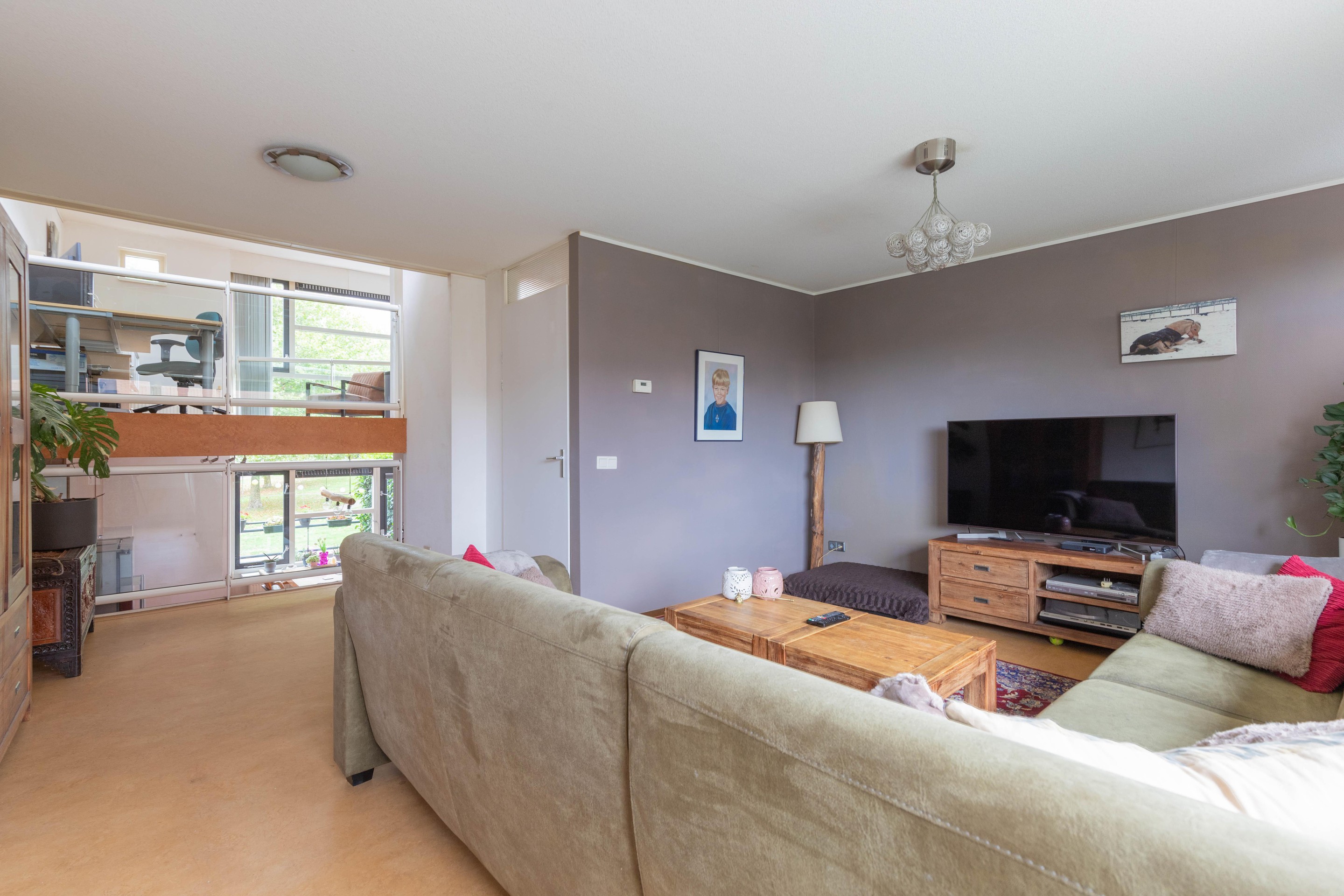 Eerste verdieping De eerste verdieping is opgesplitst in twee levels, de keuken en de woonkamer. De keuken is met recht een woonkeuken, beschik over 5 pits gastoestel, vaatwasser en een koel-/vriescombinatie. Er is toegang tot het rustig gelegen terras aan de achterzijde. Vanuit de keuken is een doorkijkje omhoog naar de woonkamer. De L-vormige woonkamer is ruim en licht en geeft op zijn beurt ook weer een doorkijk naar de hoger gelegen werkkamer.
