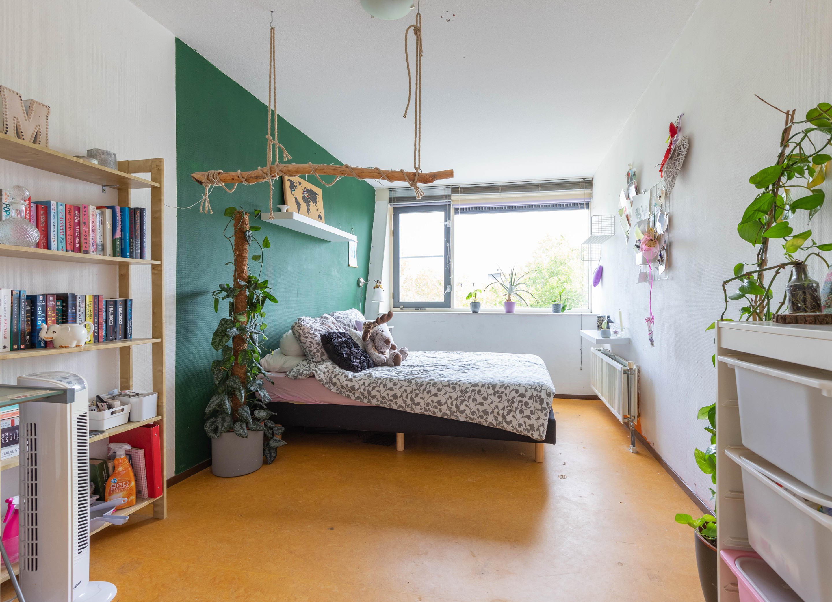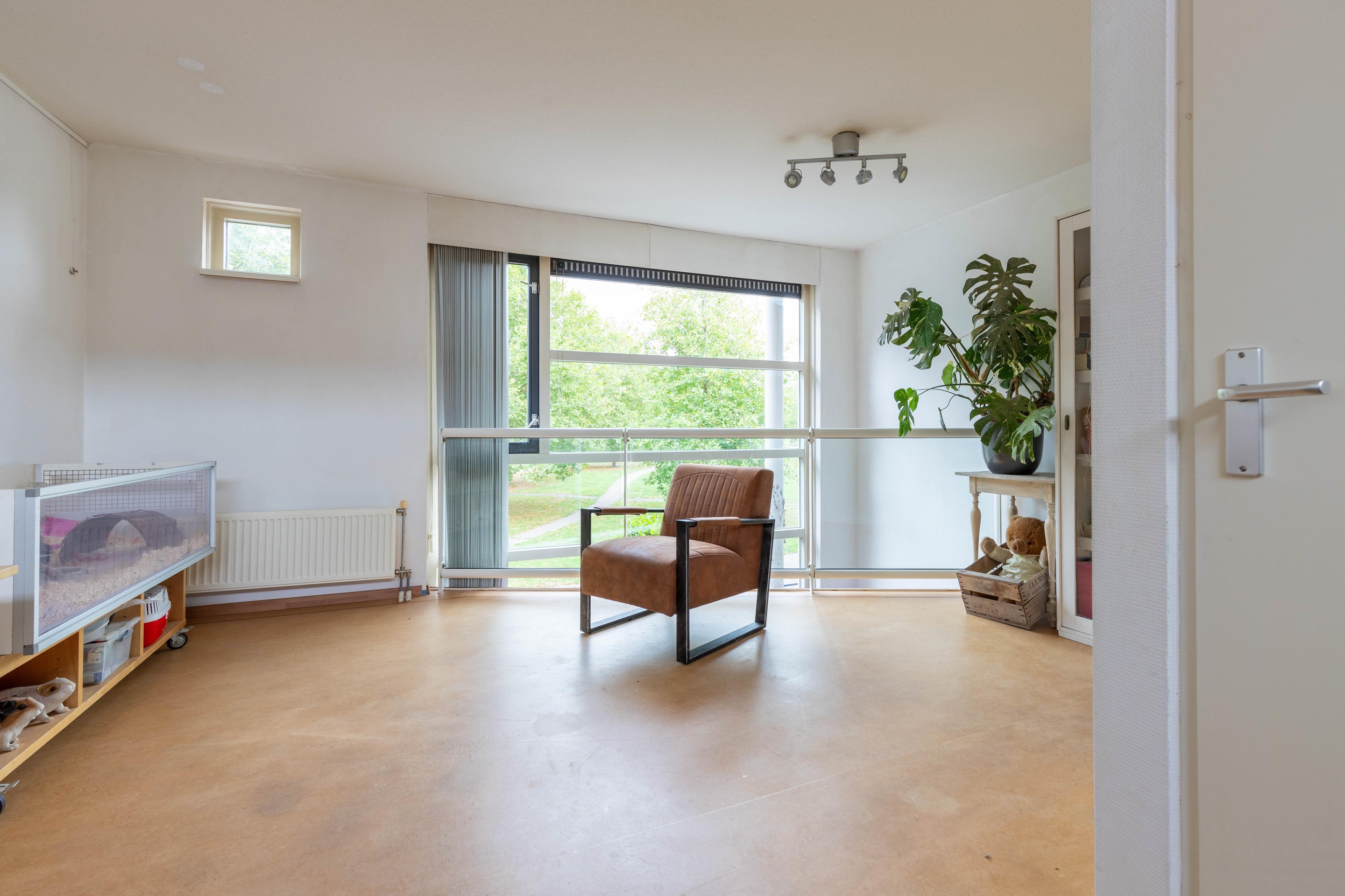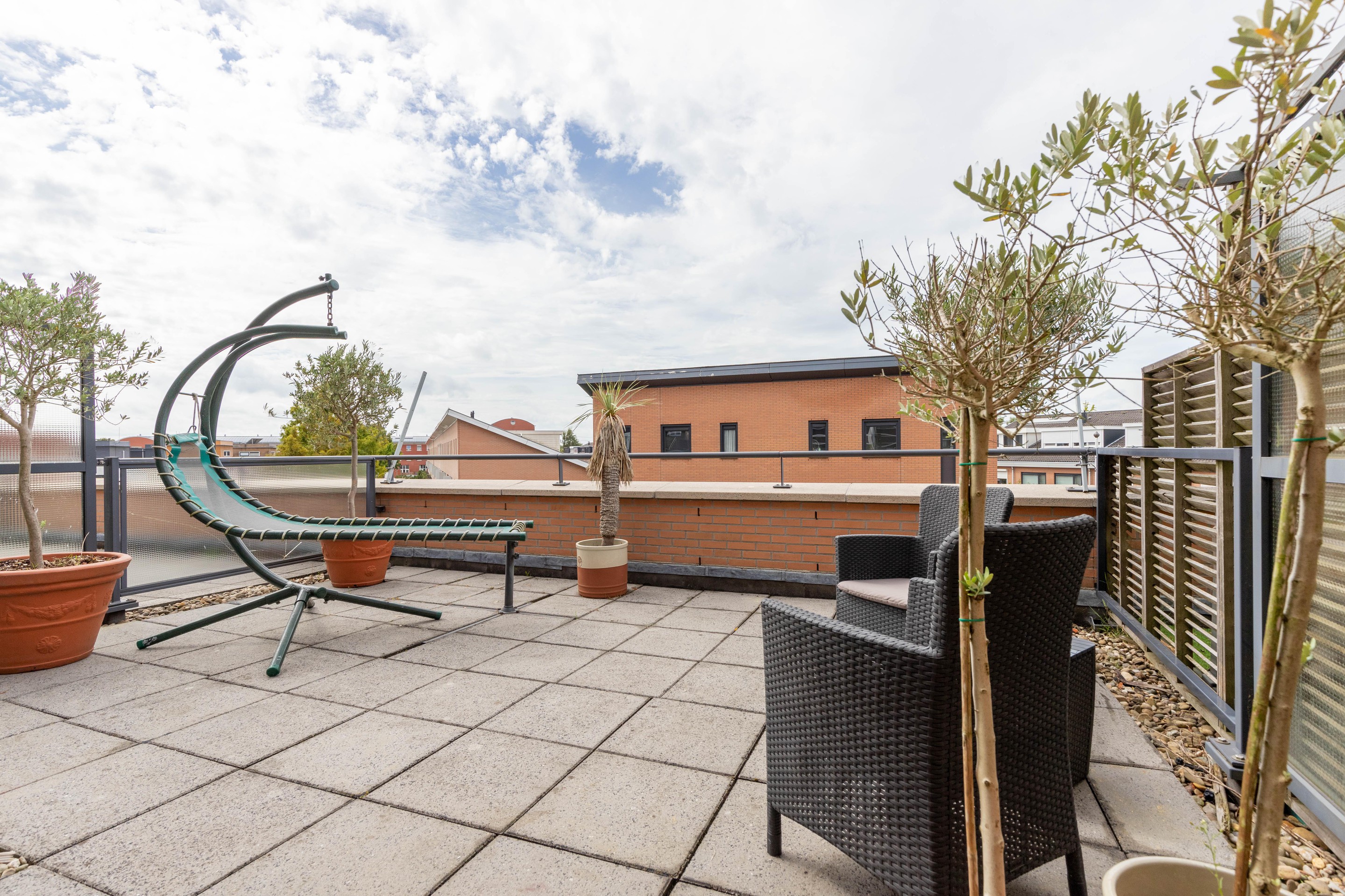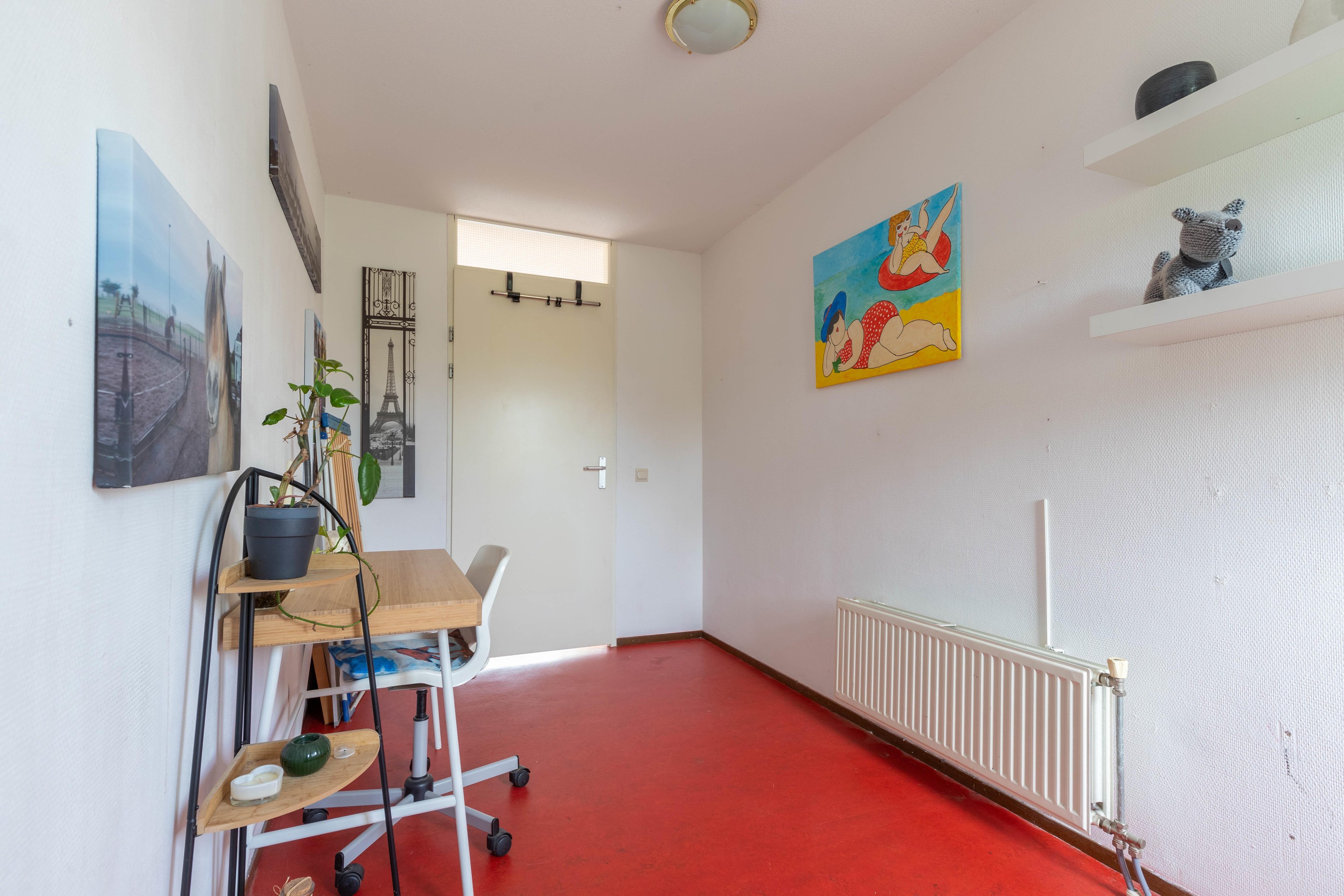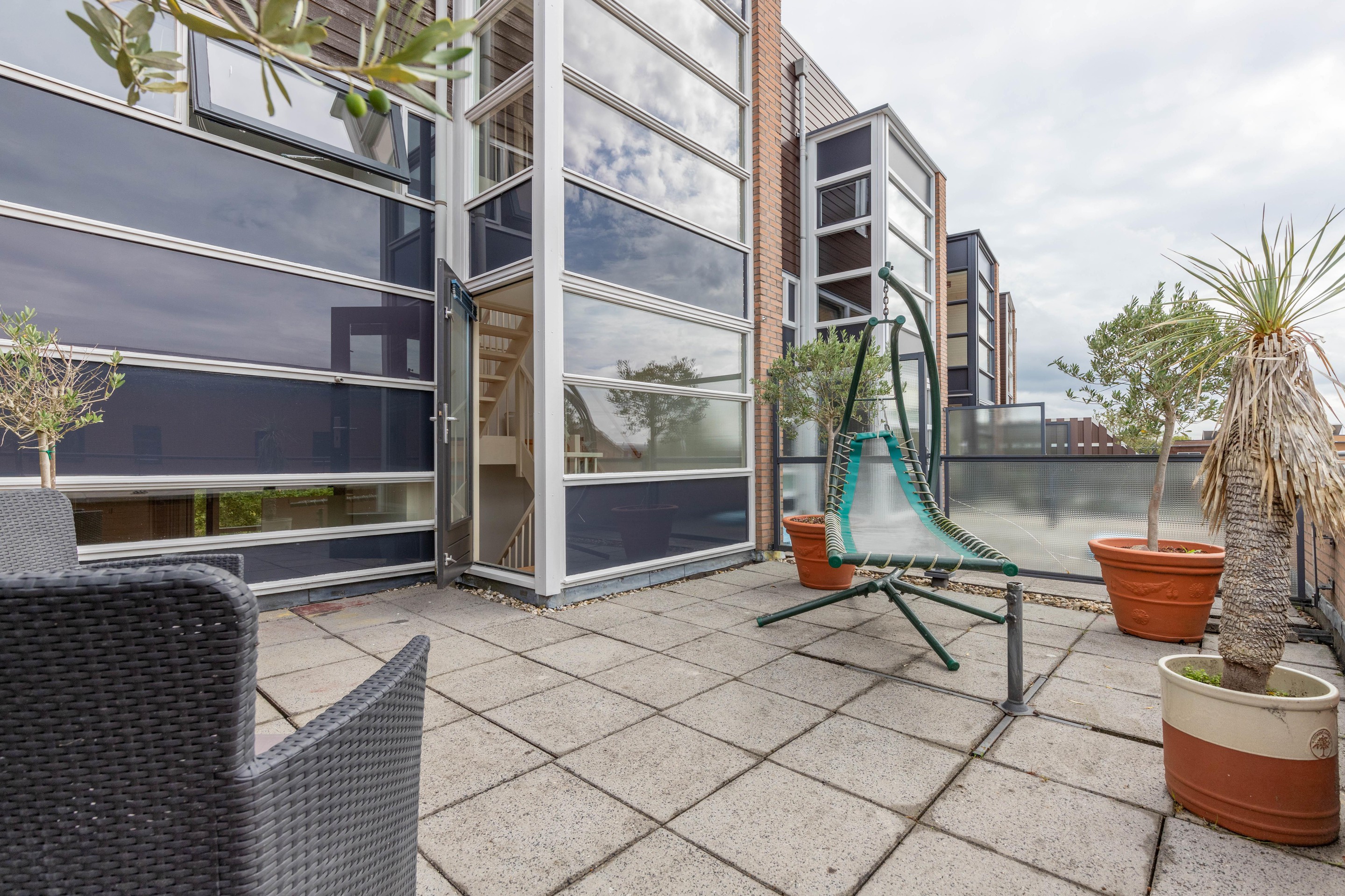 Tweede verdieping De videkamer schuin boven de woonkamer is een praktische ruimte. Inzetbaar als televisiekamer, werkkamer, etc. De kamer functioneert ook als vide met aan de achterzijde connectie met de ondergelegen keuken. Er is fraai uitzicht over het achtergelegen park. Weer een kleine verspringing naar boven via het traphuis ligt aan de voorzijde een ruim dakterras. Hier is de avondzon goed op te vangen.