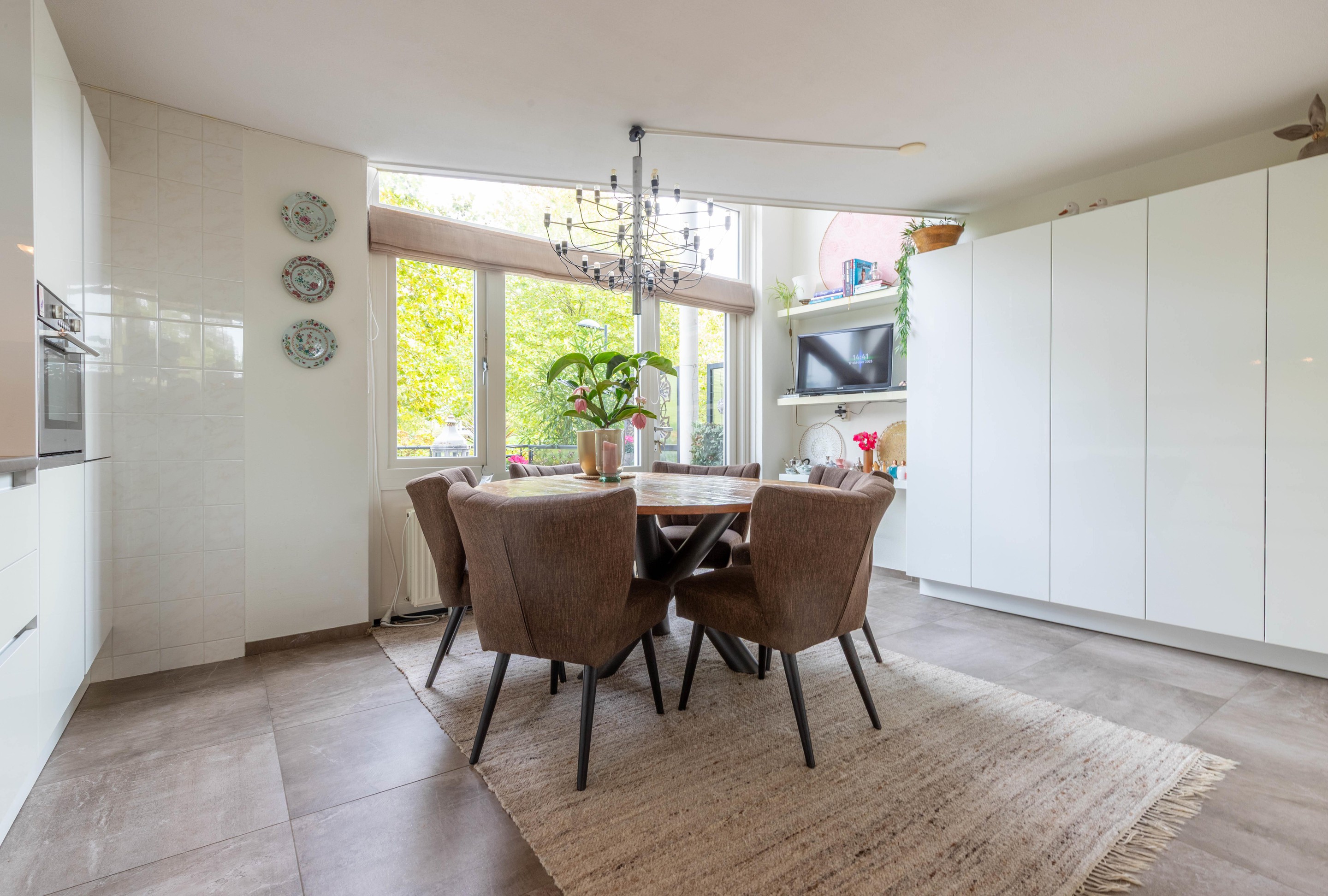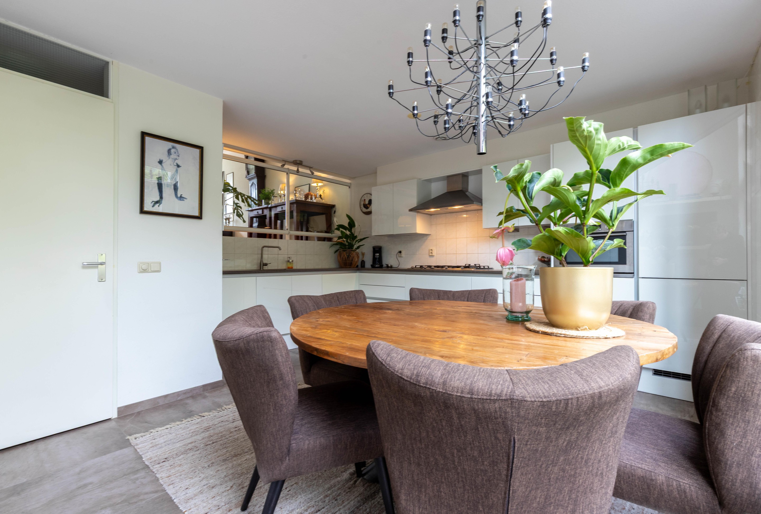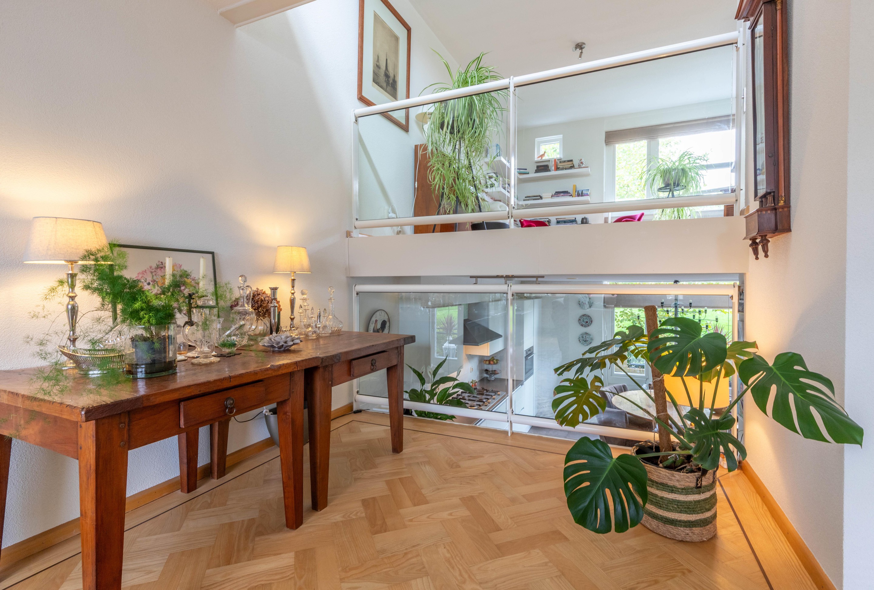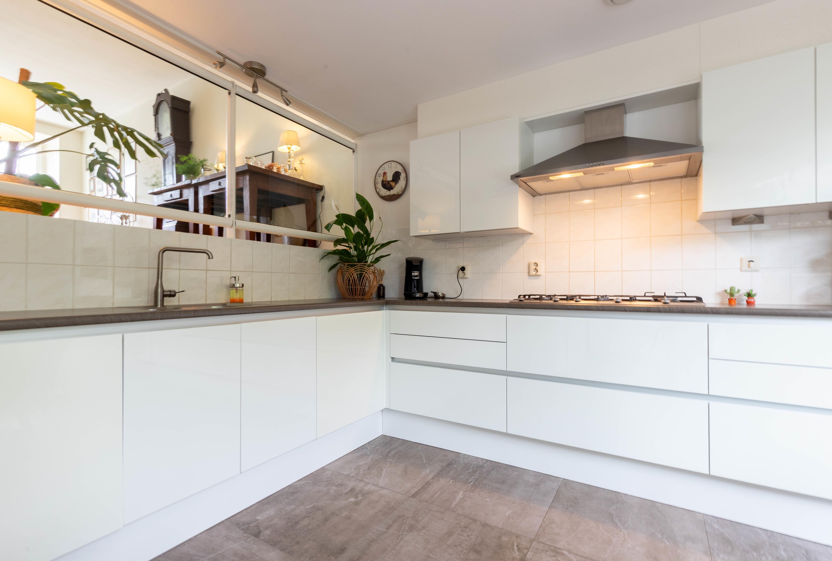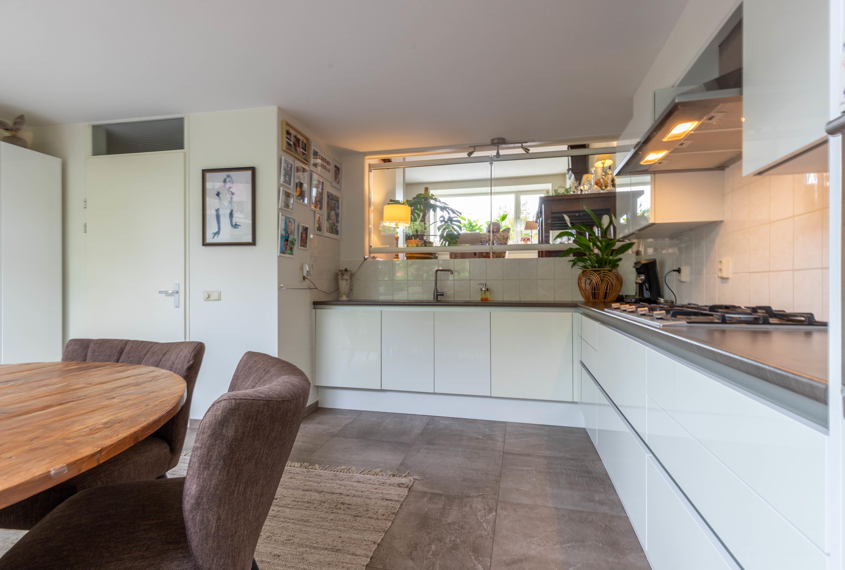 Eerste verdieping De eerste verdieping is opgesplitst in twee levels, de keuken en de woonkamer. Hier is genoeg ruimte voor een grote eettafel dus een echte woonkeuken. De keuken is uitgerust met onder meer een 5 pits gastoestel, vaatwasser, combi oven/magnetron, 10 liter boiler en een koel-/vriescombinatie. Er is toegang tot het rustig gelegen terras aan de achterzijde. Door de split level indeling is er aan de raamkant een vide naar de bovenliggend kamer. Aan de andere zijde is er een doorkijkje naar de woonkamer. De L-vormige woonkamer is ruim en licht en geeft op zijn beurt ook weer een doorkijk naar de hoger gelegen werkkamer boven de keuken. De keuken heeft een plavuizen vloer, de woonkamer een houten vloer in visgraat patroon gelegd.