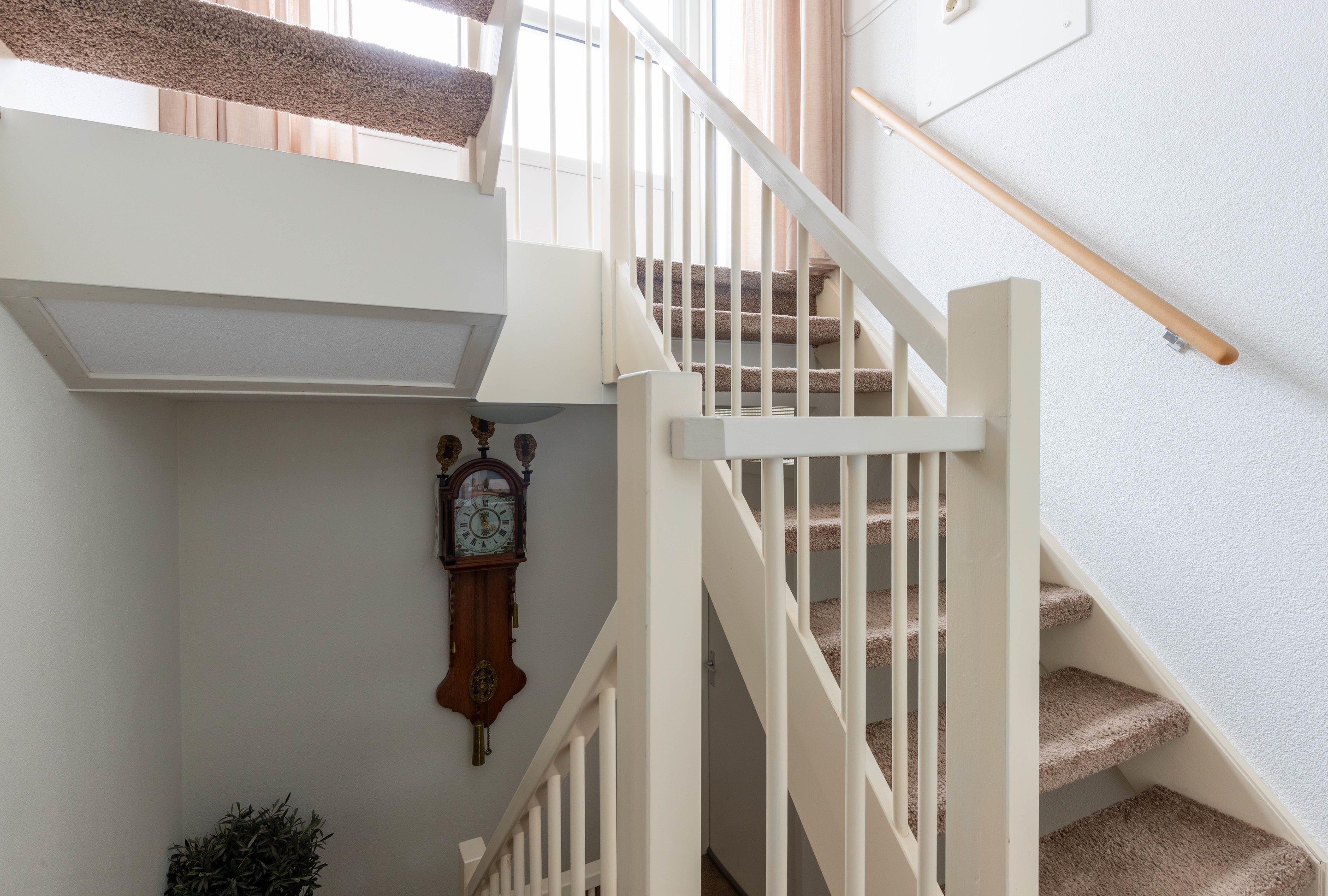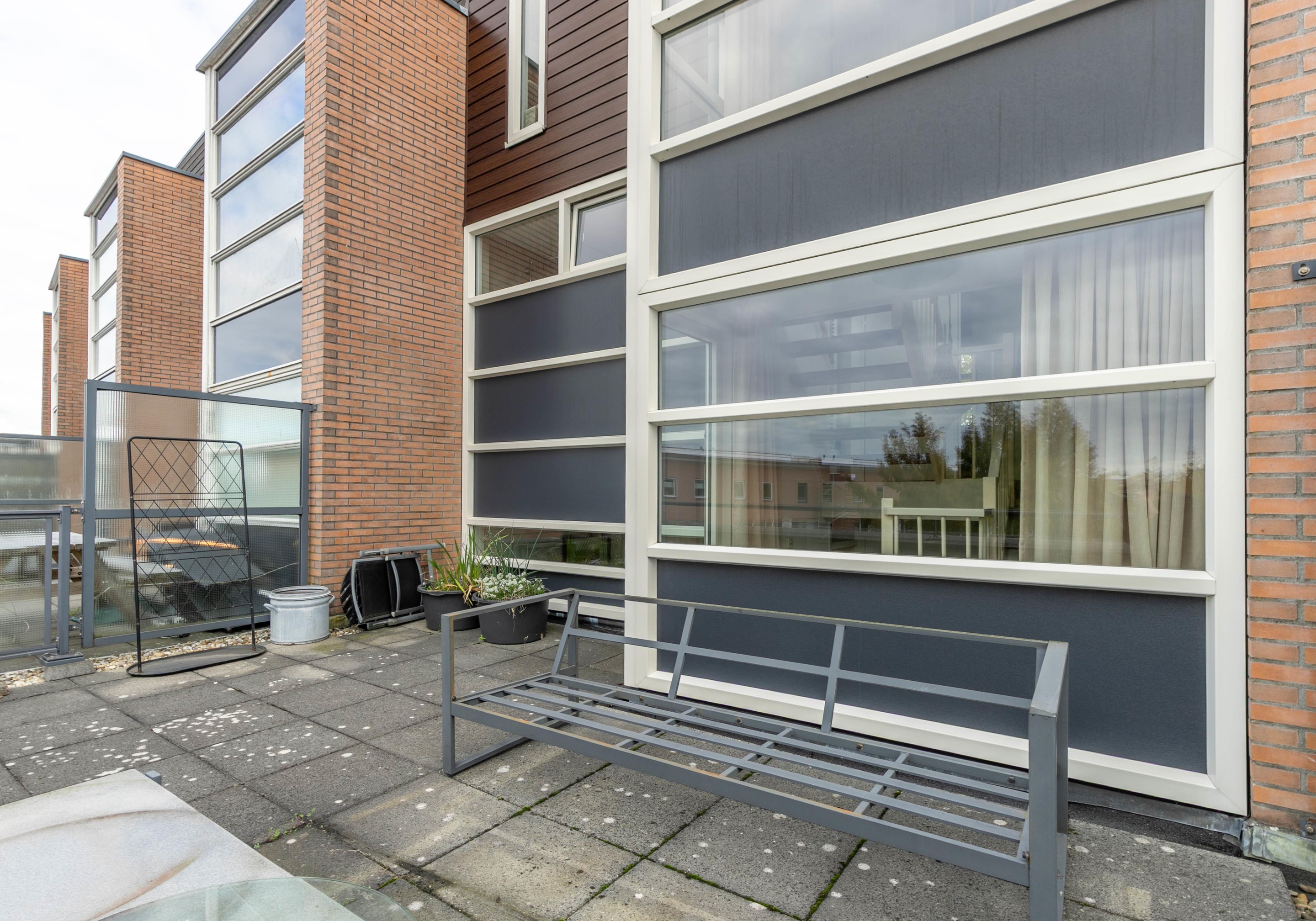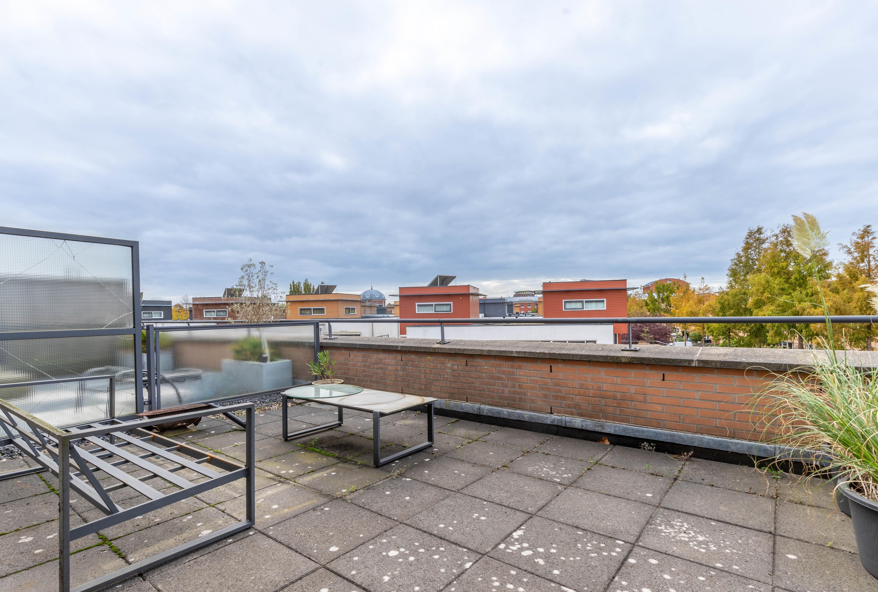 Via het trappenhuis komt u op de volgende laag, het dakterras aan de voorzijde van de woning. Deze ligt op het westen en dus heerlijk op de zon.