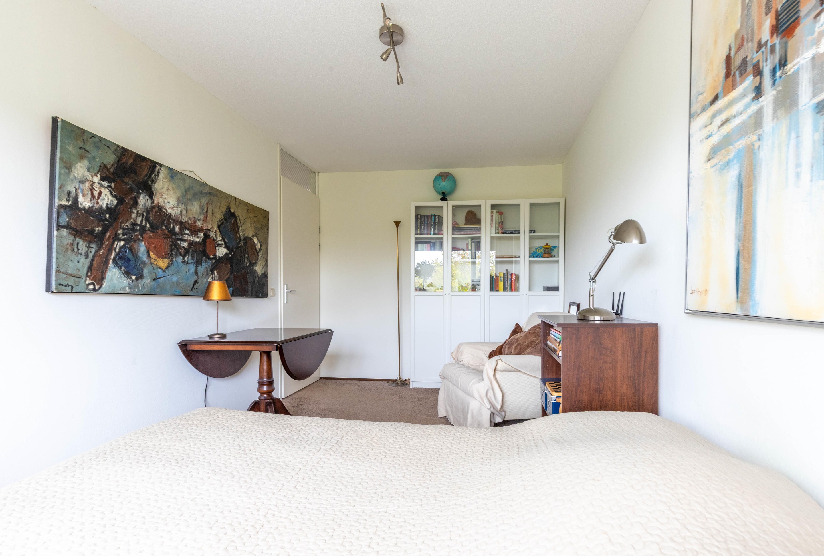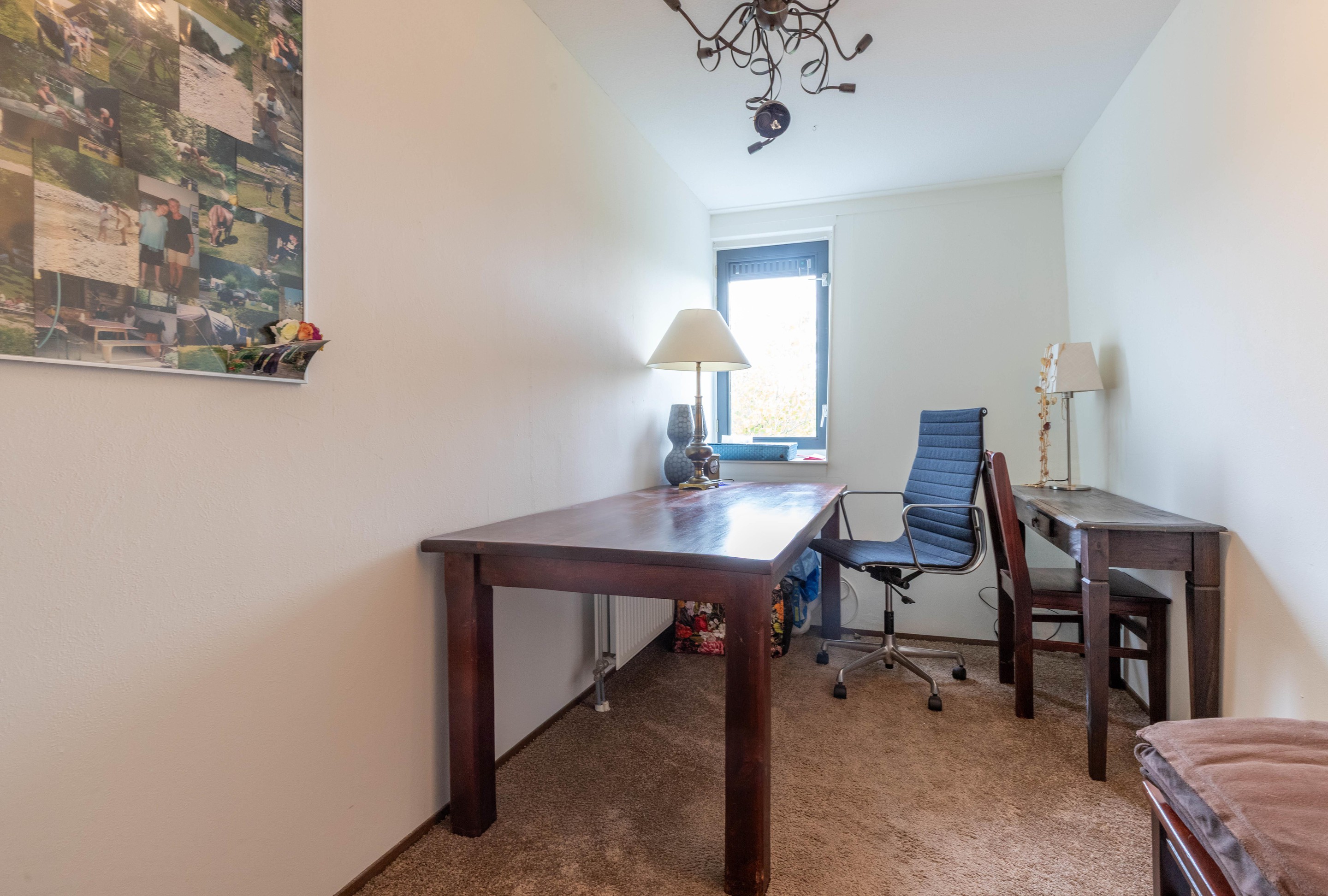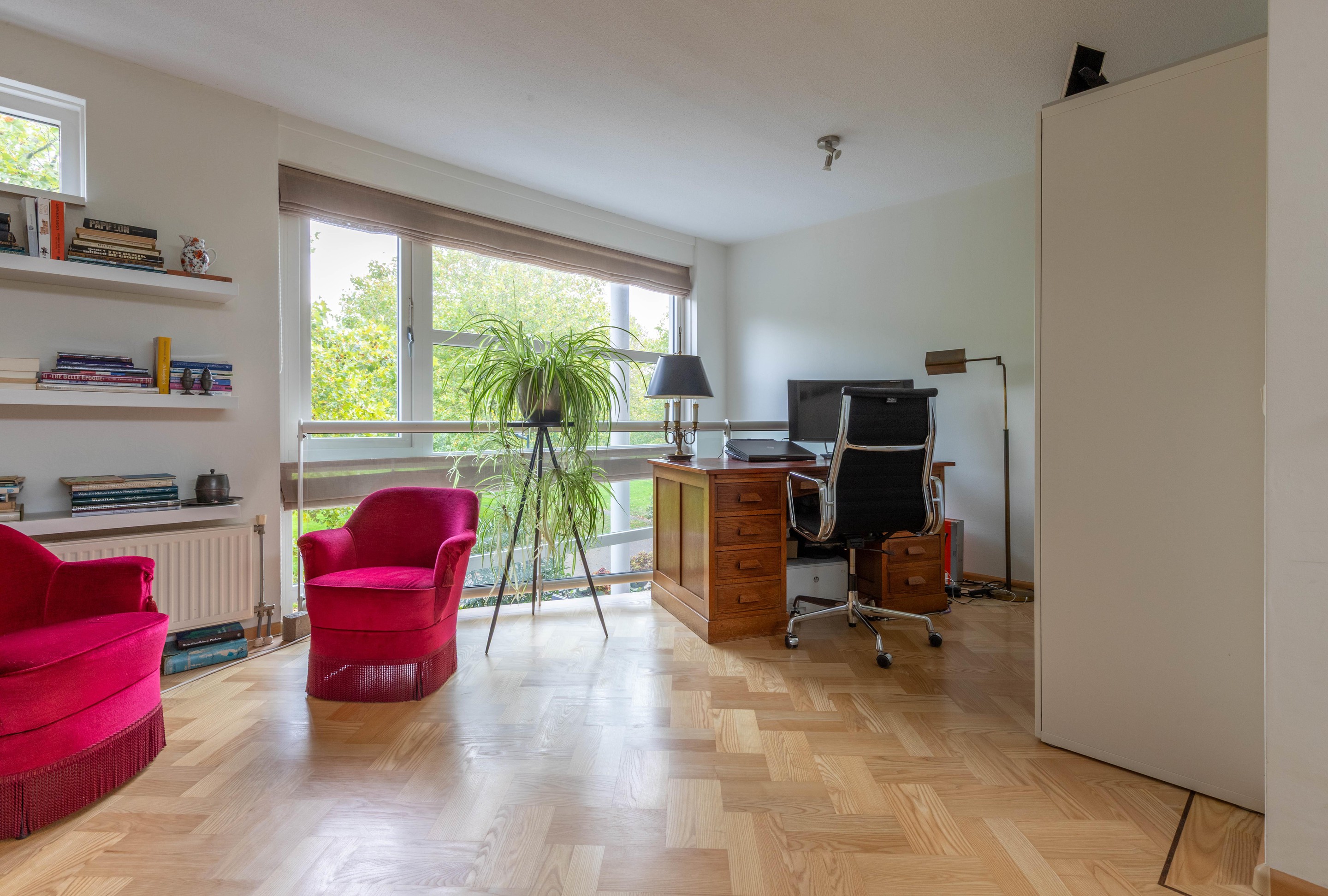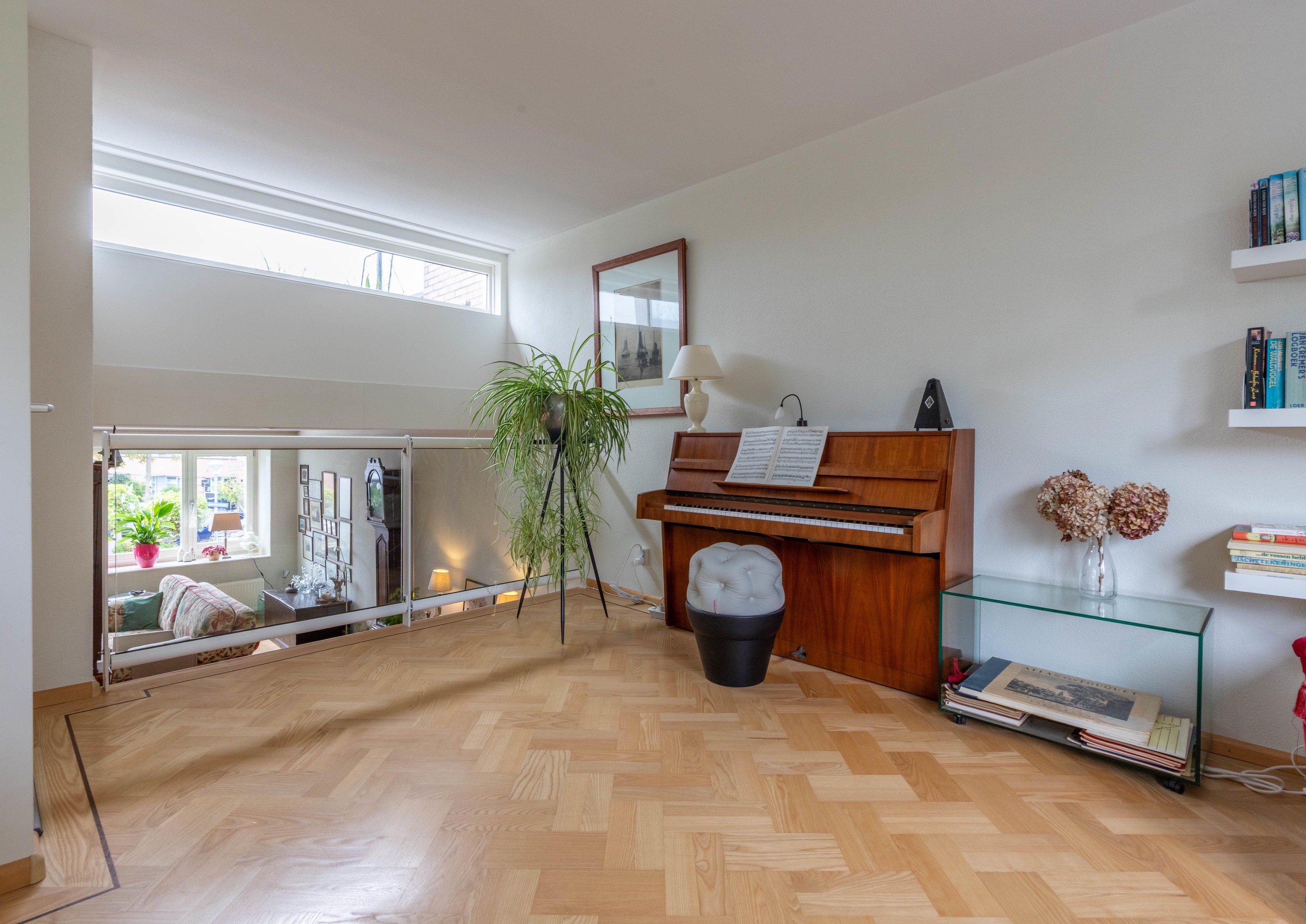 Tweede verdieping De videkamer schuin boven de woonkamer is een praktische ruimte. Inzetbaar als televisiekamer, werkkamer of eventueel te verbouwen naar slaapkamer. De kamer heeft aan de achterzijde connectie met de ondergelegen keuken. Vanuit deze kamer heeft u mooi uitzicht over park achter de woning. Ook deze kamer heeft een houten vloer in visgraat motief. De op de foto's aanwezige piano is overigens ter overname.