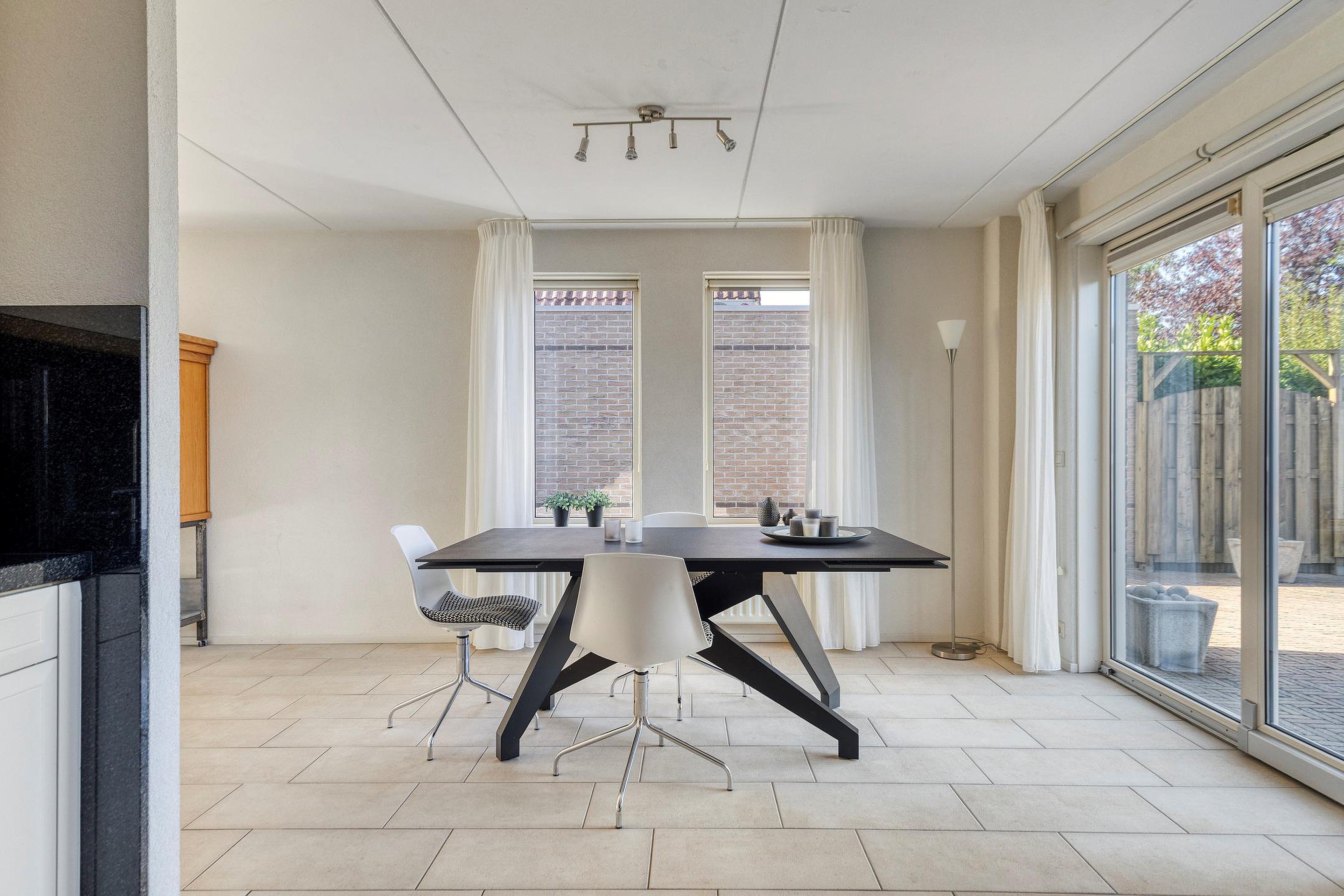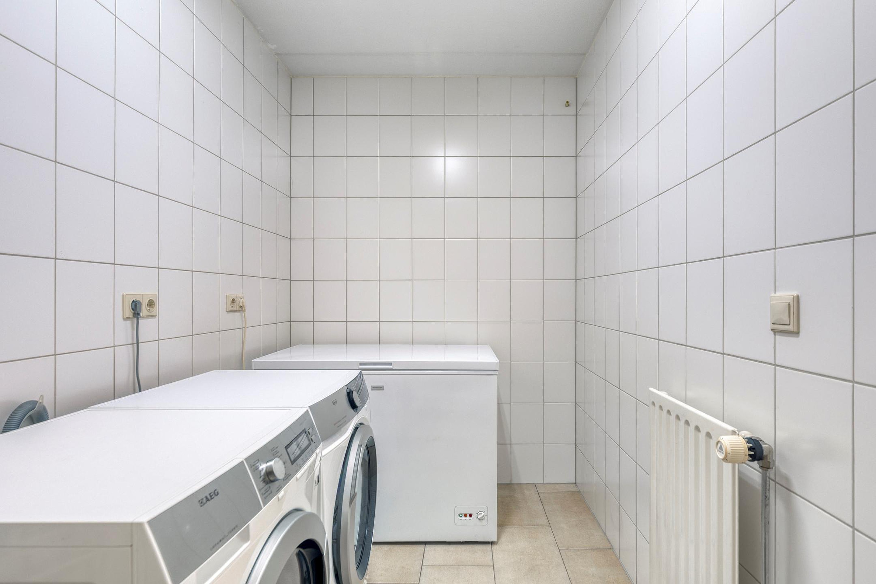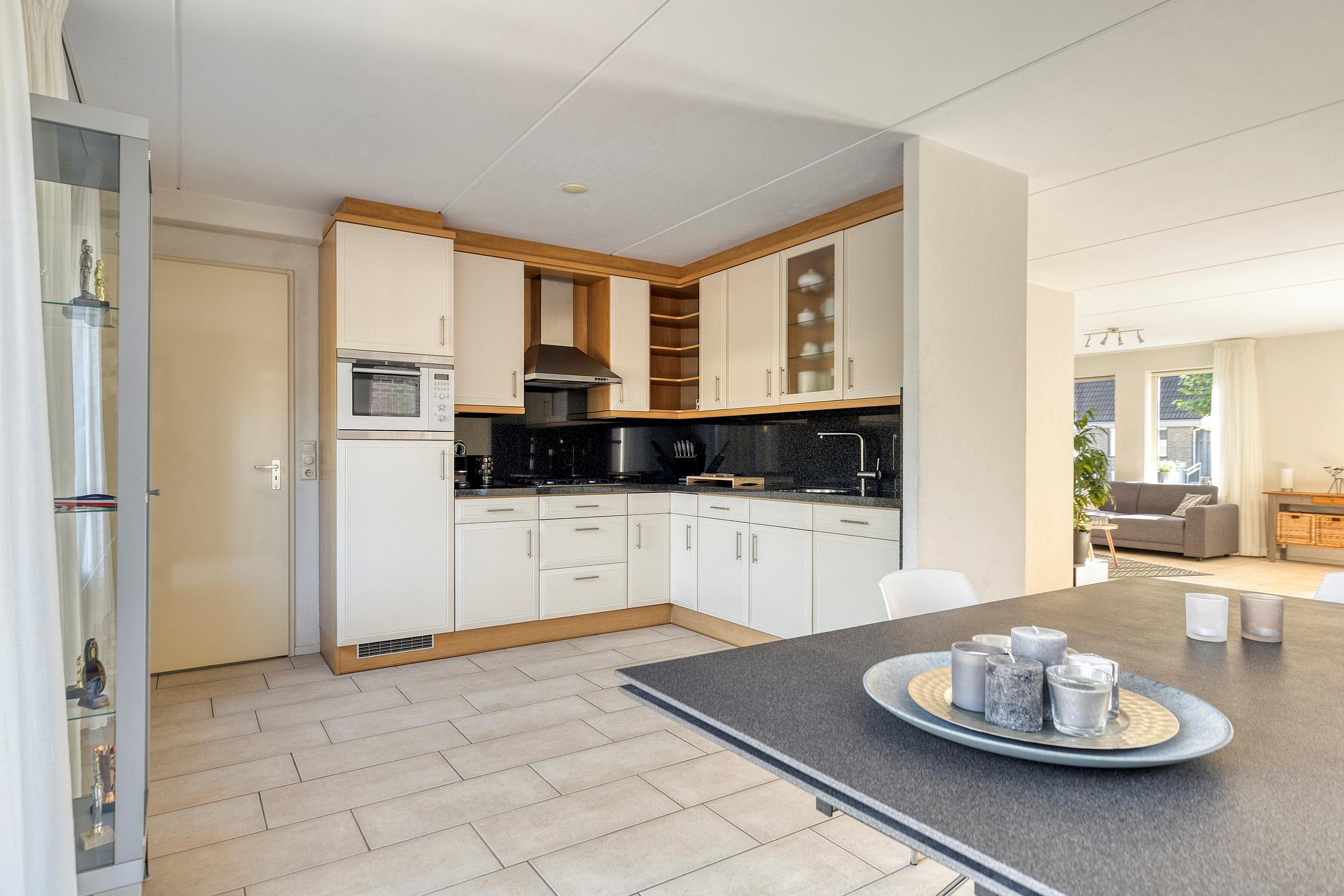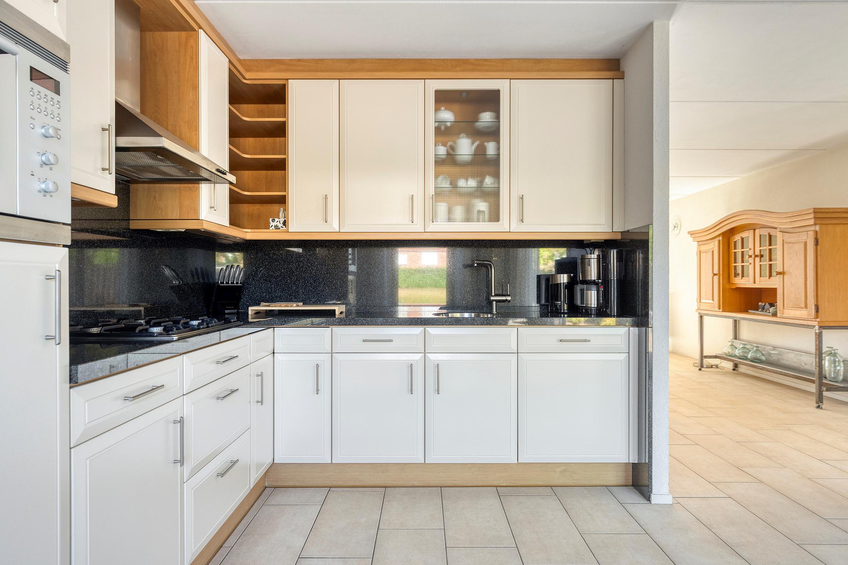De halfopen keuken in hoekopstelling is voorzien van diverse inbouwapparatuur en een granieten werkblad. Direct naast de keuken bevindt zich een praktische bijkeuken/berging met aansluiting voor witgoed en doorgang naar de royale garage.
