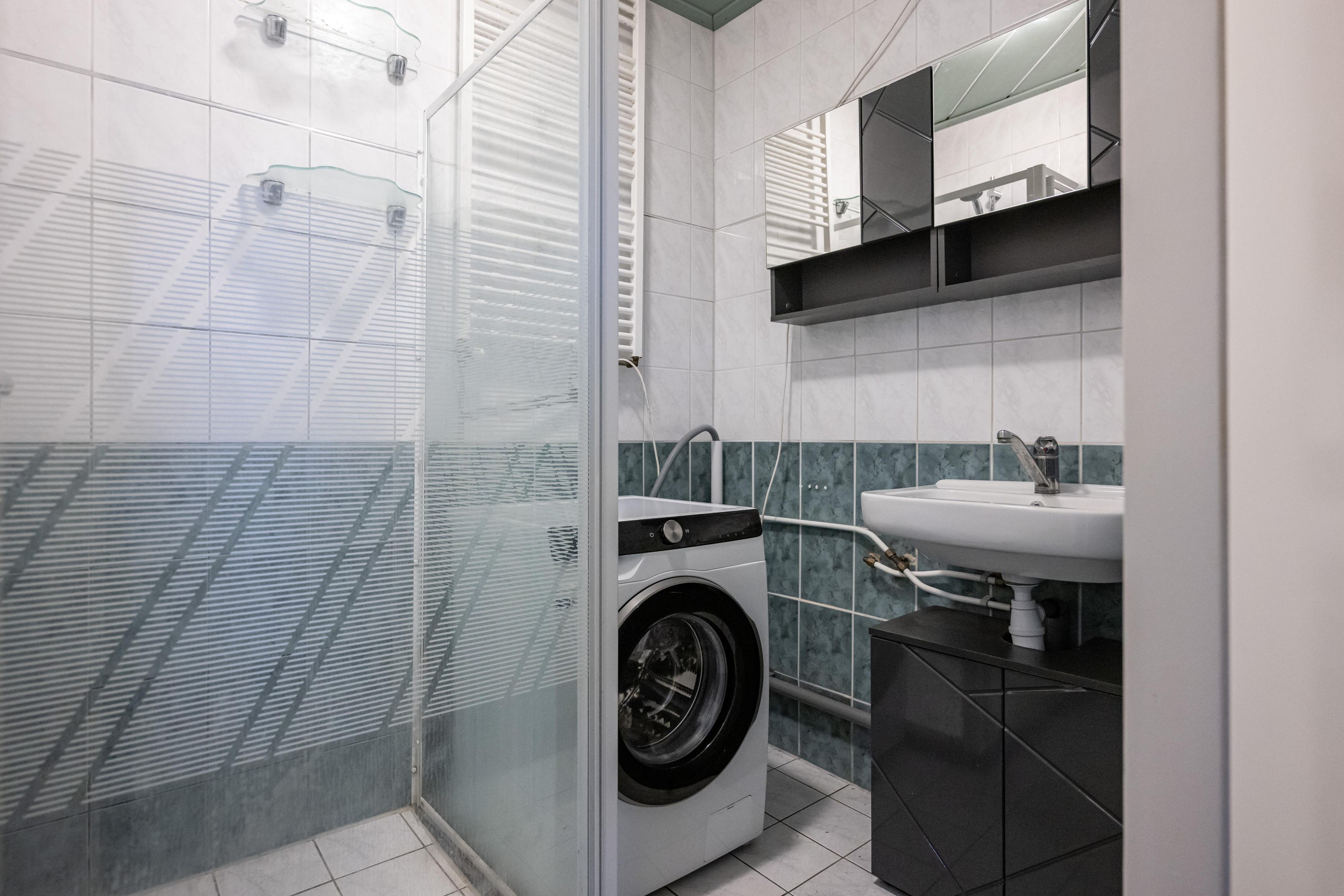 Plavuizen vloer, douche cabine, handdoekenradiator, wastafel met onderkast, elektrische afzuiging en geheel betegeld.