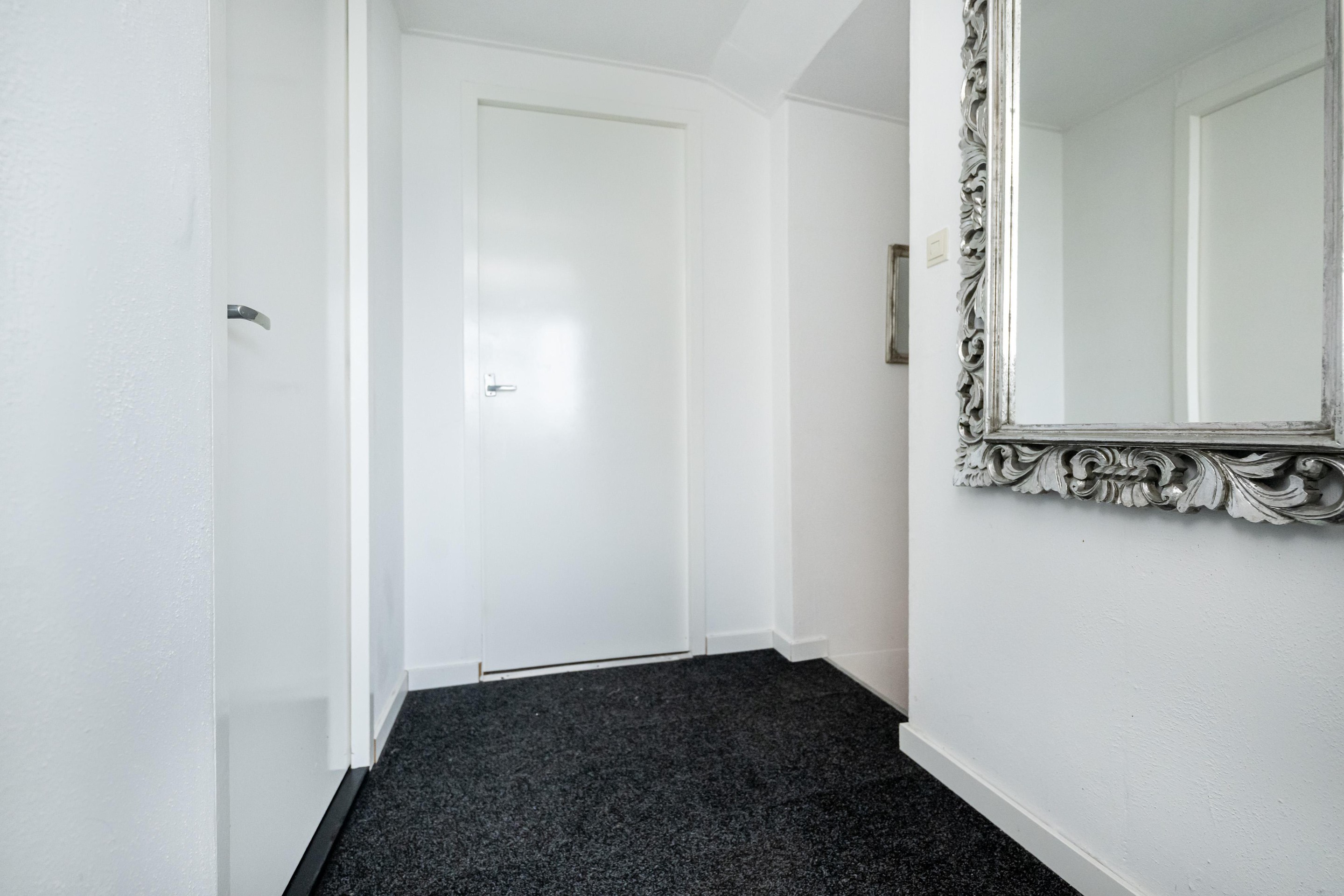 Laminaat vloer, radiator, meterkast, trapopgang naar 1e verdieping en trapafgang naar beneden gelegen keuken en sanitair.