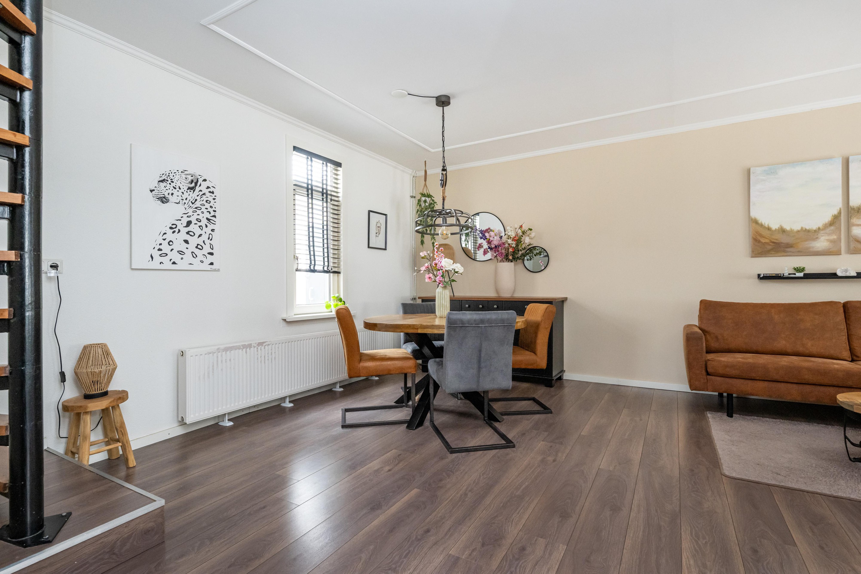 Laminaatvloer, radiatoren, kunststof kozijn en trapopgang.