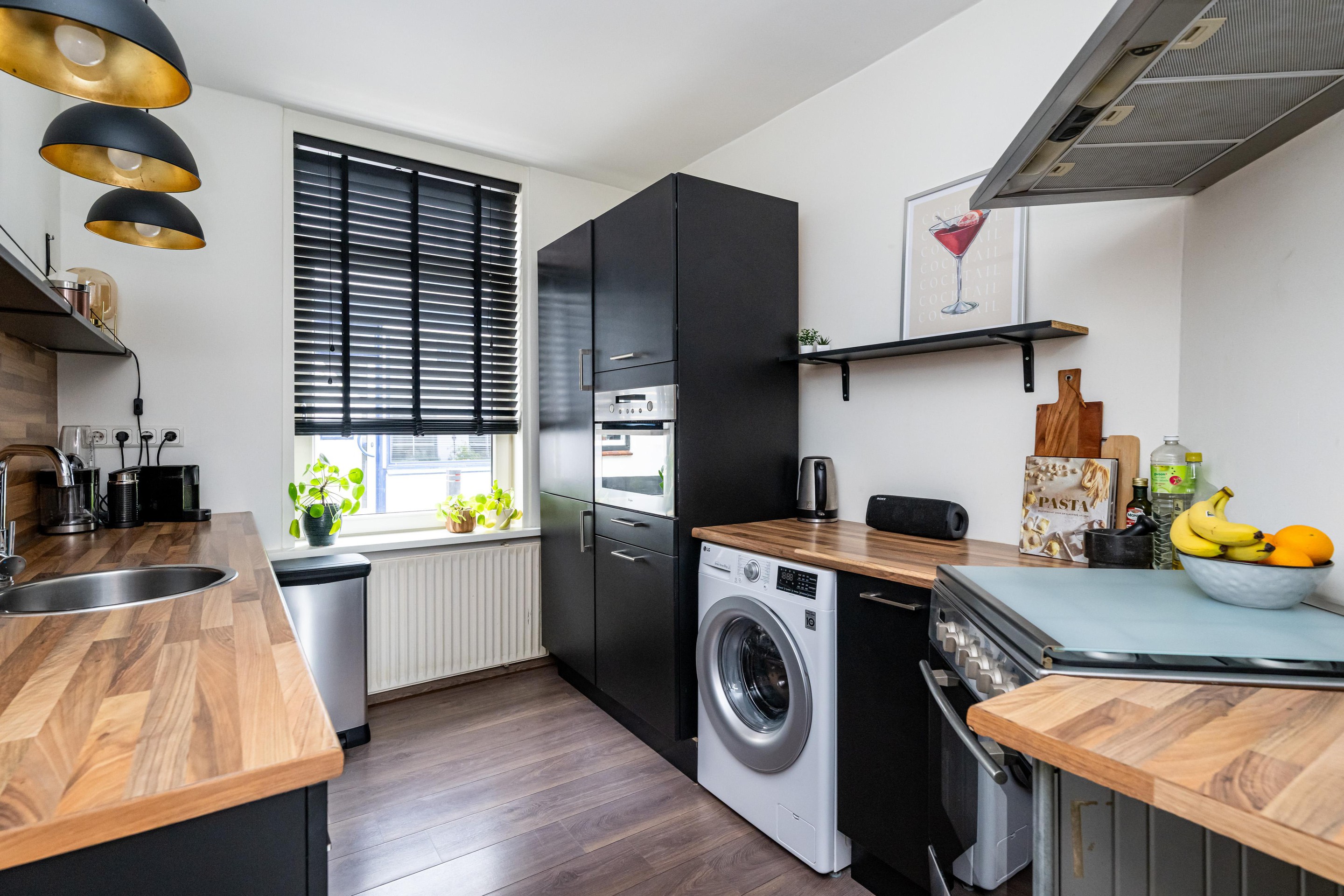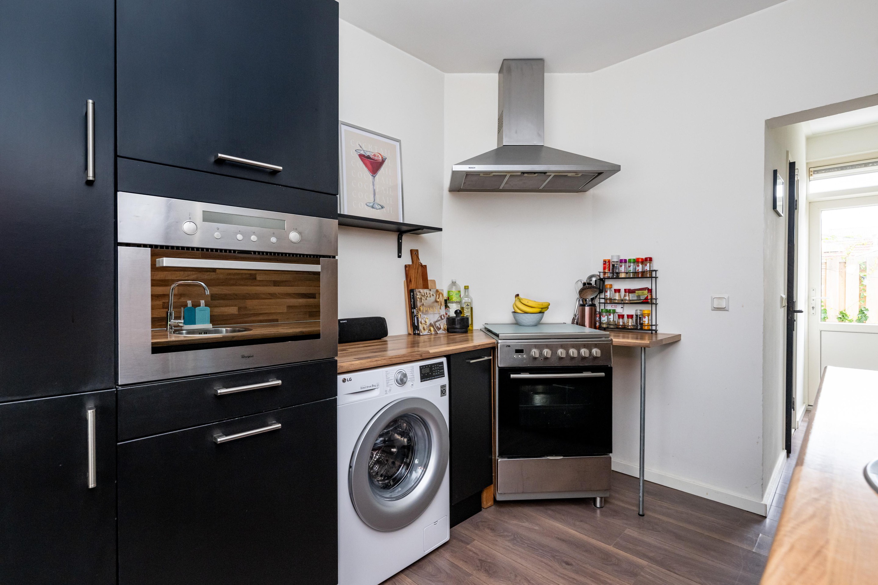 Laminaatvloer, enkele spoelbak, 4-pits gasfornuis, afzuigkap, combi-oven, koelkast, vriezer , kunststof kozijn en een radiator.