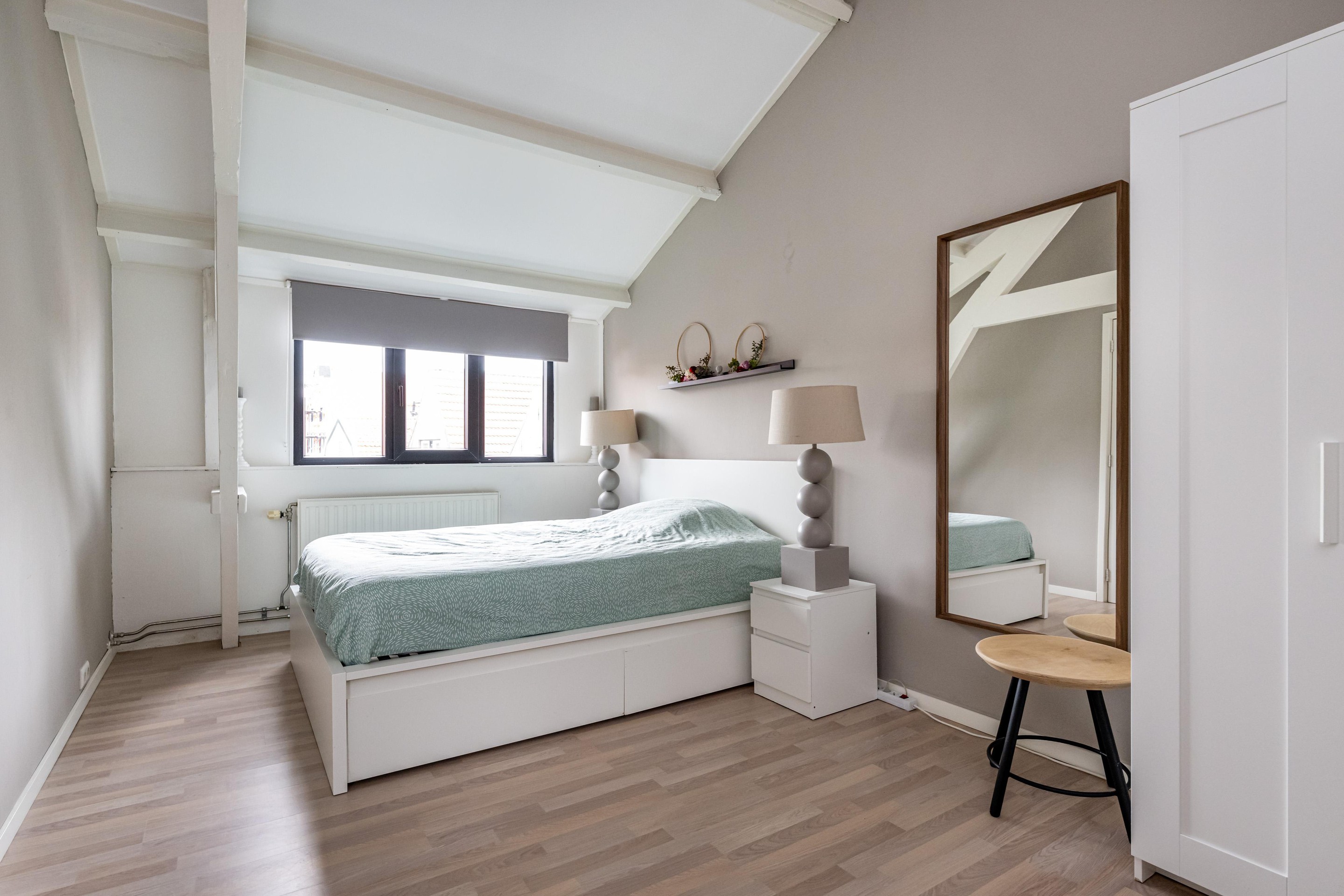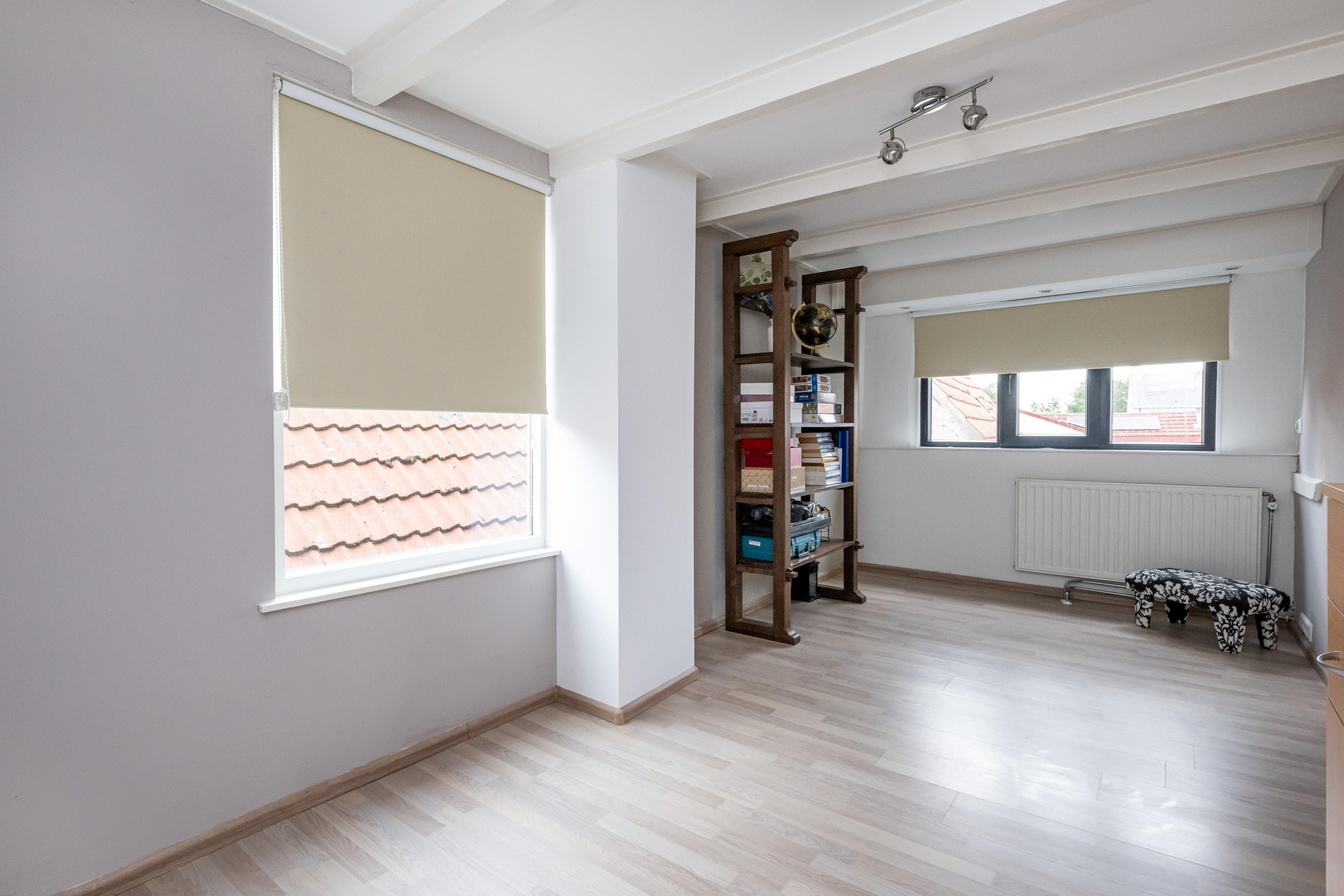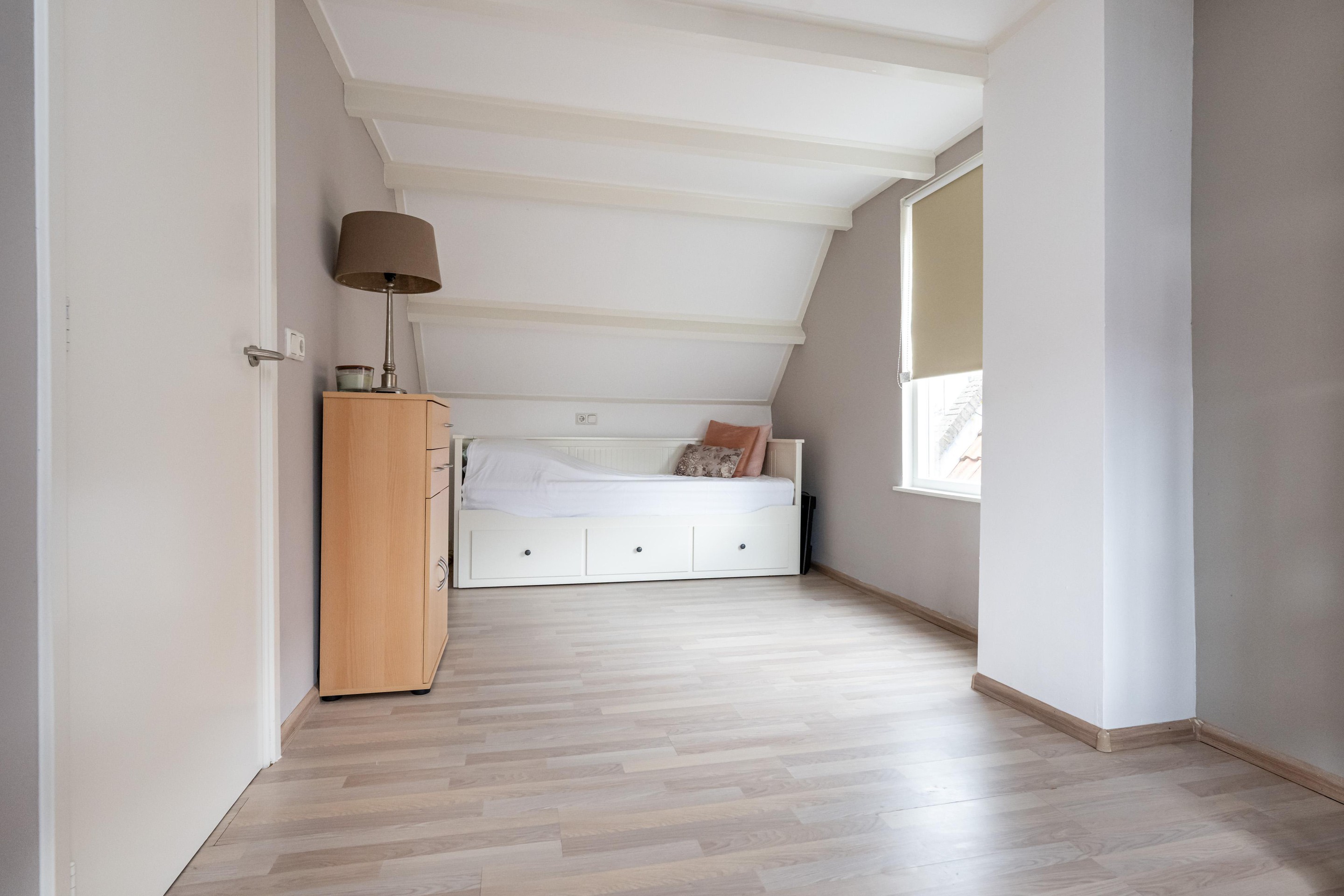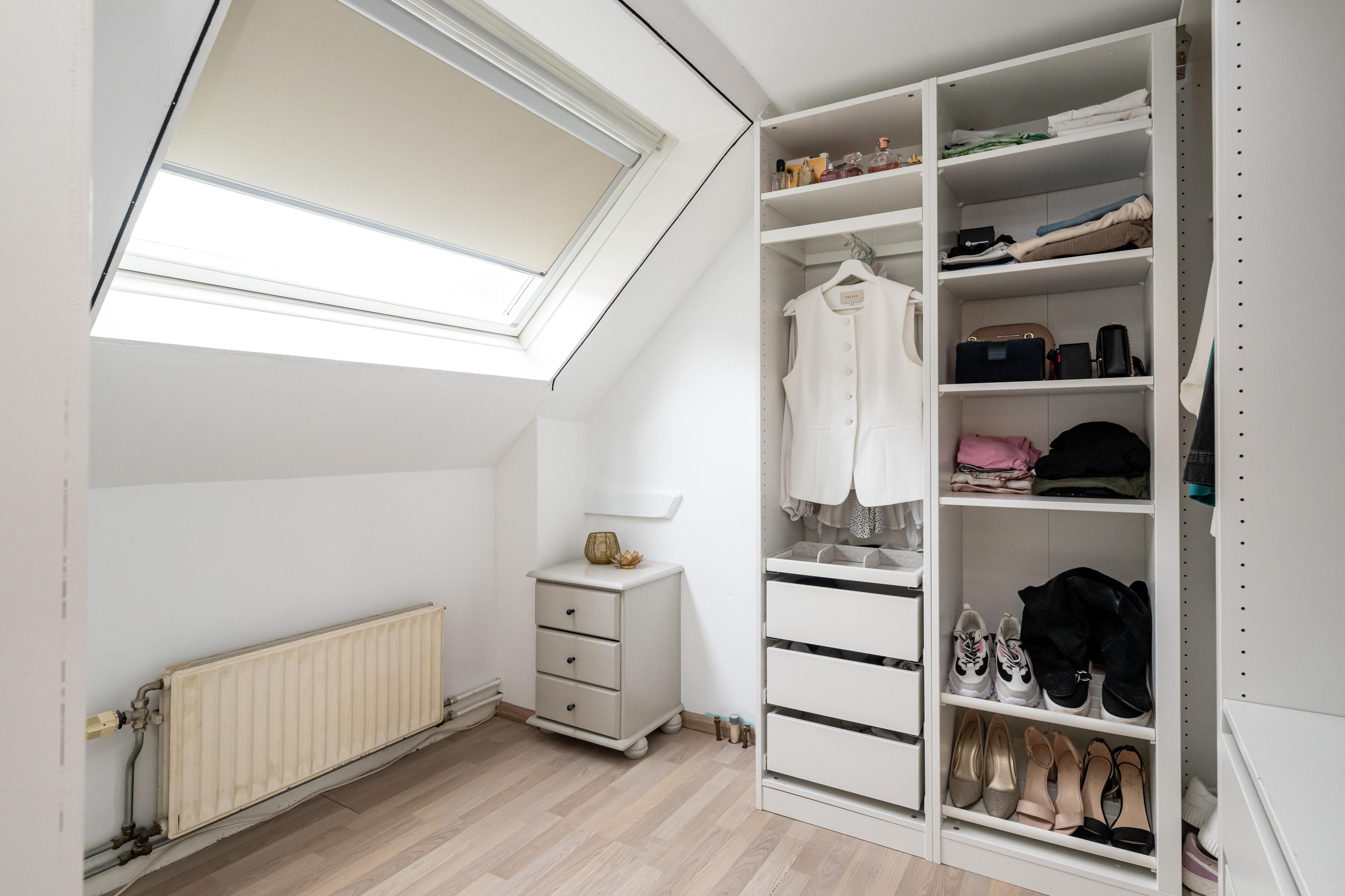 Laminaatvloer, Velux dakvenster en een radiator.