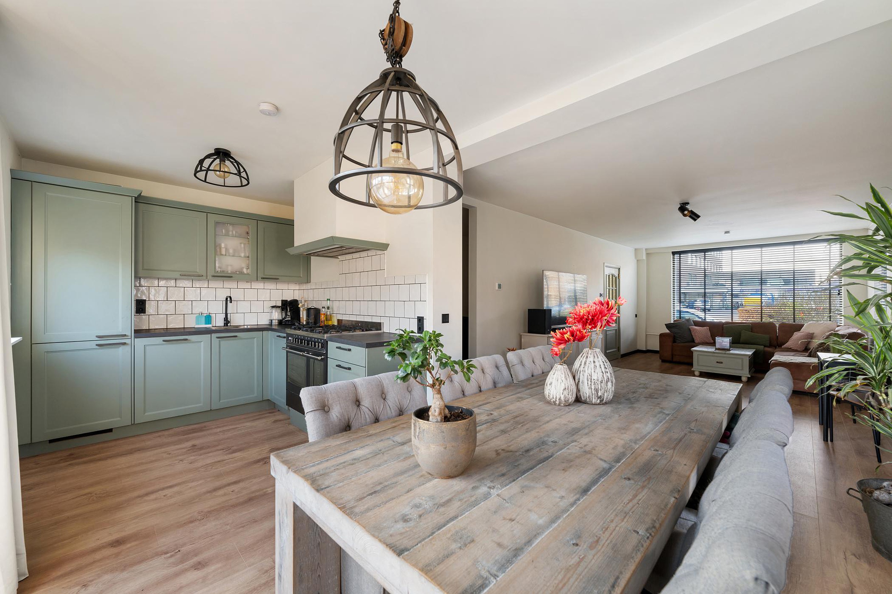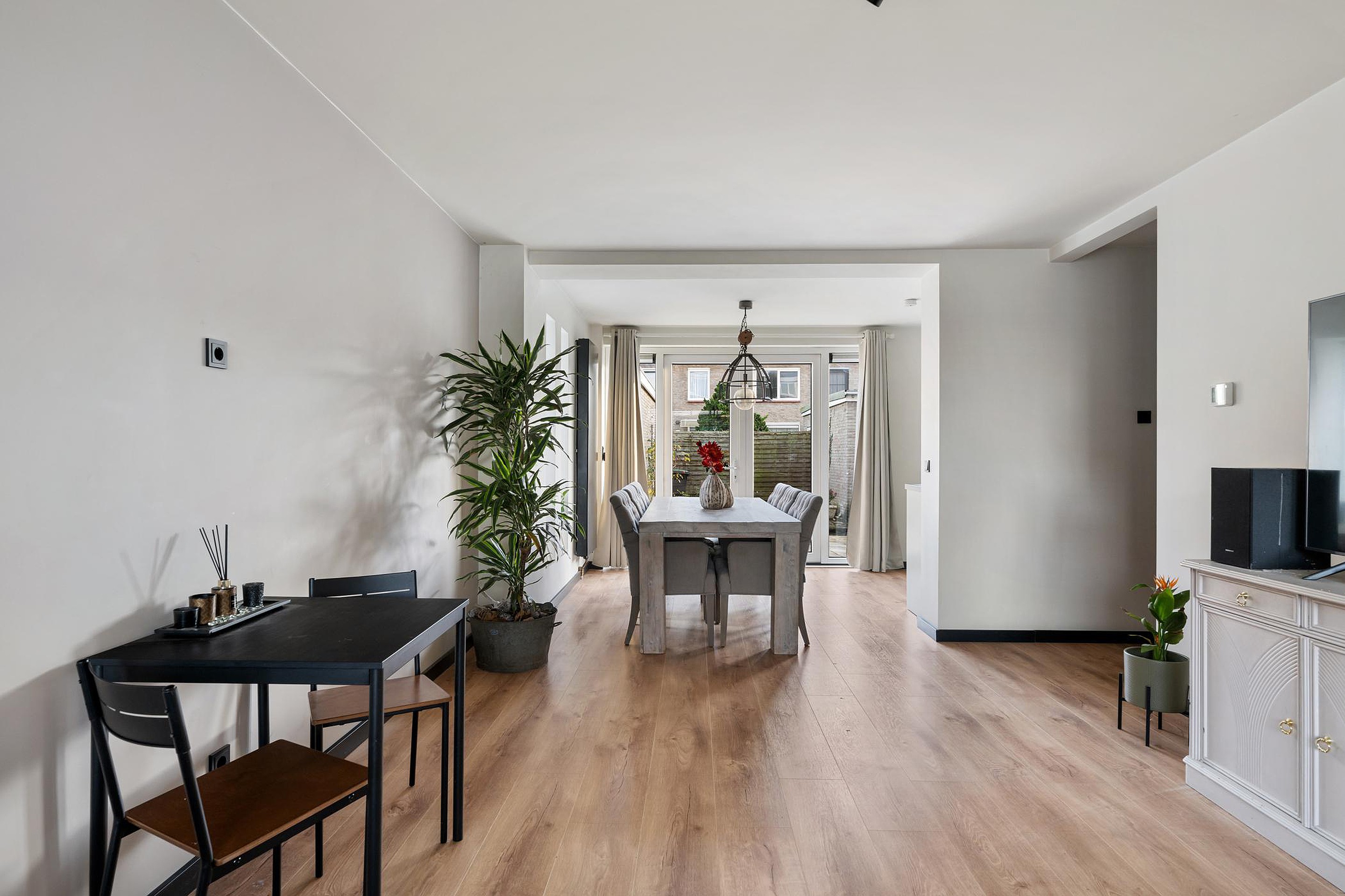Door de uitbouw heeft de woonkamer een lengte van meer dan 10 meter! Onderverdeeld in een zitgedeelte aan de straatzijde en eetgedeelte aan de achterzijde. Openslaande deuren naar terras en tuin. Leuk detail zijn de zijramen.