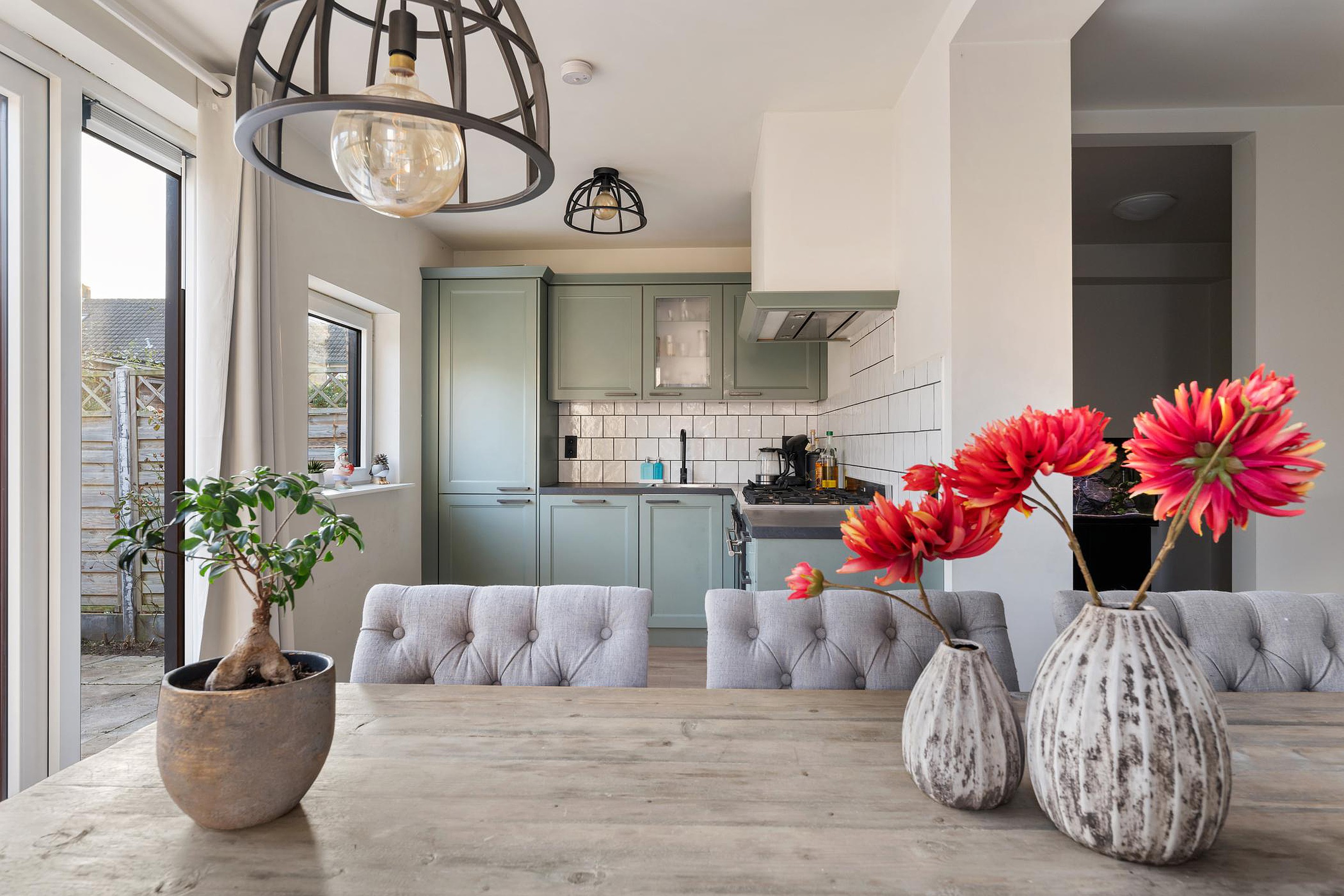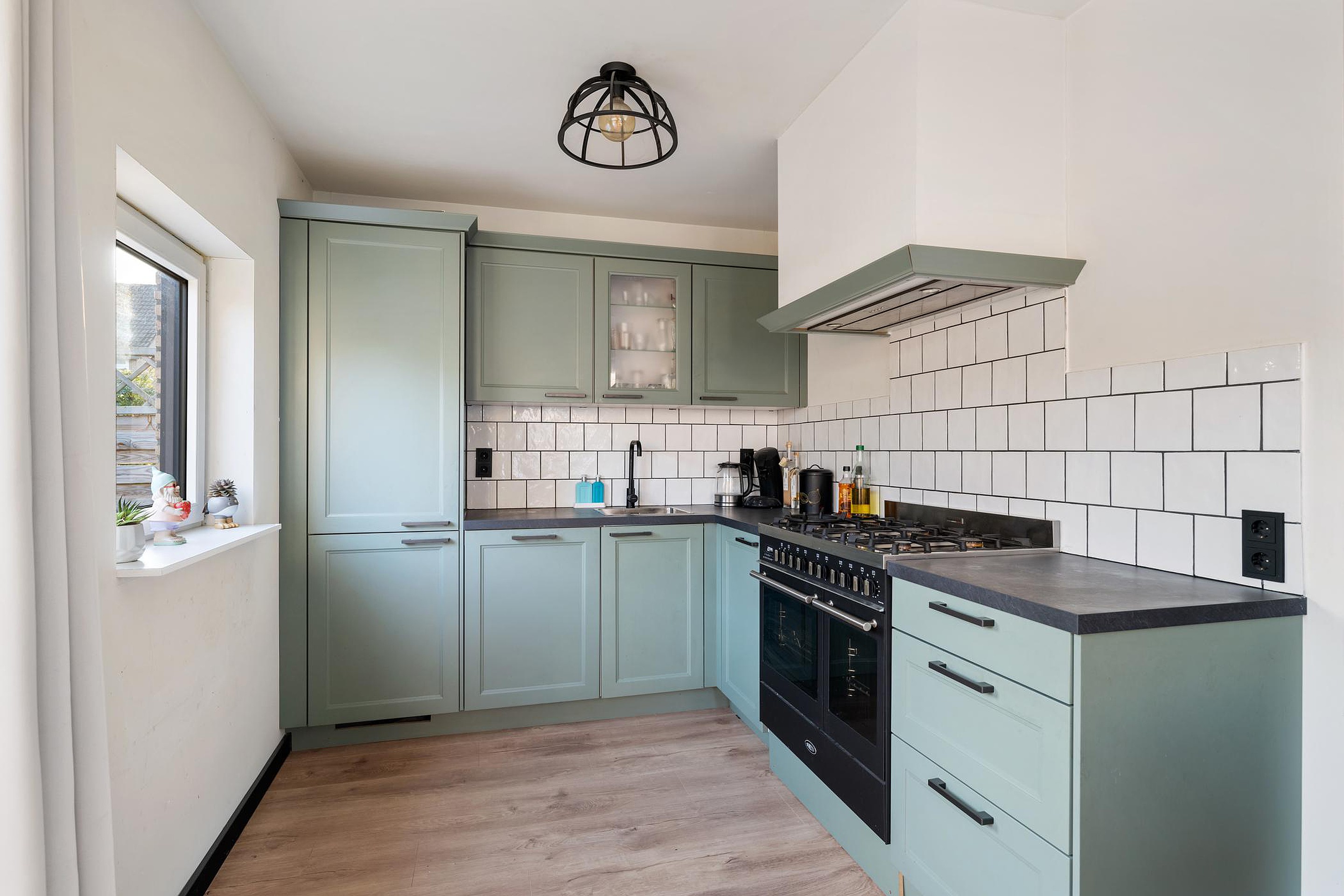 De keuken is in de uitbouw gerealiseerd. Het mooie Boretti fornuis met dubbele oven nodigt uit om lekker te gaan koken. De hoekopstelling uit 2023 is verder voorzien van koel/vrieskast, vaatwasser en afzuigsysteem.