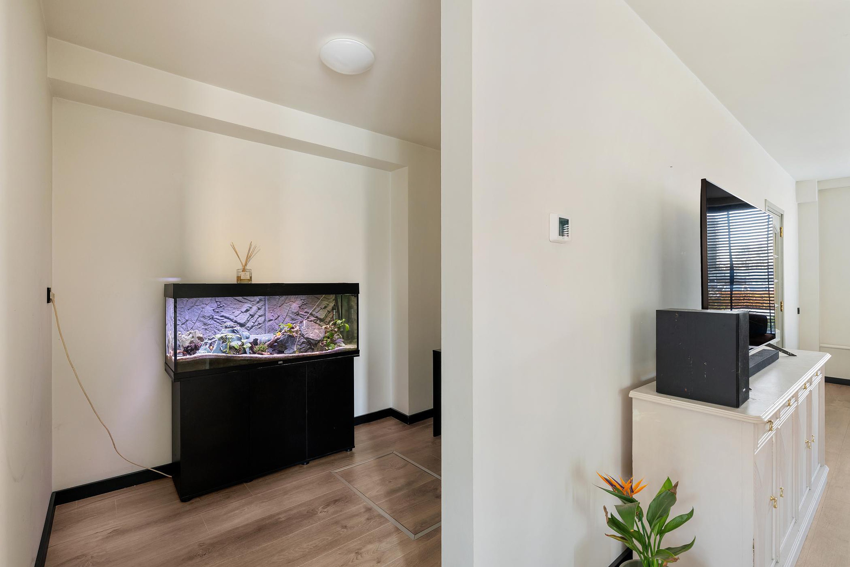 Op de plaats van de voormalige keuken is een hoekje gecreëerd wat heel goed gebruikt kan worden als werkplek of als speelruimte voor de kinderen. Bekijk de plattegrond voor de indeling.