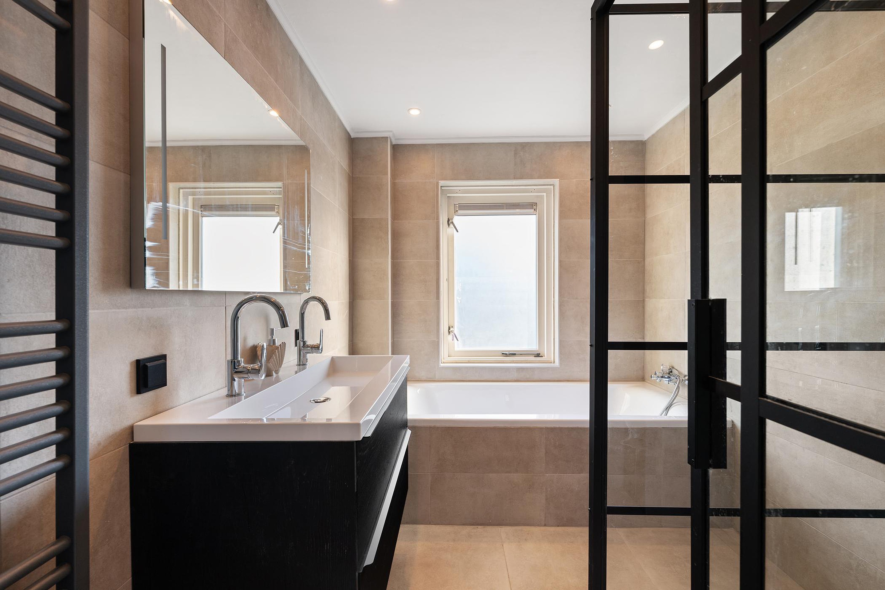 Met ligbad, trendy douchecabine en wastafelmeubel met 2 kranen.