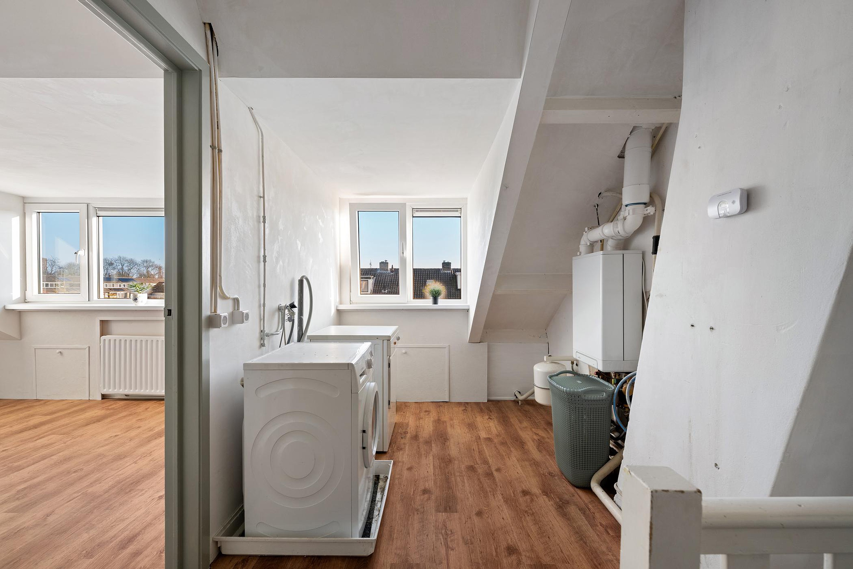 Tweede verdieping In 2025 is de 2e etage vergroot met een brede kunststof dakkapel. Hierdoor is een ruime voorzolder ontstaan met ruimte voor cv ketel en en aansluitingen voor wasmachine en wasdroger en een ruime slaapkamer.