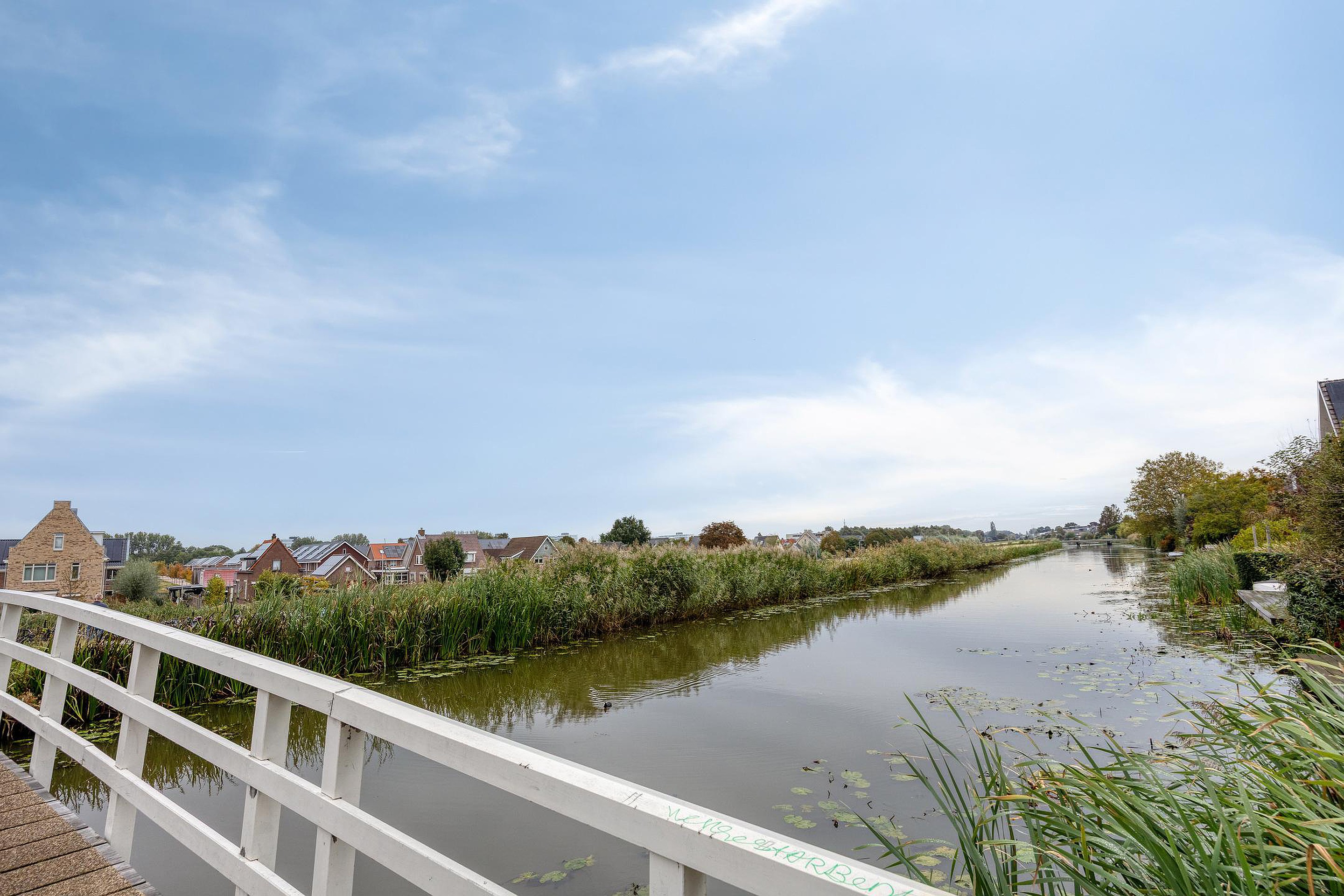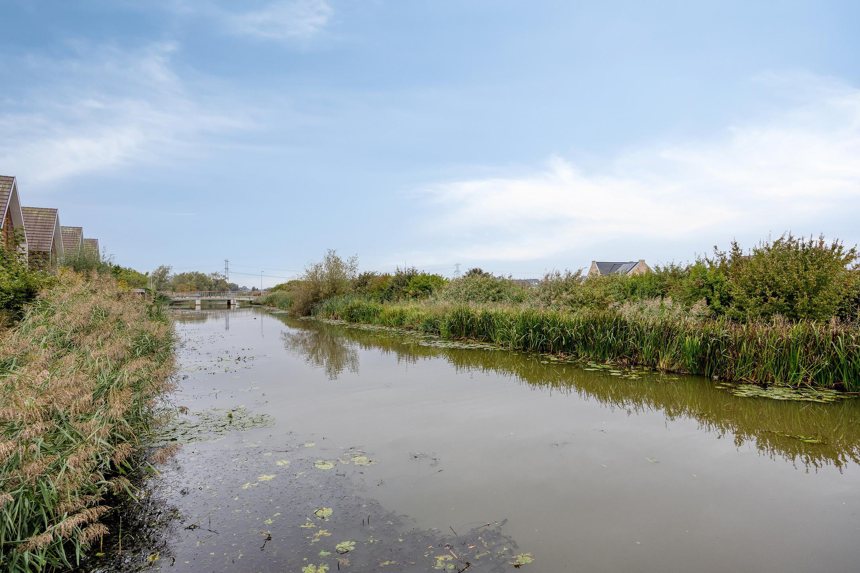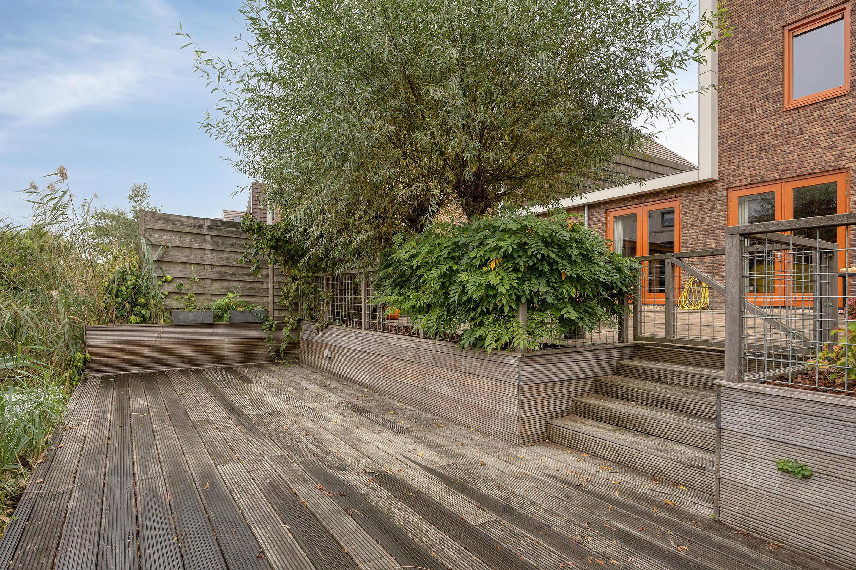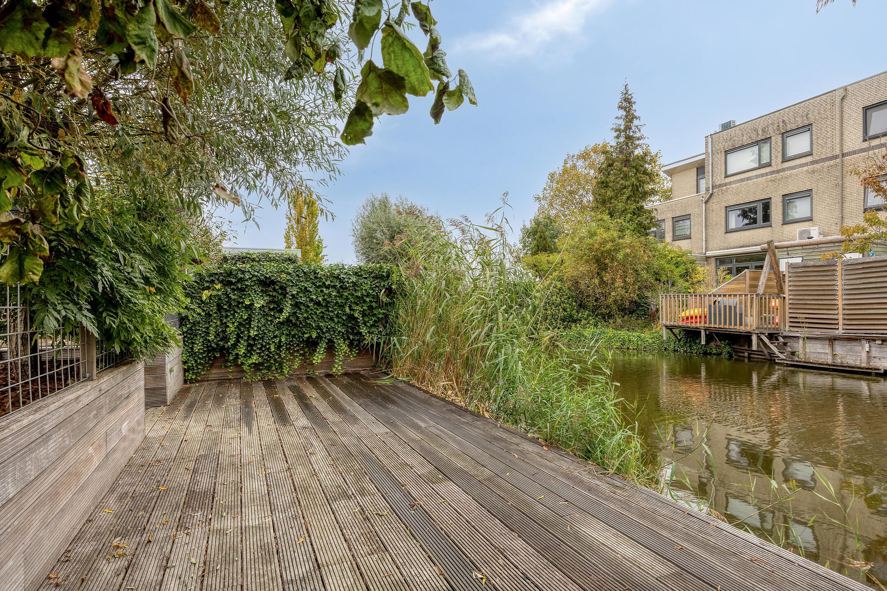 - Achtertuin (n-o) met houten vlonder grenzend aan een singel