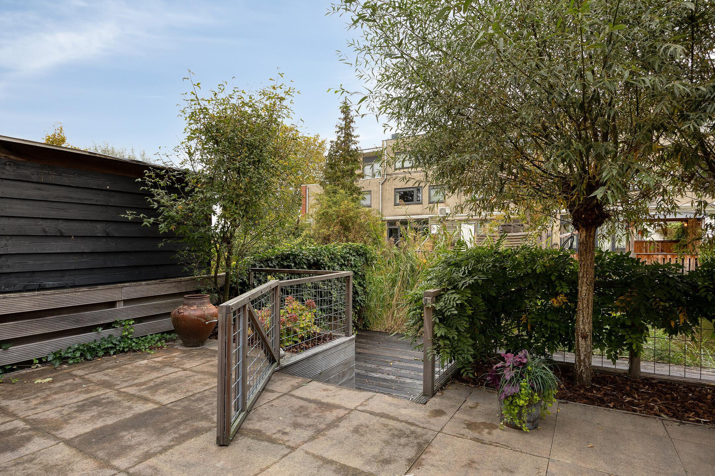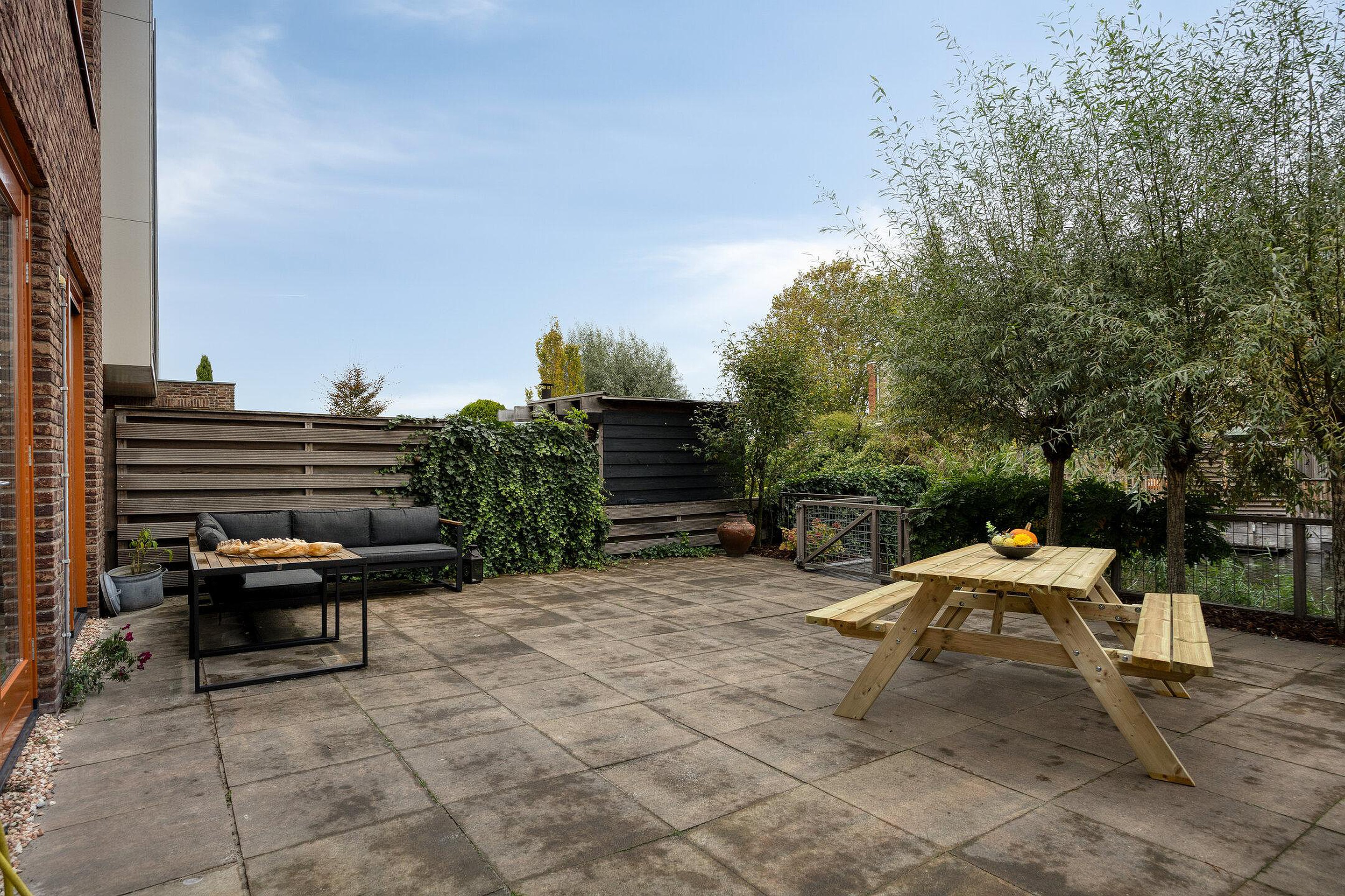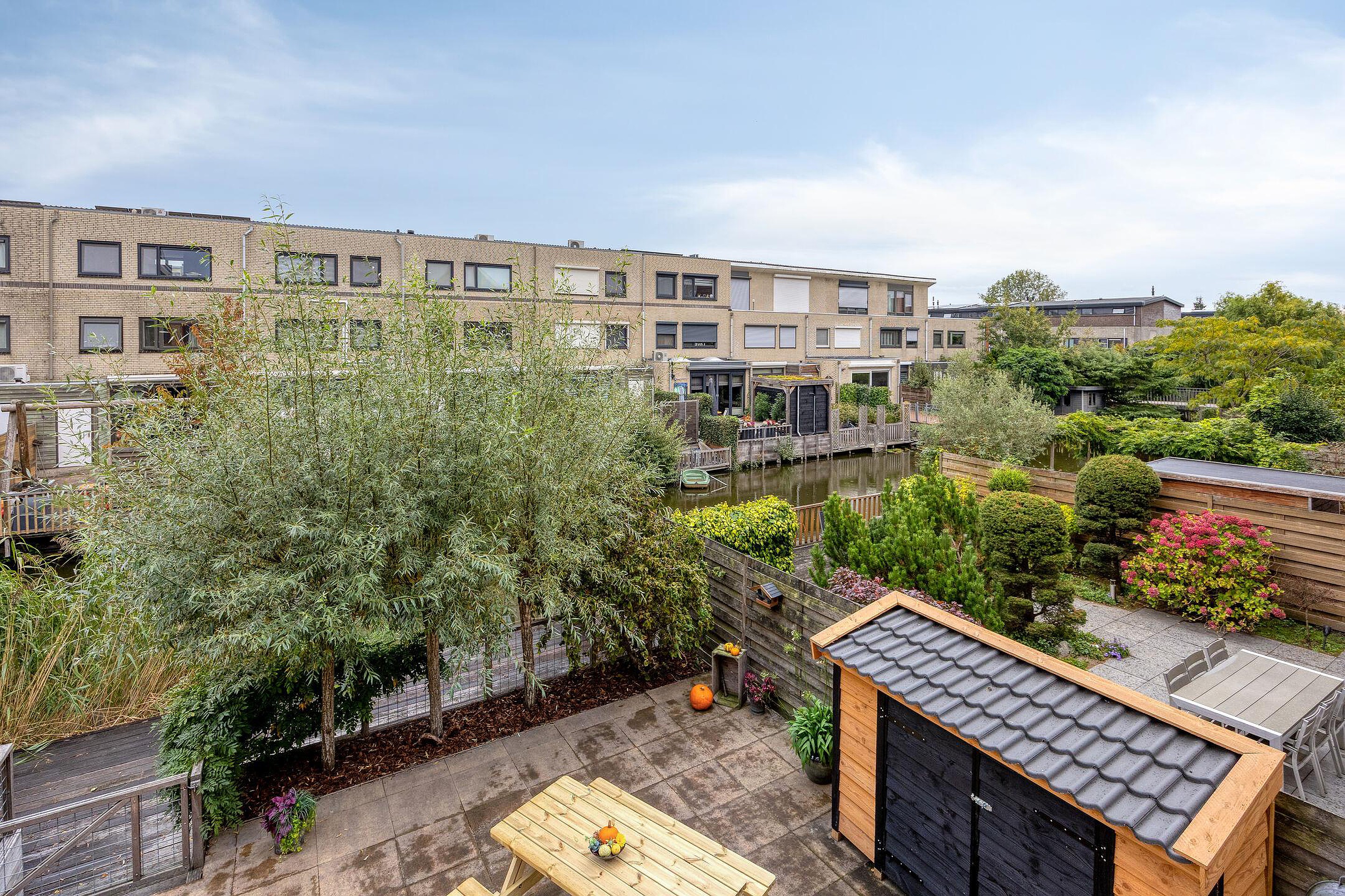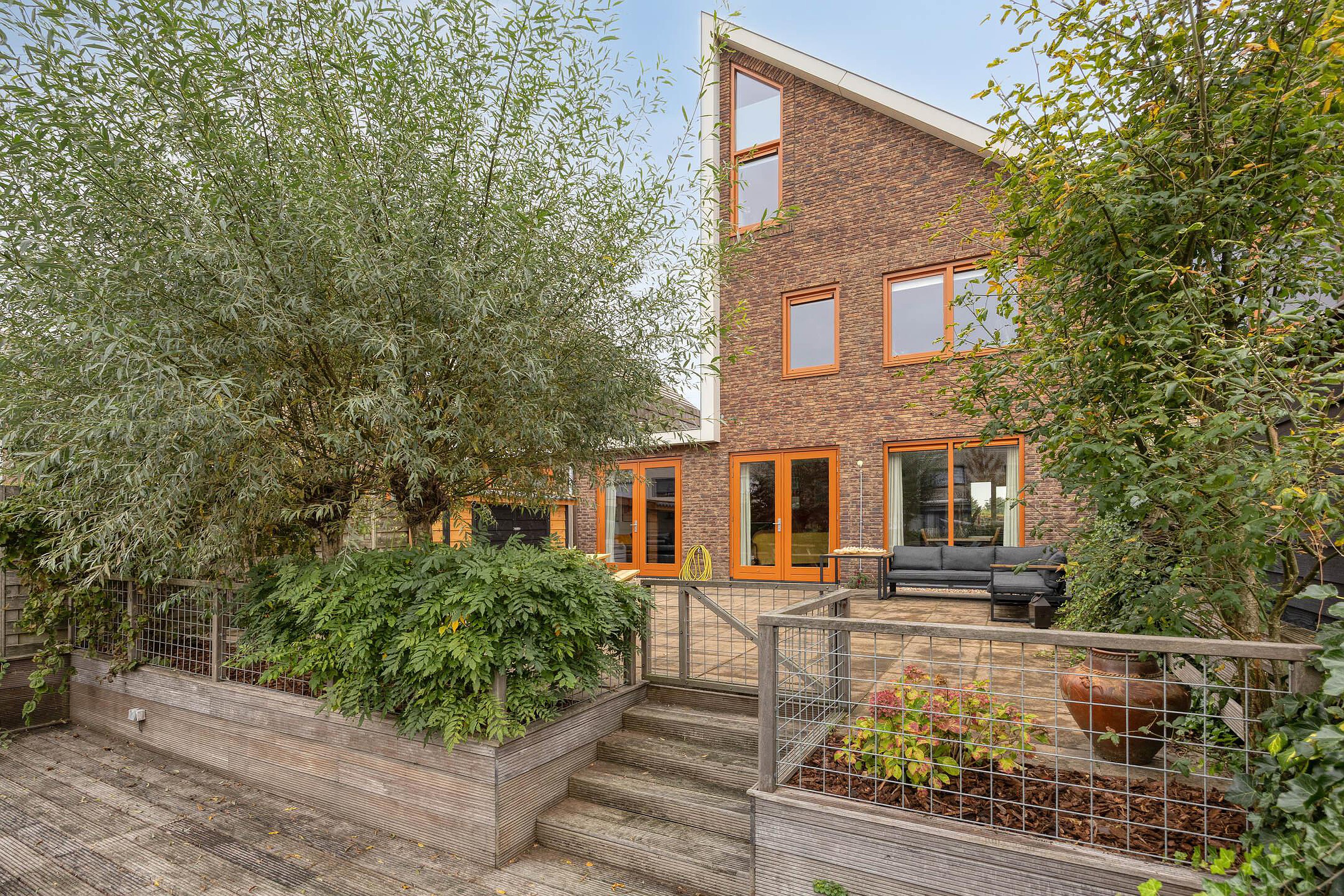 - Achtertuin (n-o) met houten vlonder grenzend aan een singel