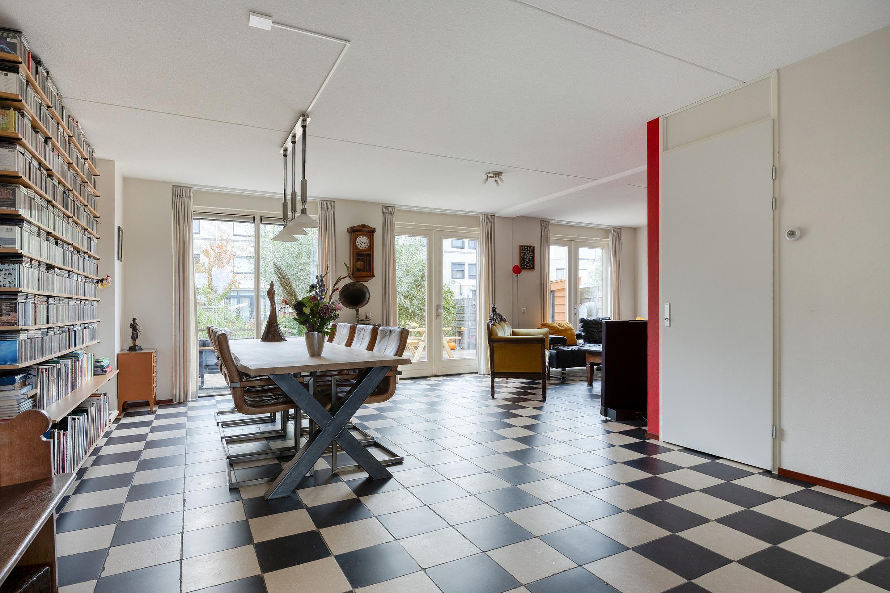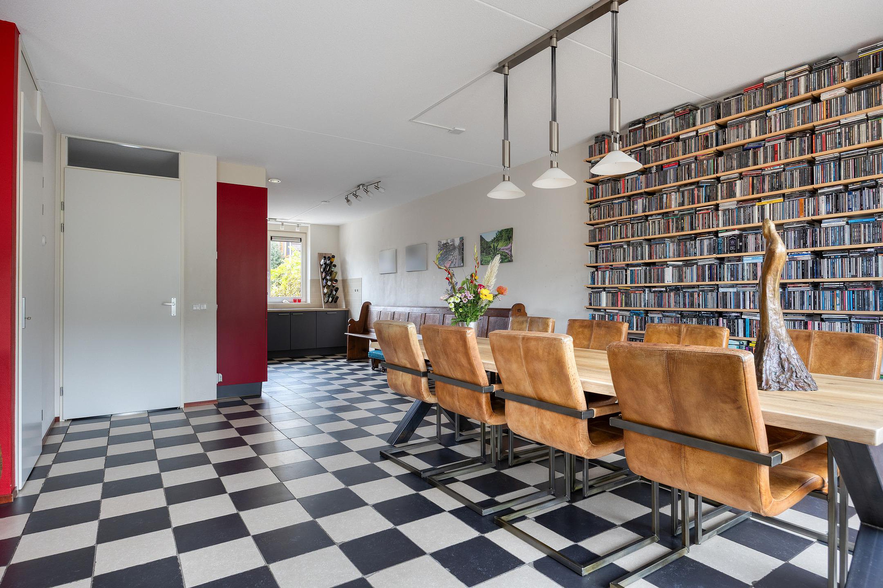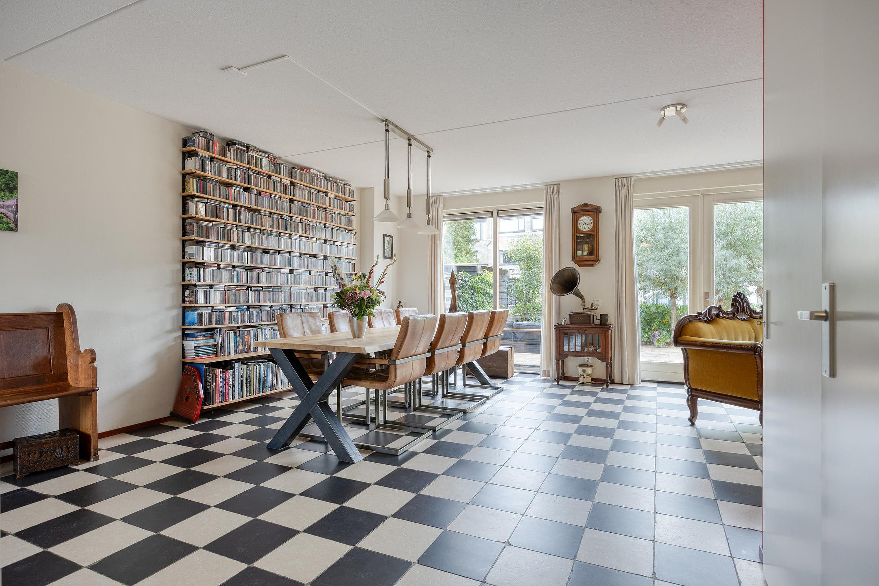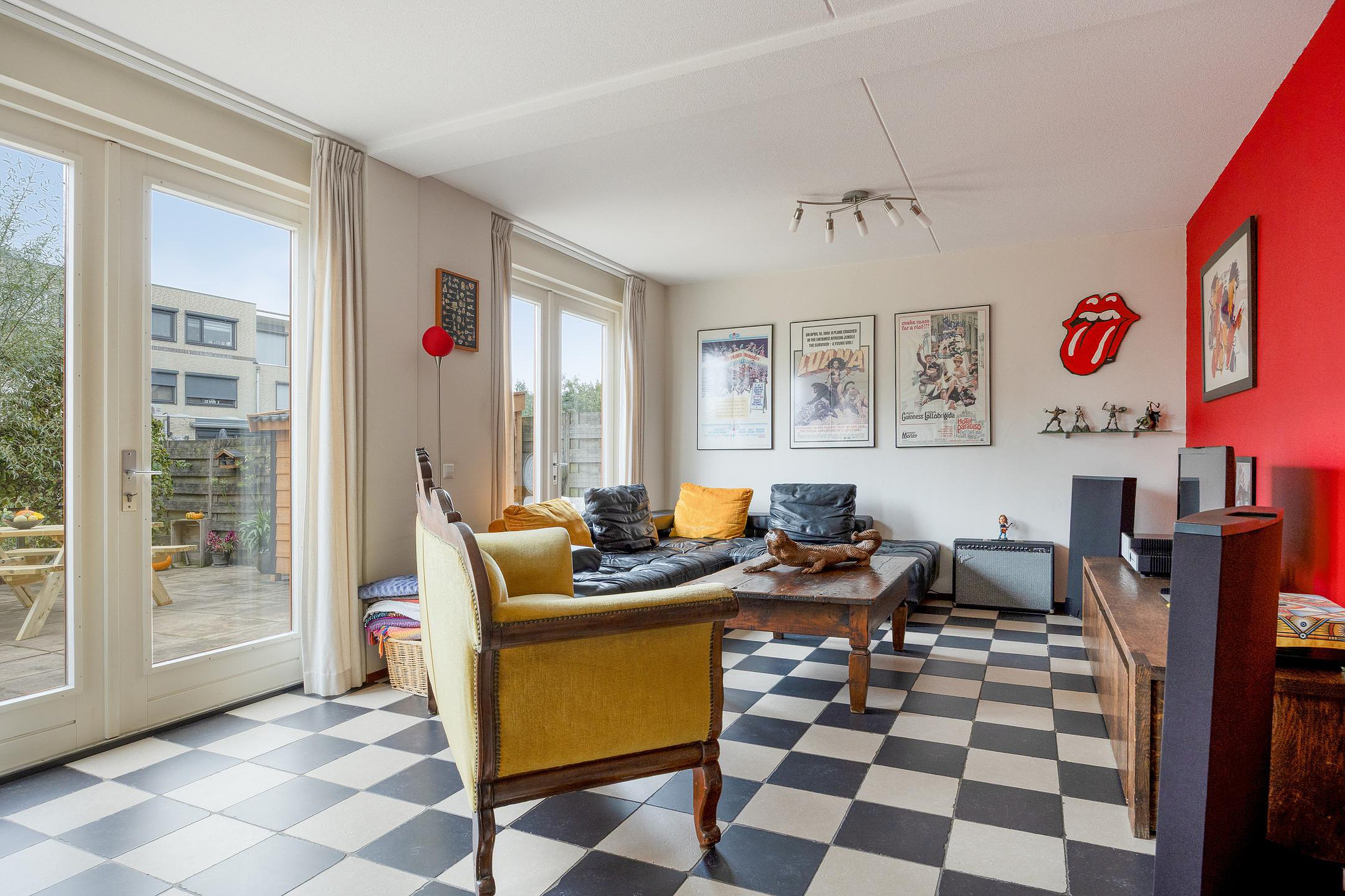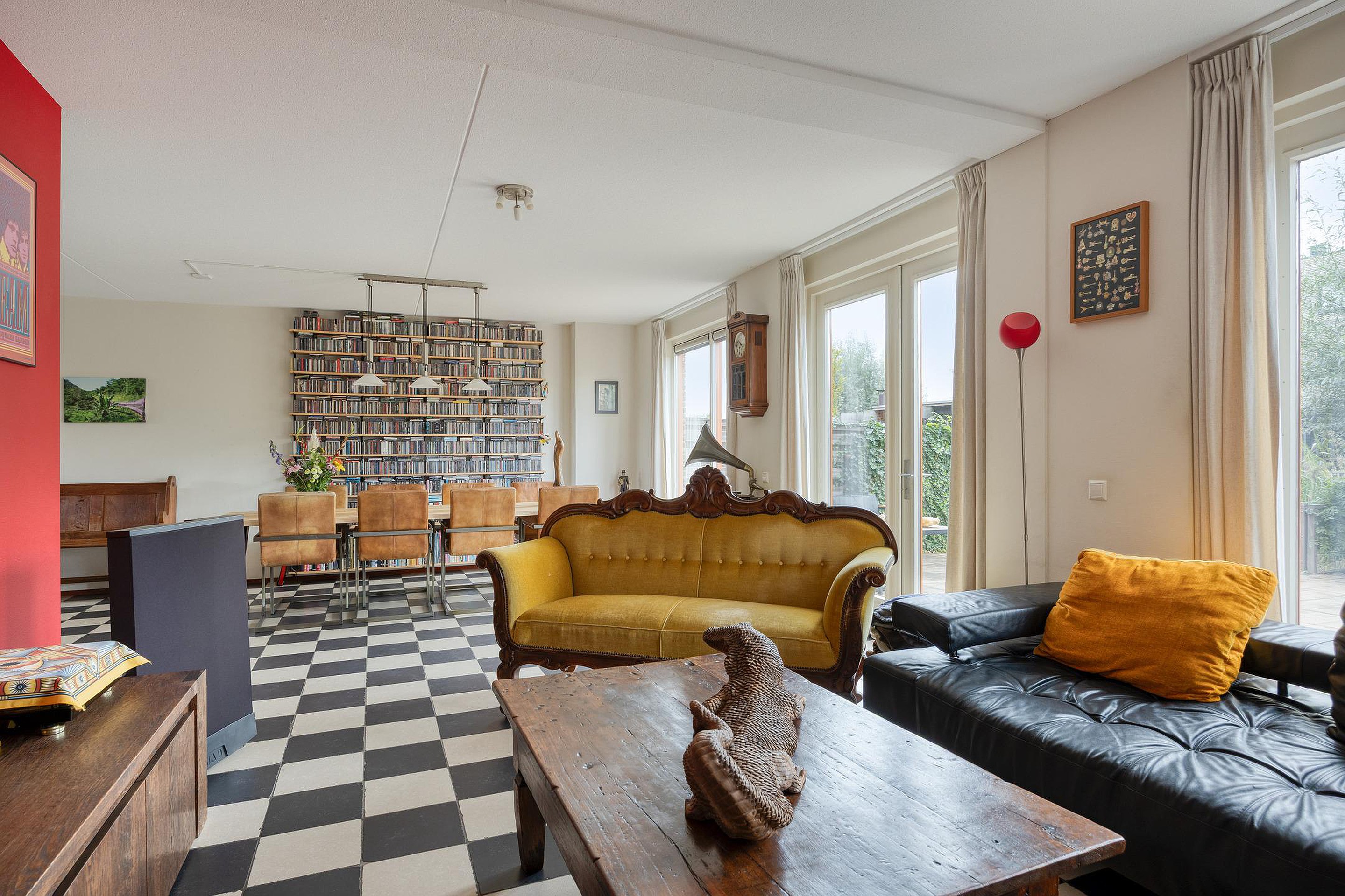 Woonkamer, een royale en tuingerichte woonkamer met dubbele openslaande deuren naar de achtertuin, toegang tot de voorgelegen open keuken en een vaste (trap)kast.
