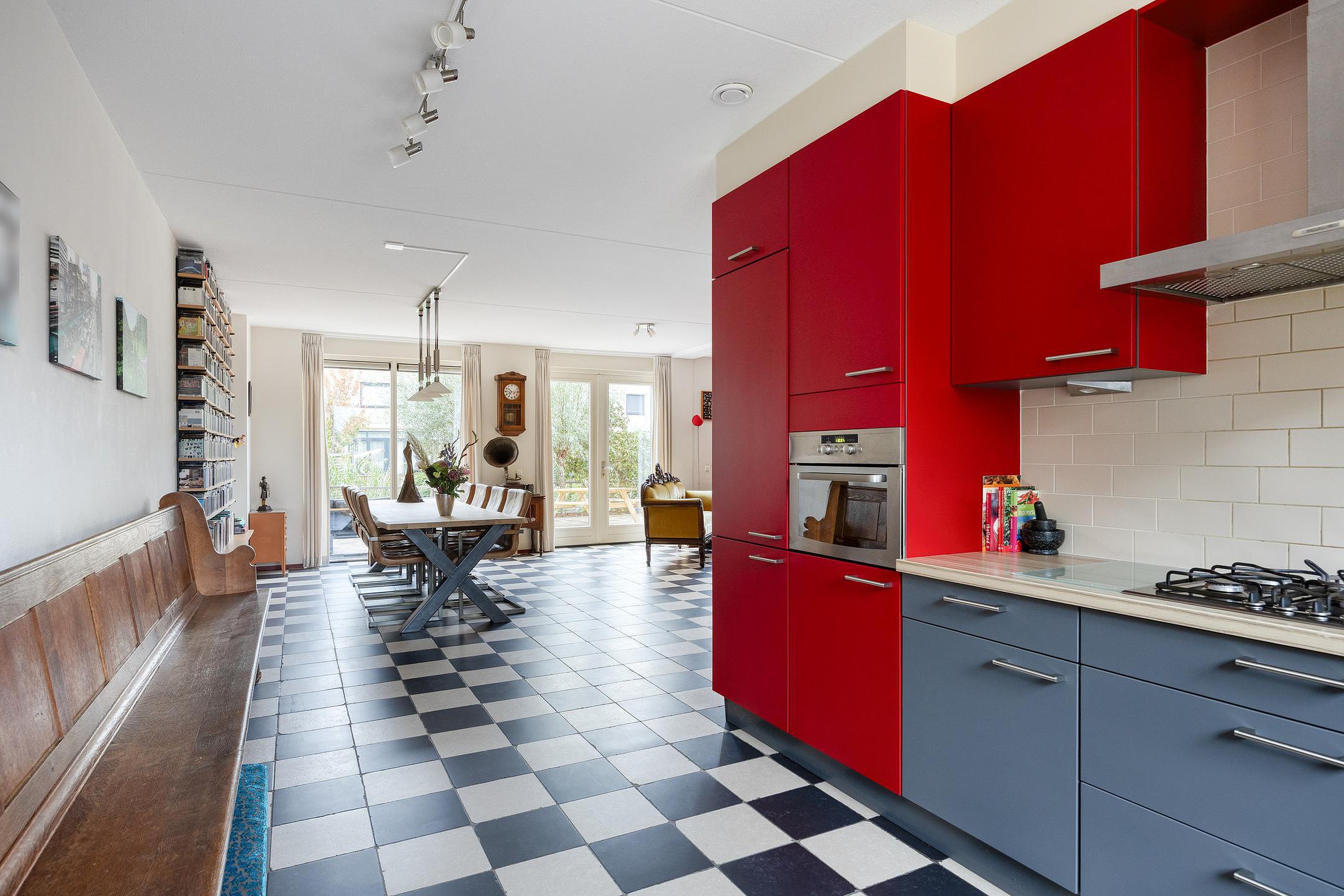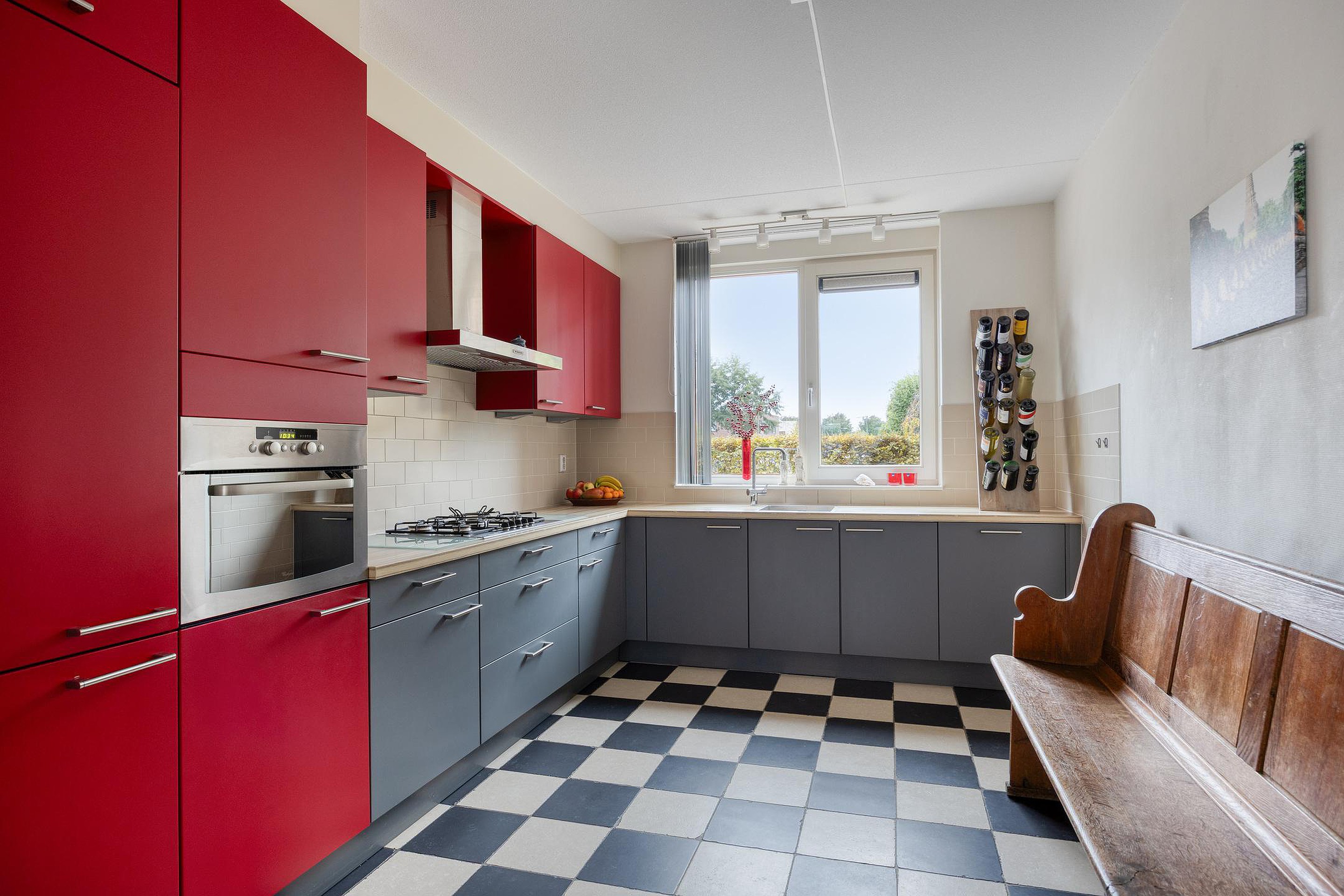 Keuken, een prachtige lichte ruimte met vrij uitzicht de voorgelegen straat in. Voorzien van een keukenblok in L-vormige opstelling met een 5-pits gaskookplaat, RVS afzuigkap, combimagnetron, vaatwasser en een koel/vriescombinatie.