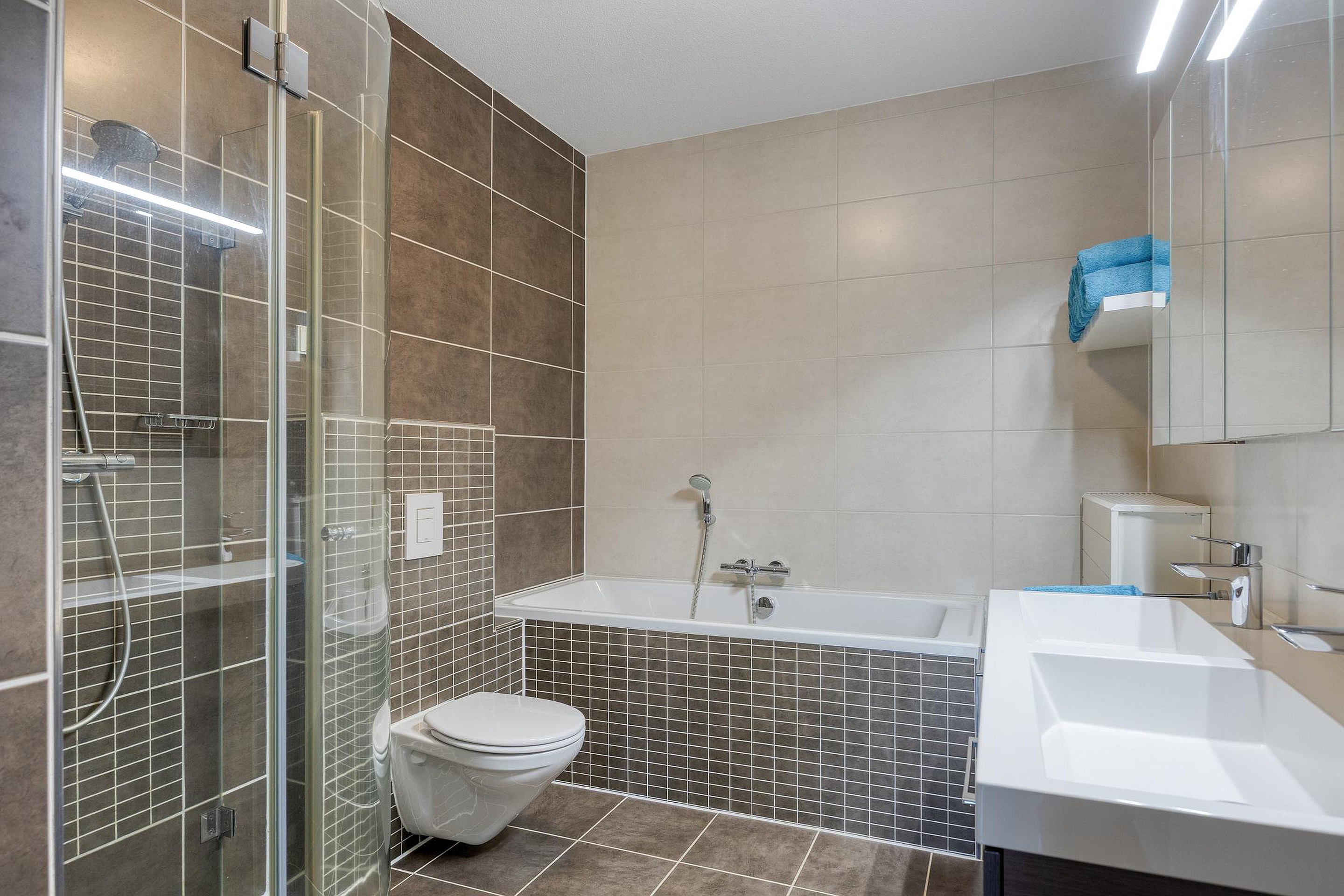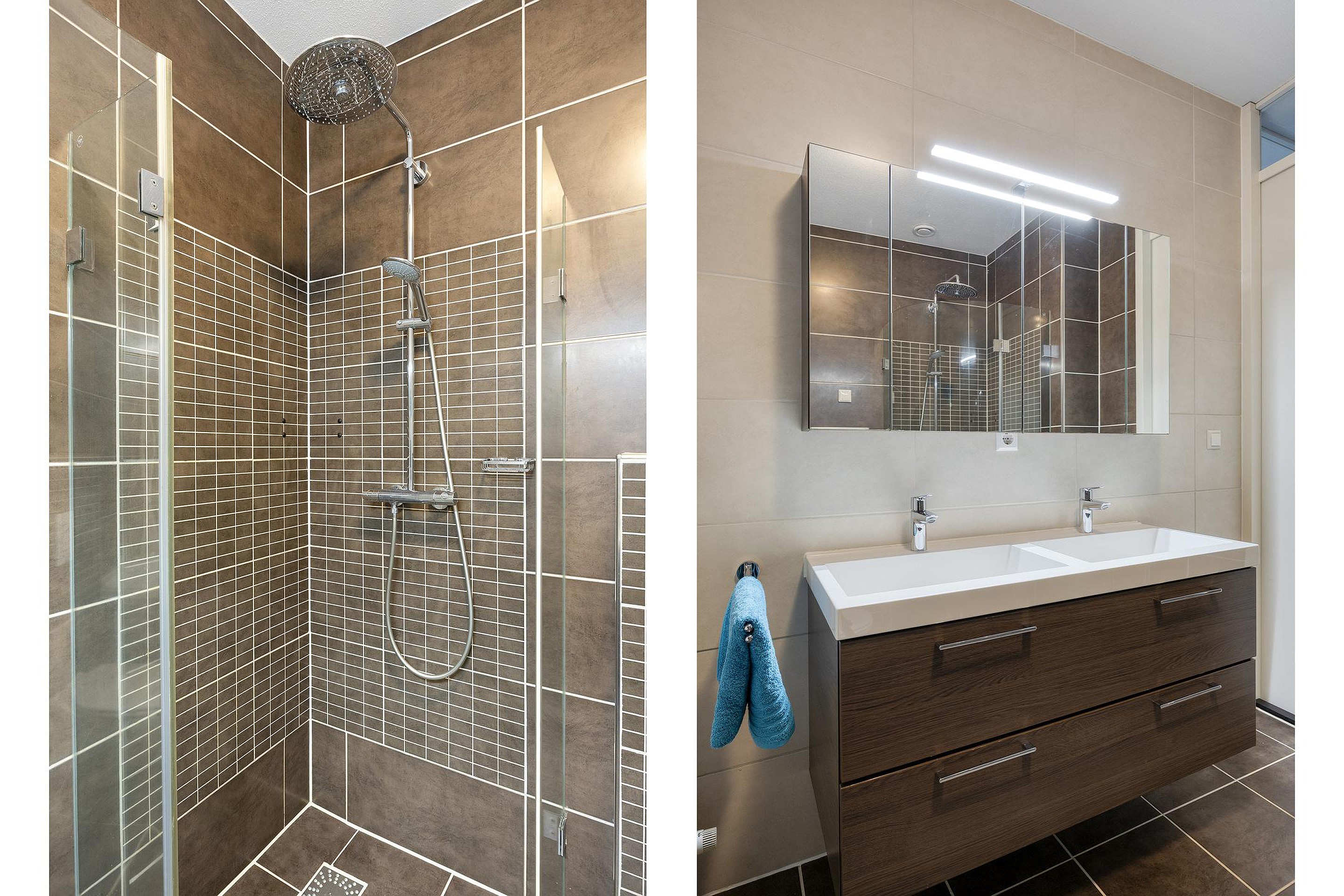 Badkamer, geheel betegelde royale ruimte en voorzien van een douche met thermostaatkraan en rainshower, een ligbad met thermostaatkraan, een tweede toilet (hangend closet) en een dubbele wastafel met onderladen en een spiegelkast.