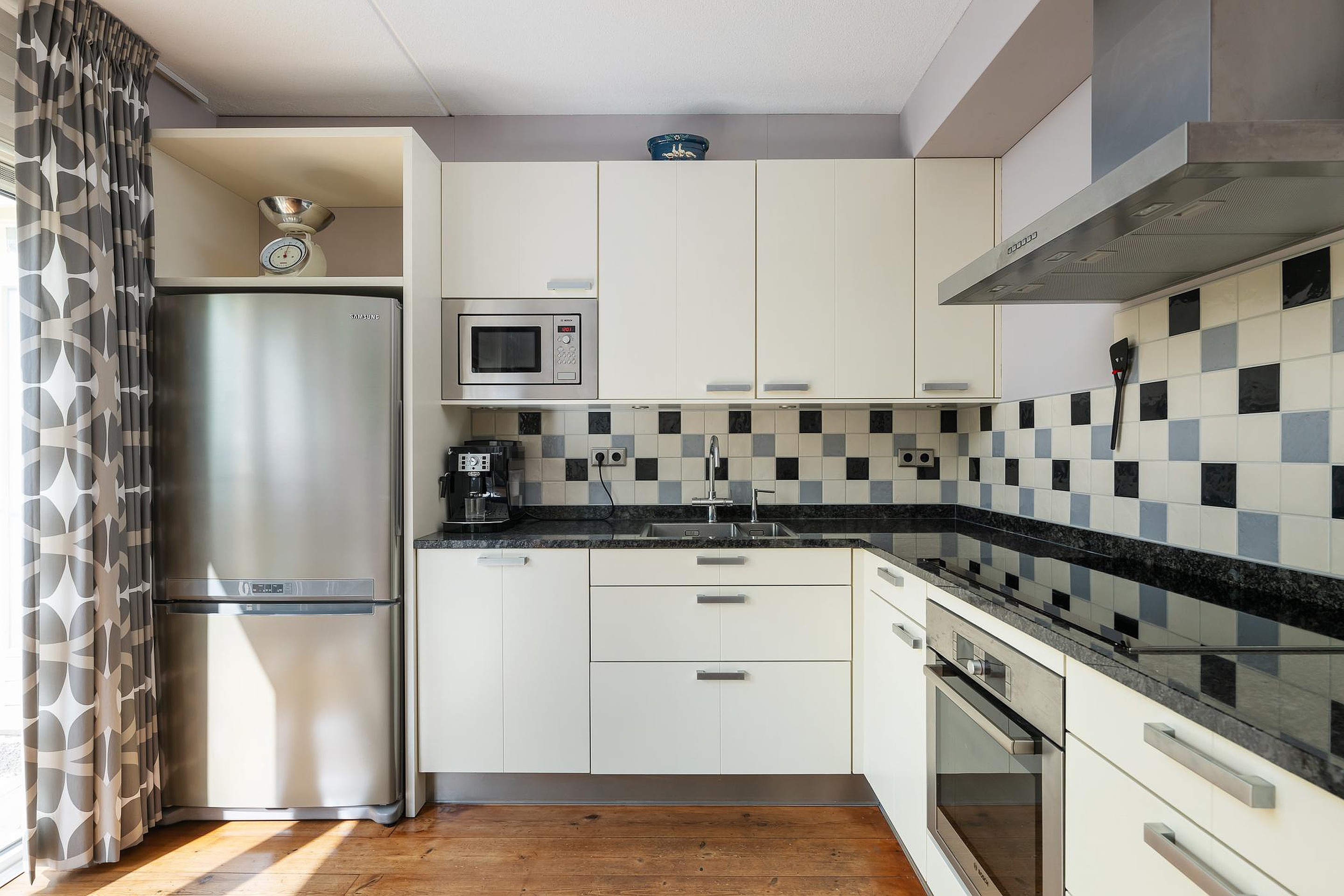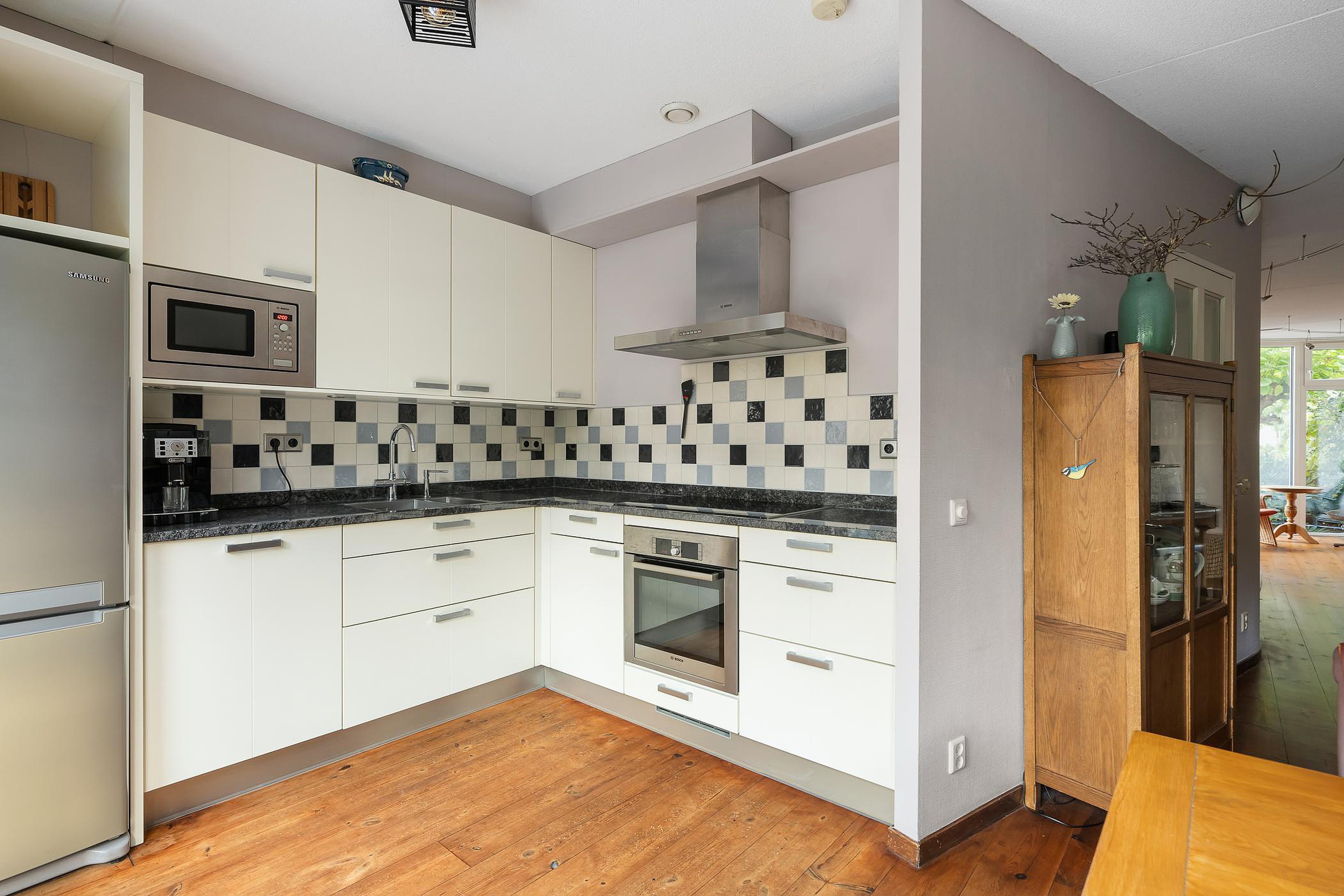 Aan de achterzijde bevindt zich de keuken met eetgedeelte, waar binnen en buiten naadloos in elkaar overlopen dankzij de openslaande deuren naar de tuin. De keuken is compleet uitgerust met onder andere een oven, magnetron, vaatwasser, 5-pits inductiekookplaat met afzuiging en een granieten werkblad. De gehele begane grond is afgewerkt met een houten vloer.