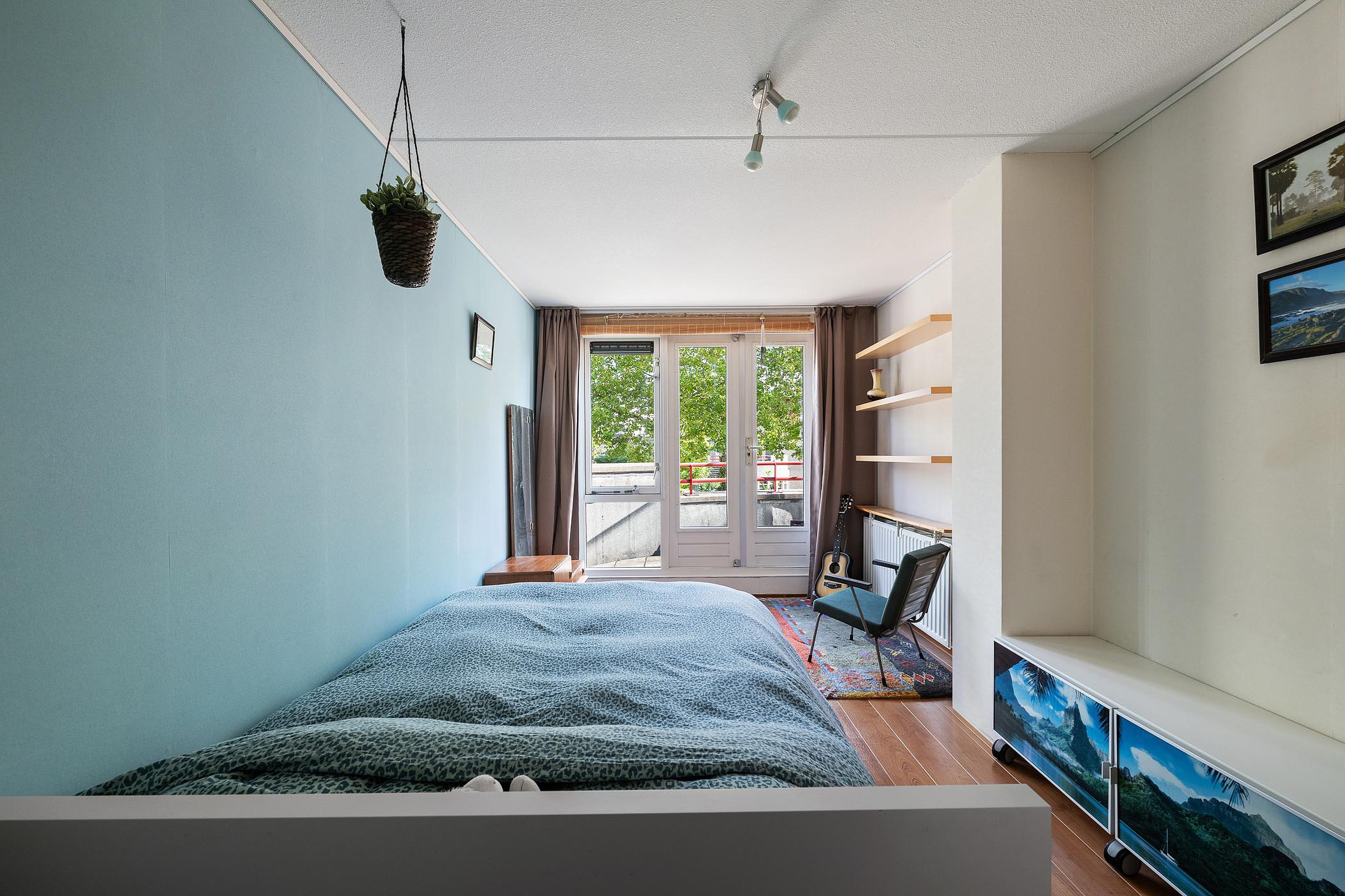 Eerste verdieping Op de eerste verdieping vindt u een ruime overloop met vaste kast. Aan de voorzijde liggen twee ruime slaapkamers, waarvan één met extra zijraam en de andere met een vaste kast en toegang tot het balkon. Daarnaast is er een badkamer met toilet, douchecabine en wastafel.