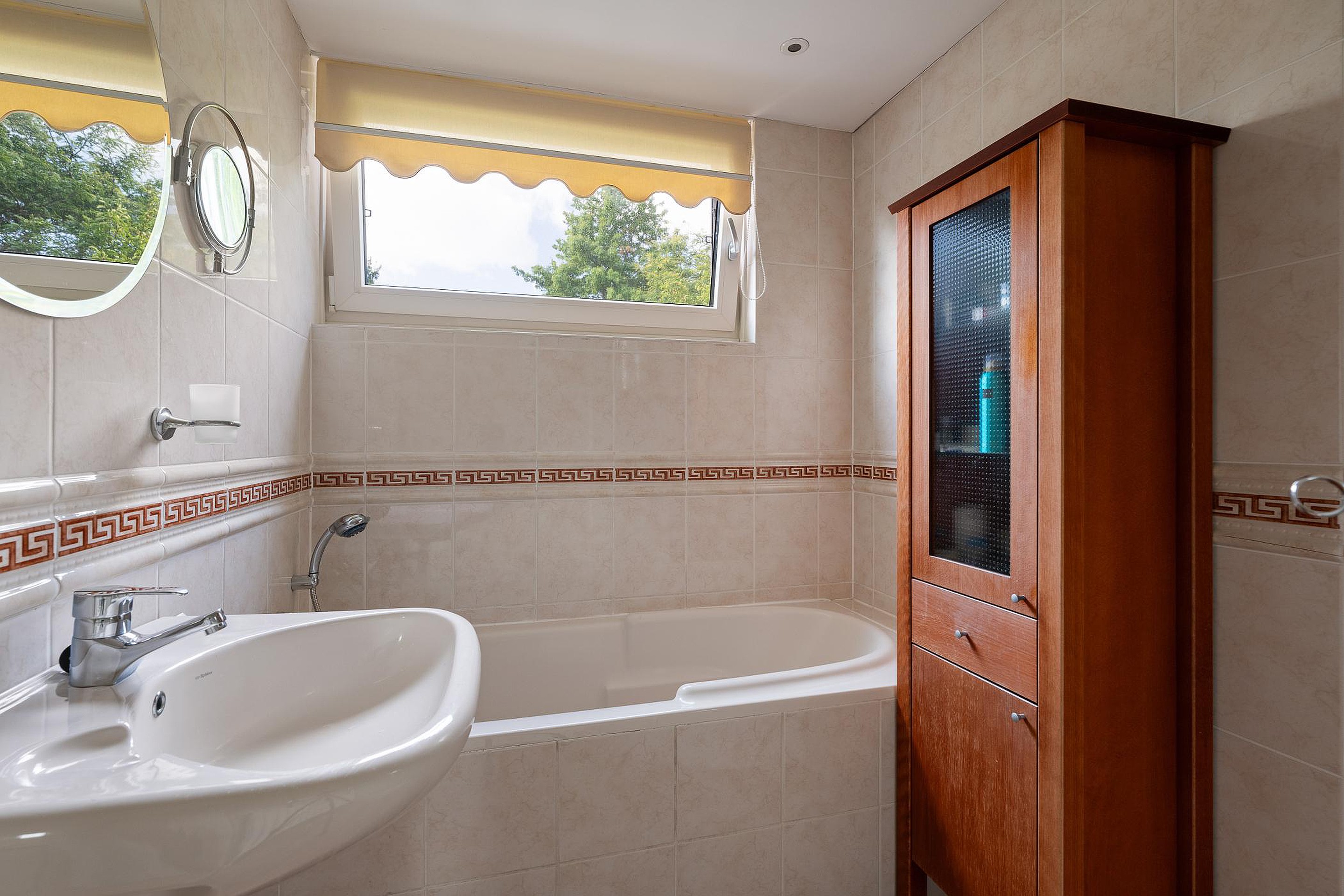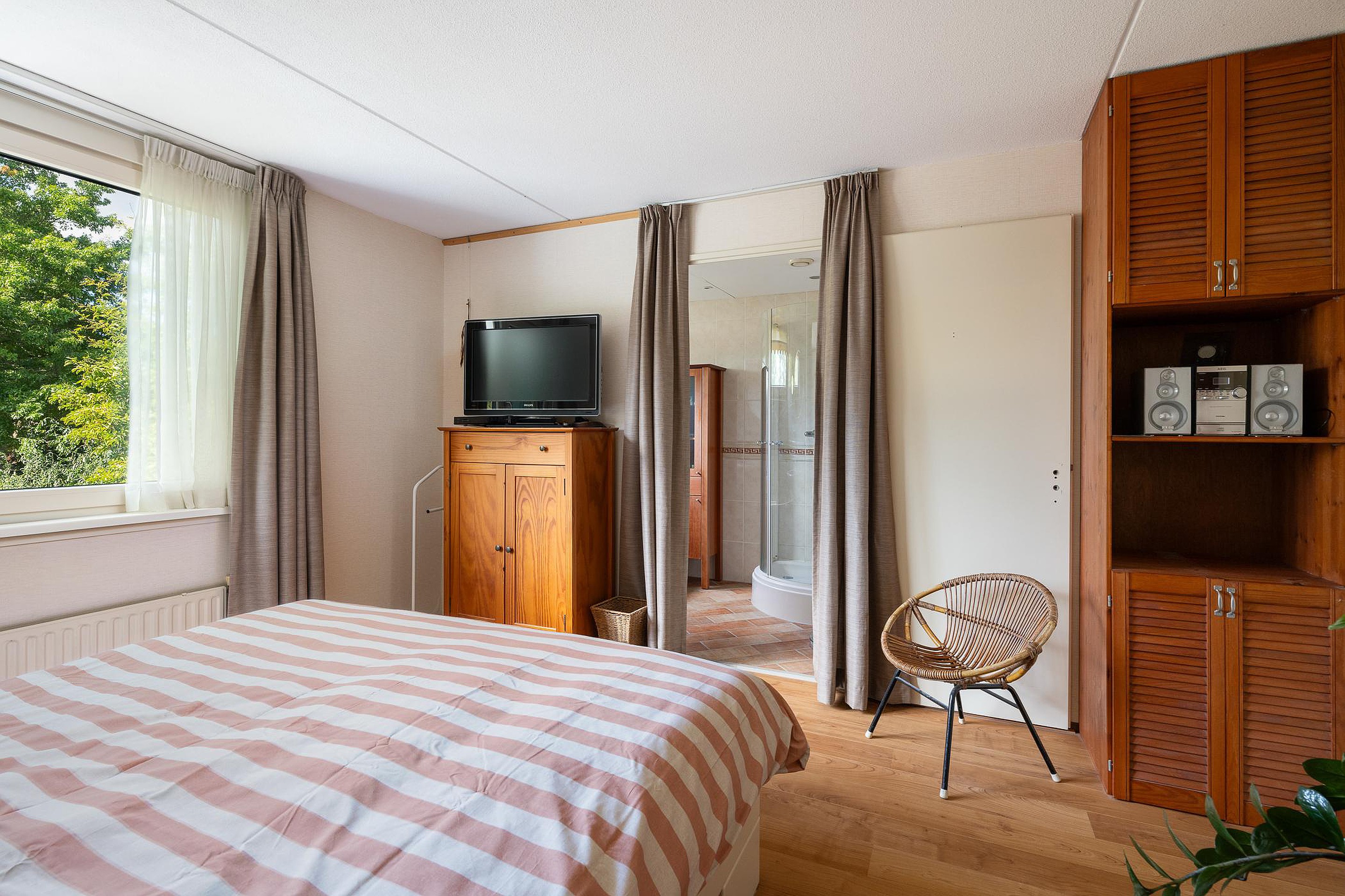 Aan de achterzijde bevindt zich de derde slaapkamer met directe toegang tot een tweede badkamer, voorzien van ligbad, douchecabine en wastafel.