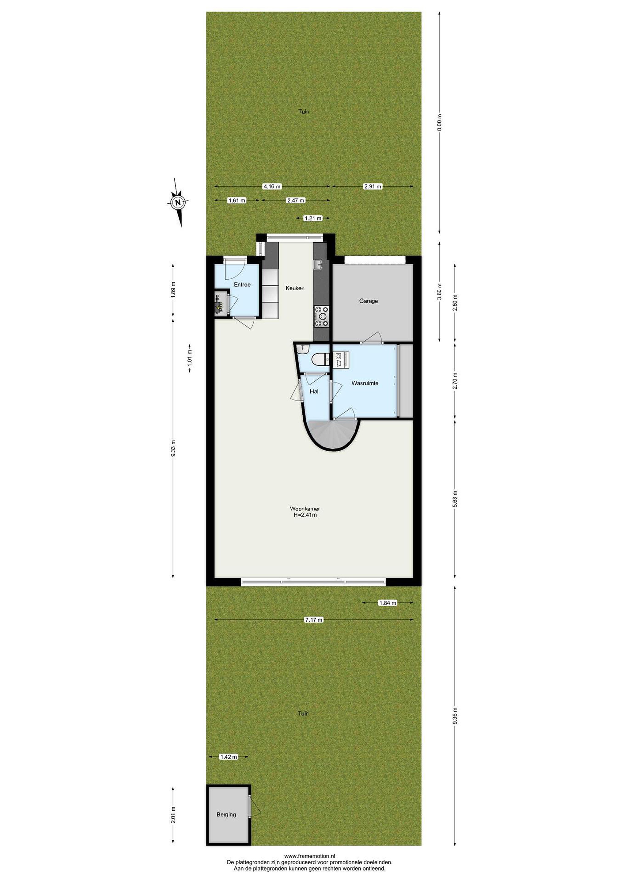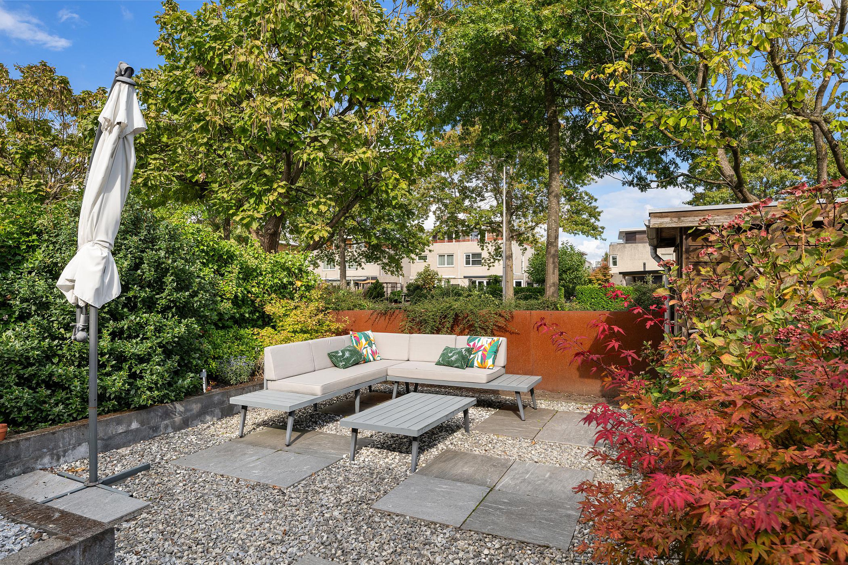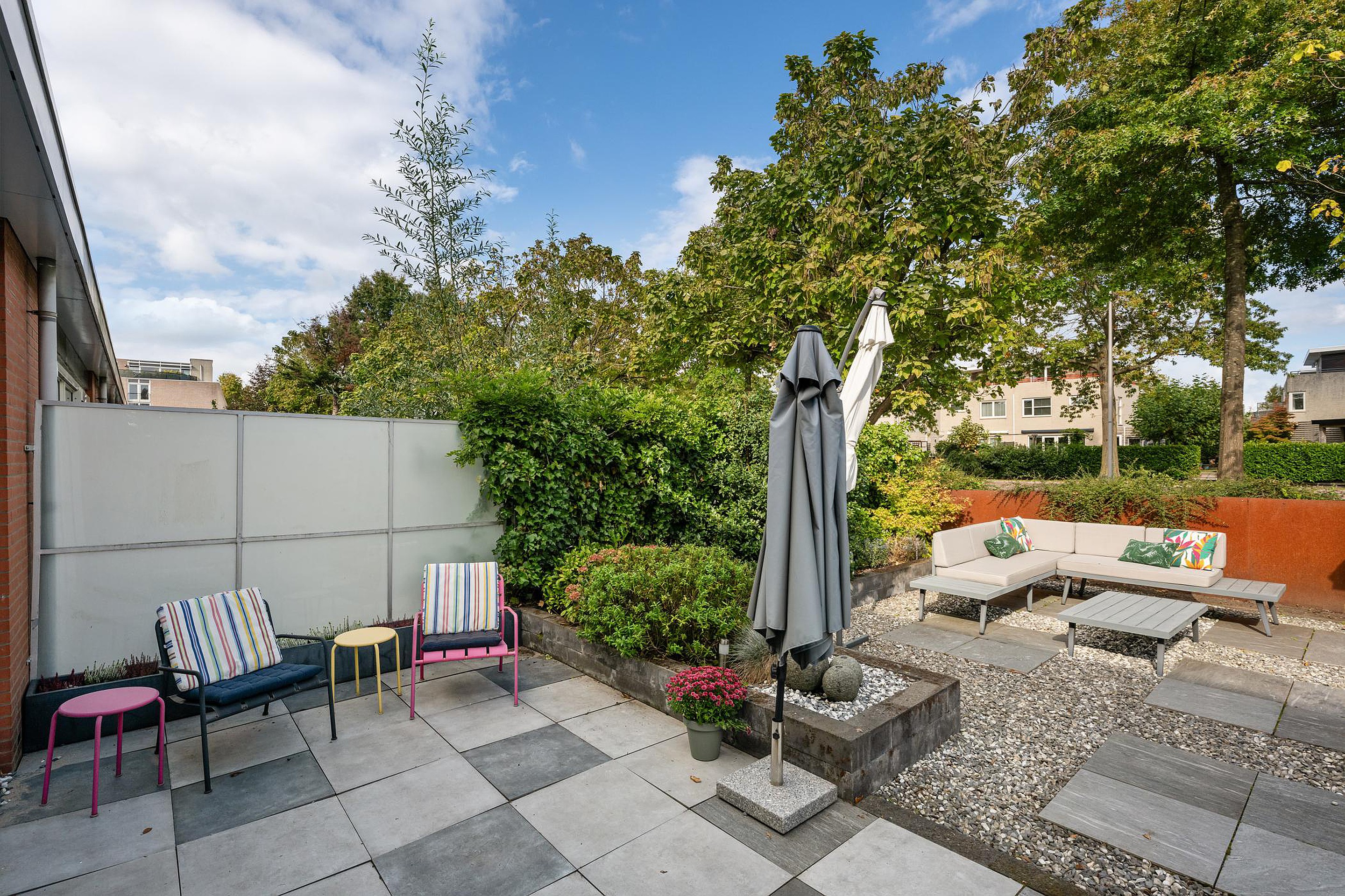 De tuin is 9 meter lang en 7 meter breed en is gesitueerd op het noordoosten.